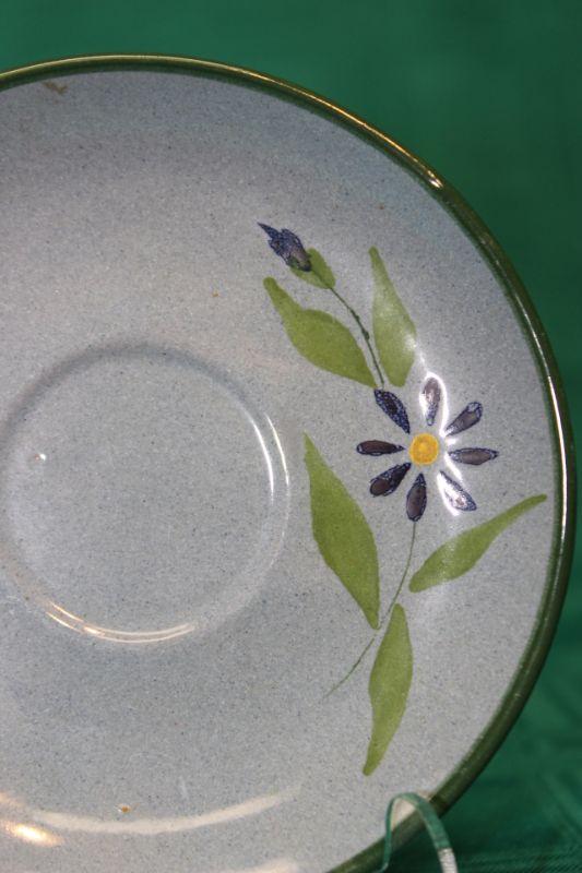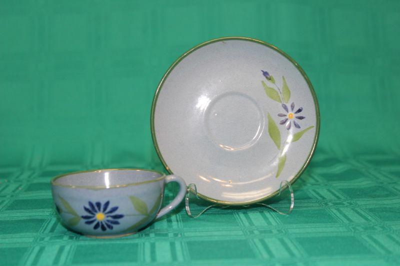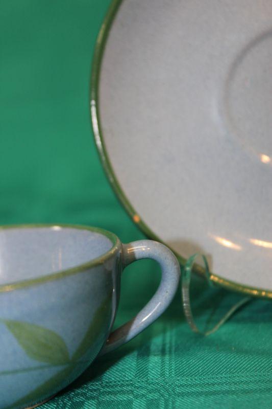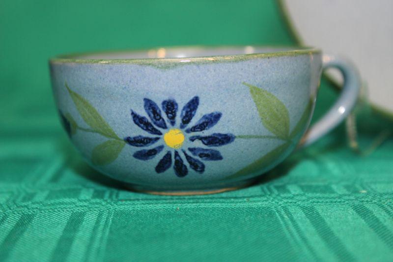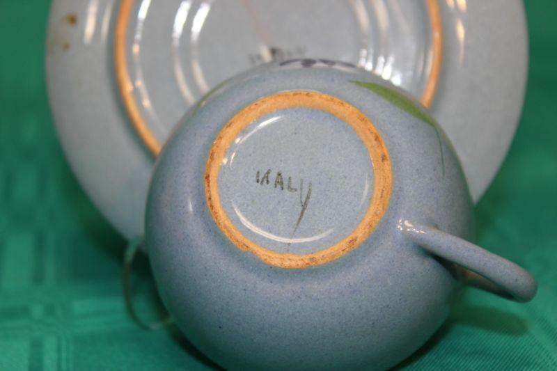 Pale blue tea cup and saucer. Blue flower pattern, green accents. Made in Italy. Tiny chip/ defect in the edge of saucer.