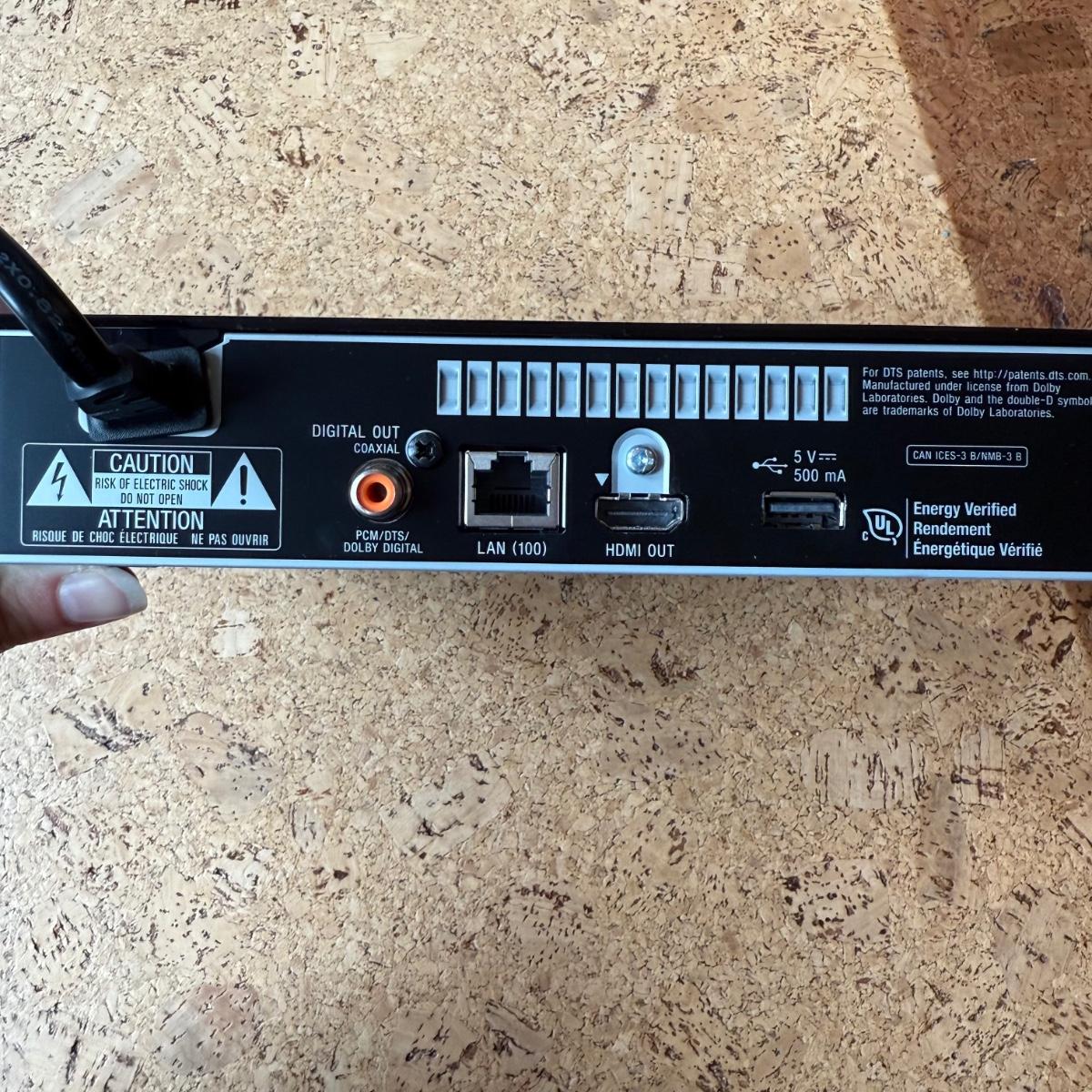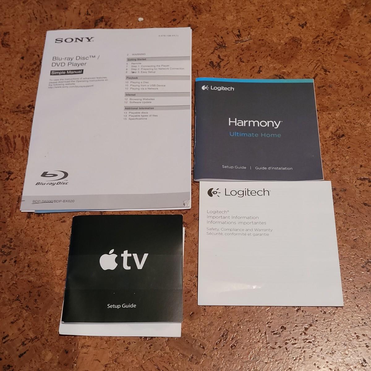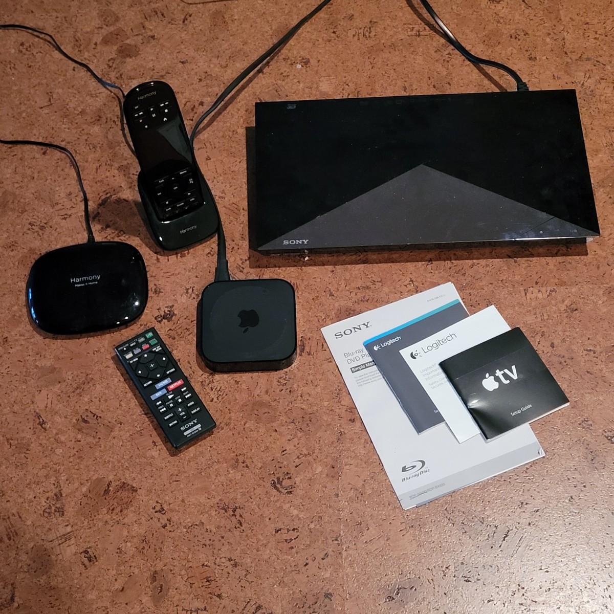 This lot includes a Sony blue ray player, an Apple t.v. box, and a Harmony universal remote. The blue ray player includes power cord and remote. Apple t.v. includes power cord. Harmony remote includes hub, remote, charging station, and all power cords. Original paperwork is provided for all devices. Everything was in use leading up to sale and powers on.
