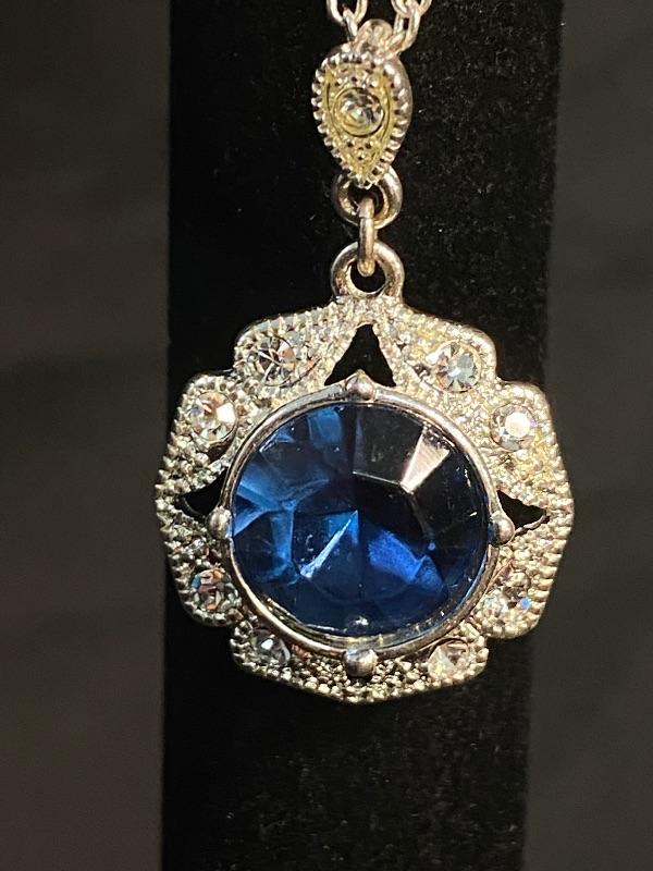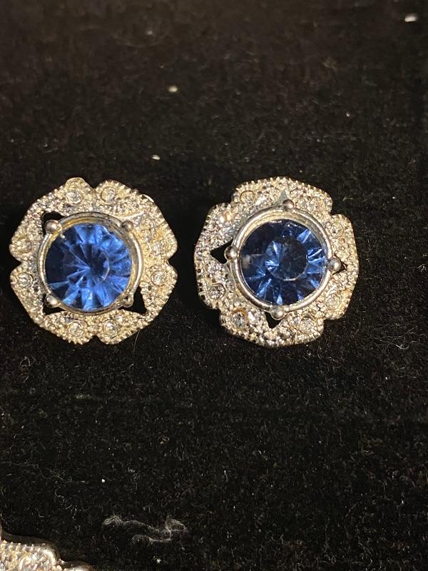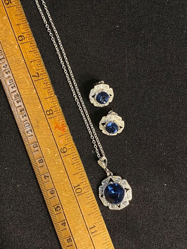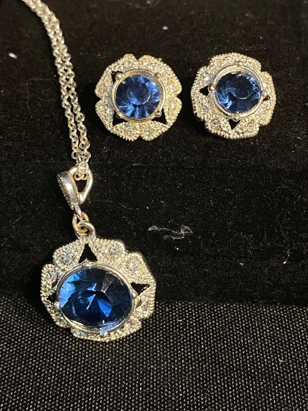 Stunning royal blue rhinestone pendant necklace with matching earrings. Silvertone settings. Clear rhinestones around main stone. Earrings are for pierced ears. Previously owned.
