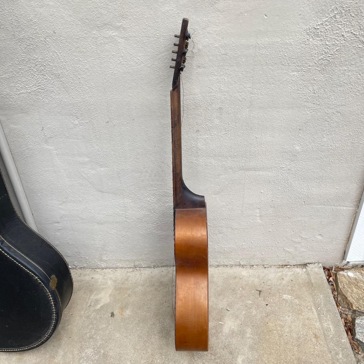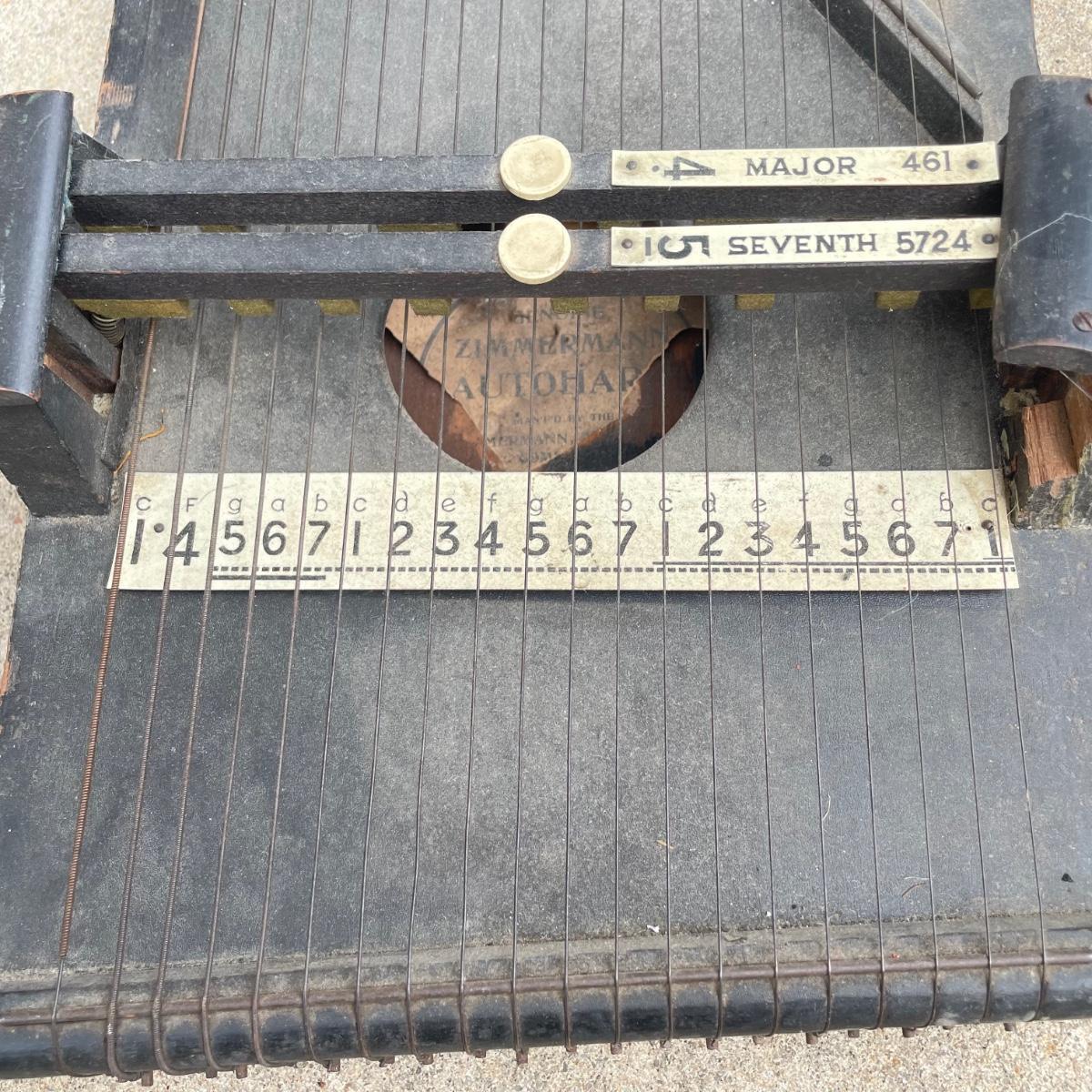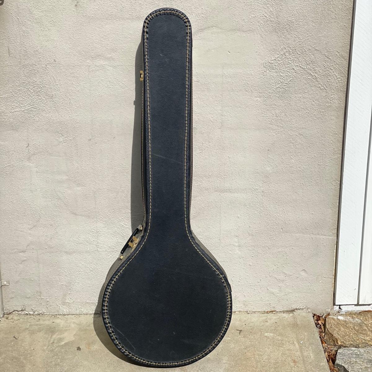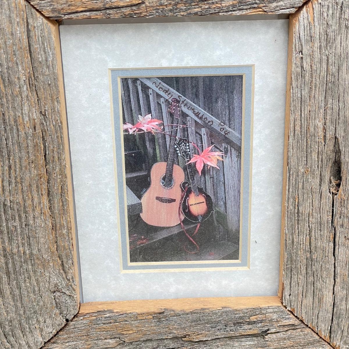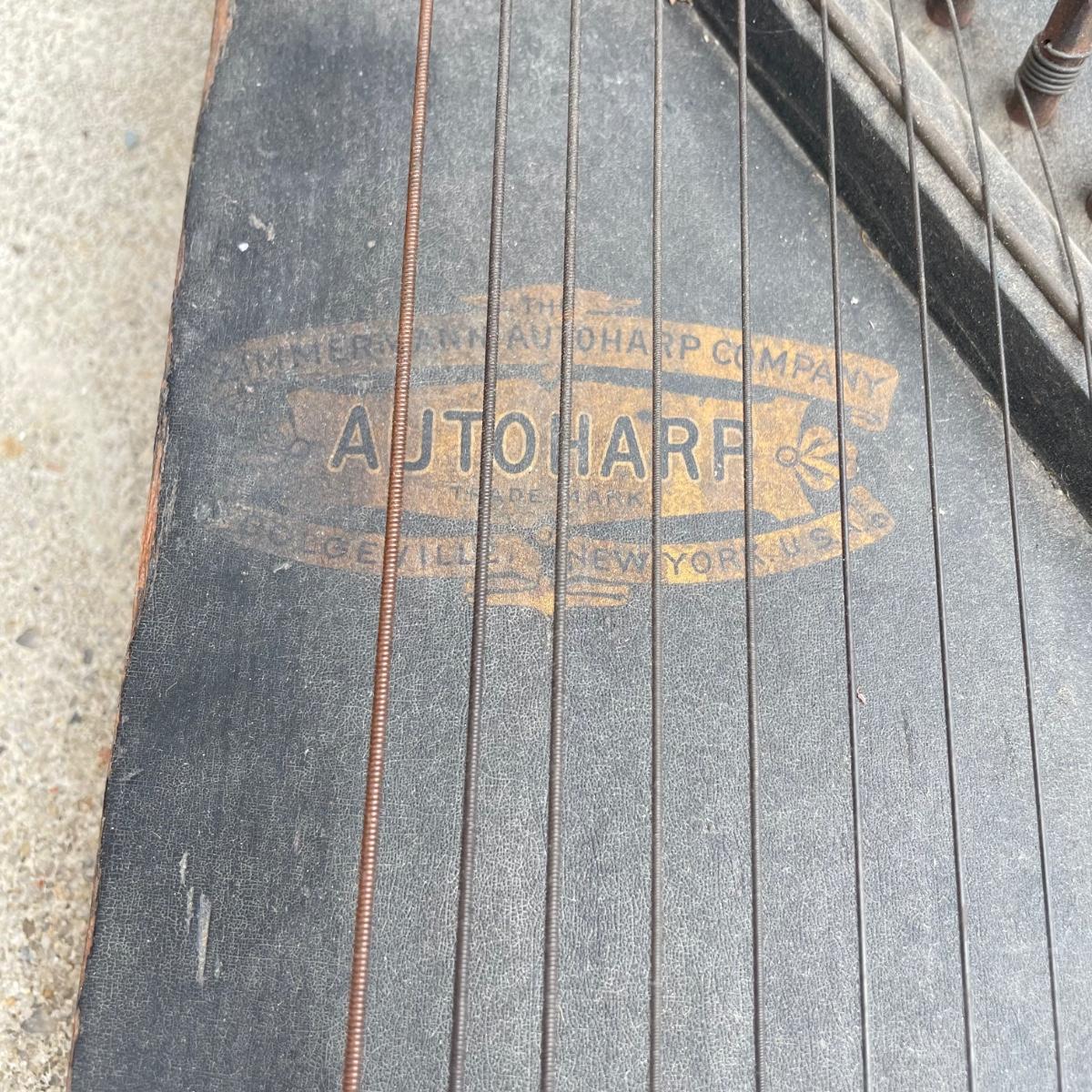 Blue Ridge five string banjo with extra strings and hard case measuring 15” x 40”. Lot also has one vintage Autoharp by Zimmerman Autoharp Company, a handmade in Horse Shoe, NC lovely guitar that appears to have inlay throughout. Two classic music stands, the larger appears to be brass, a stack of 33 1/3 plus two 78s vinyl and a rustic wood framed picture. See images. Shipping available. Please call UPS with dimensions at 828-252-6930 for a shipping quote prior to bidding.