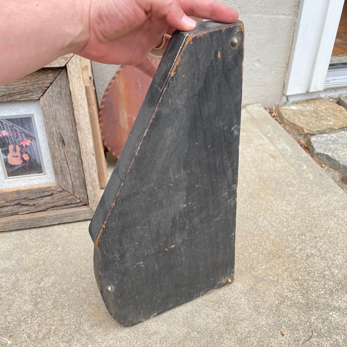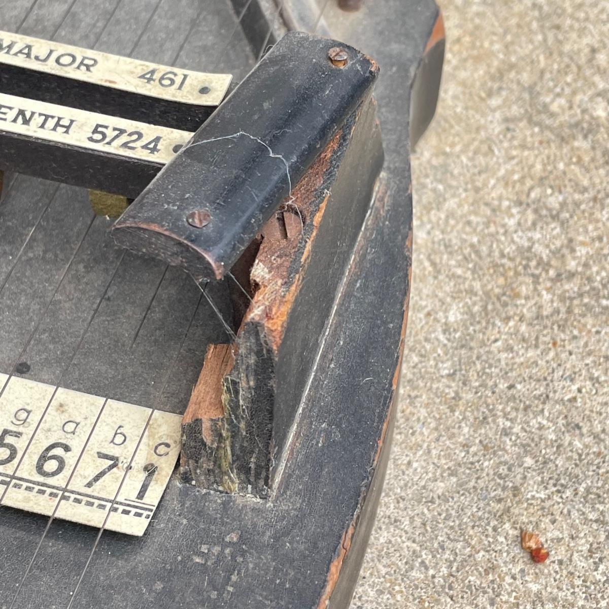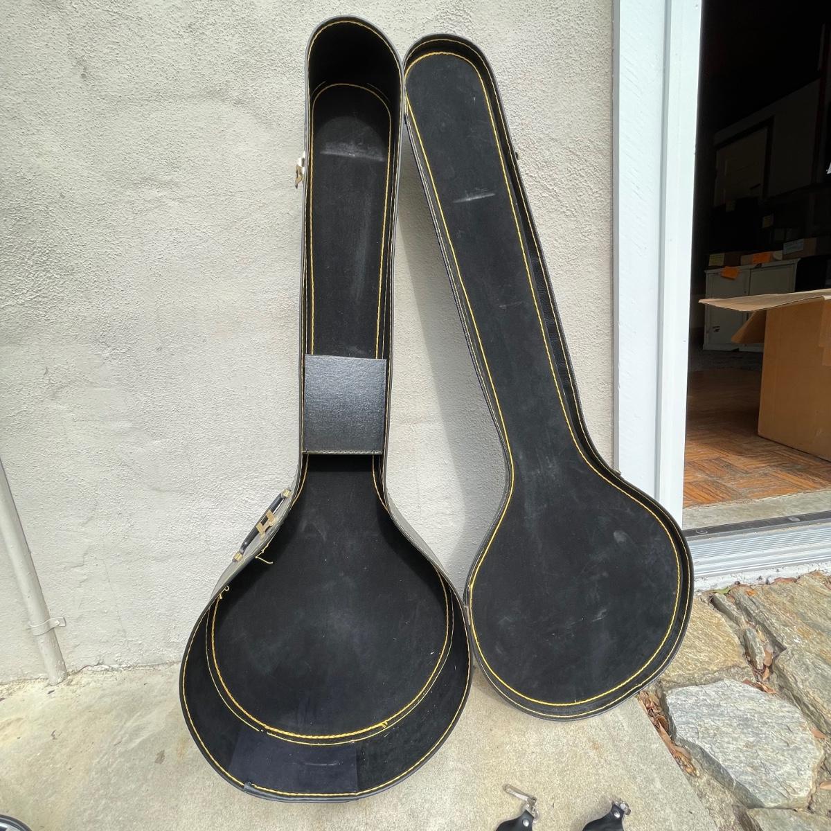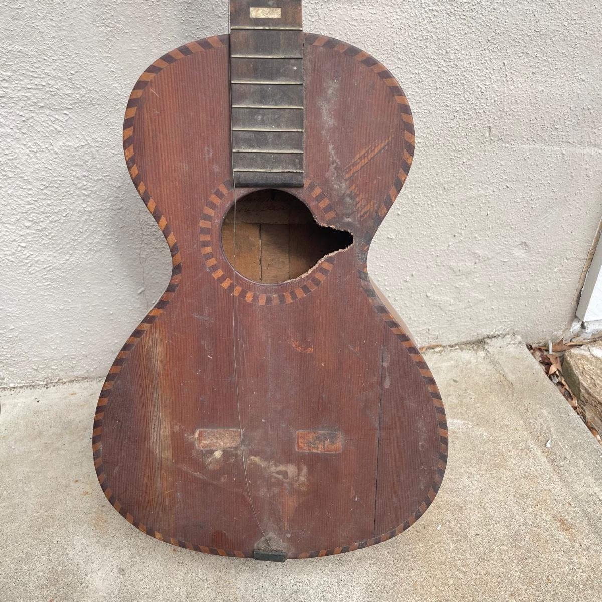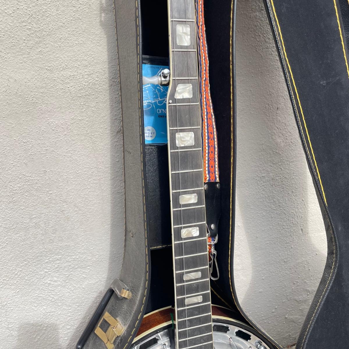 Blue Ridge five string banjo with extra strings and hard case measuring 15” x 40”. Lot also has one vintage Autoharp by Zimmerman Autoharp Company, a handmade in Horse Shoe, NC lovely guitar that appears to have inlay throughout. Two classic music stands, the larger appears to be brass, a stack of 33 1/3 plus two 78s vinyl and a rustic wood framed picture. See images. Shipping available. Please call UPS with dimensions at 828-252-6930 for a shipping quote prior to bidding.