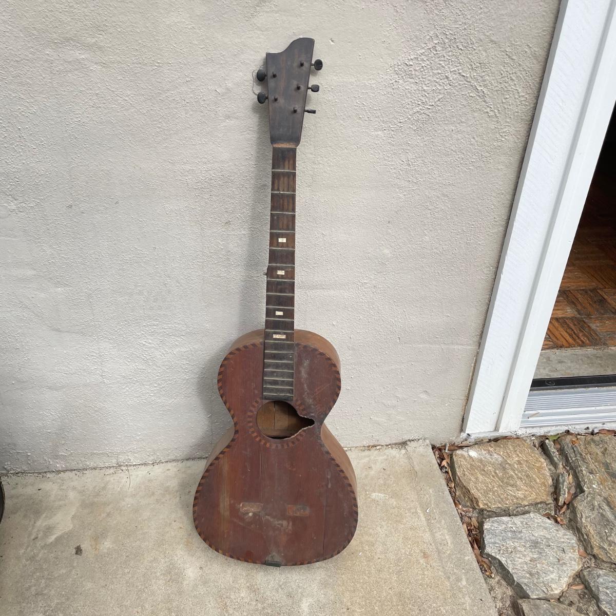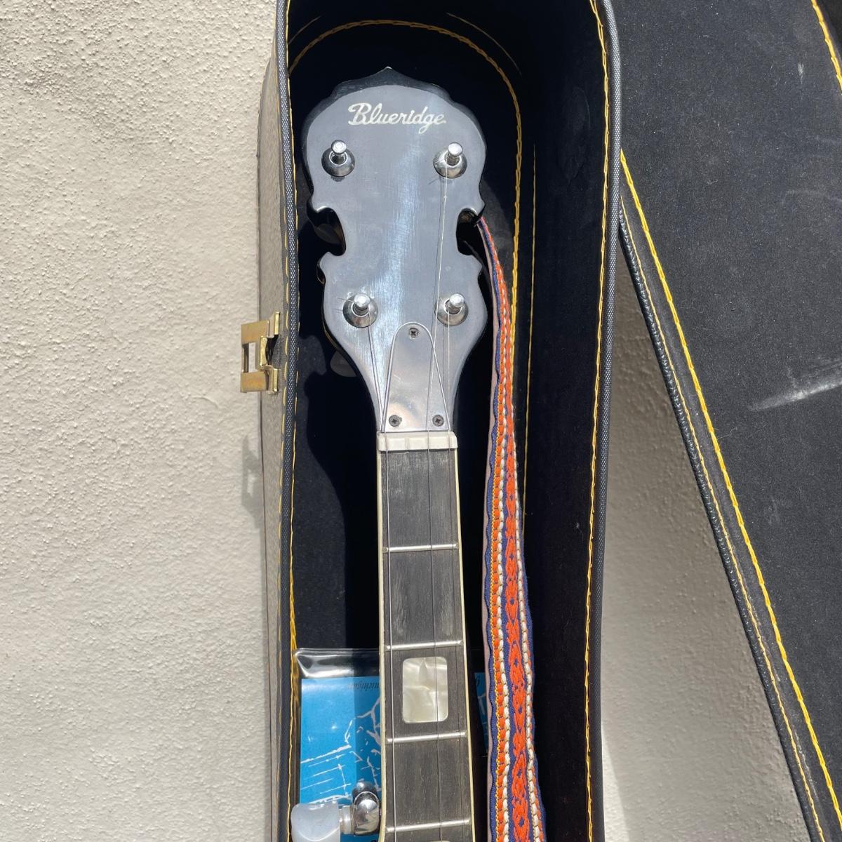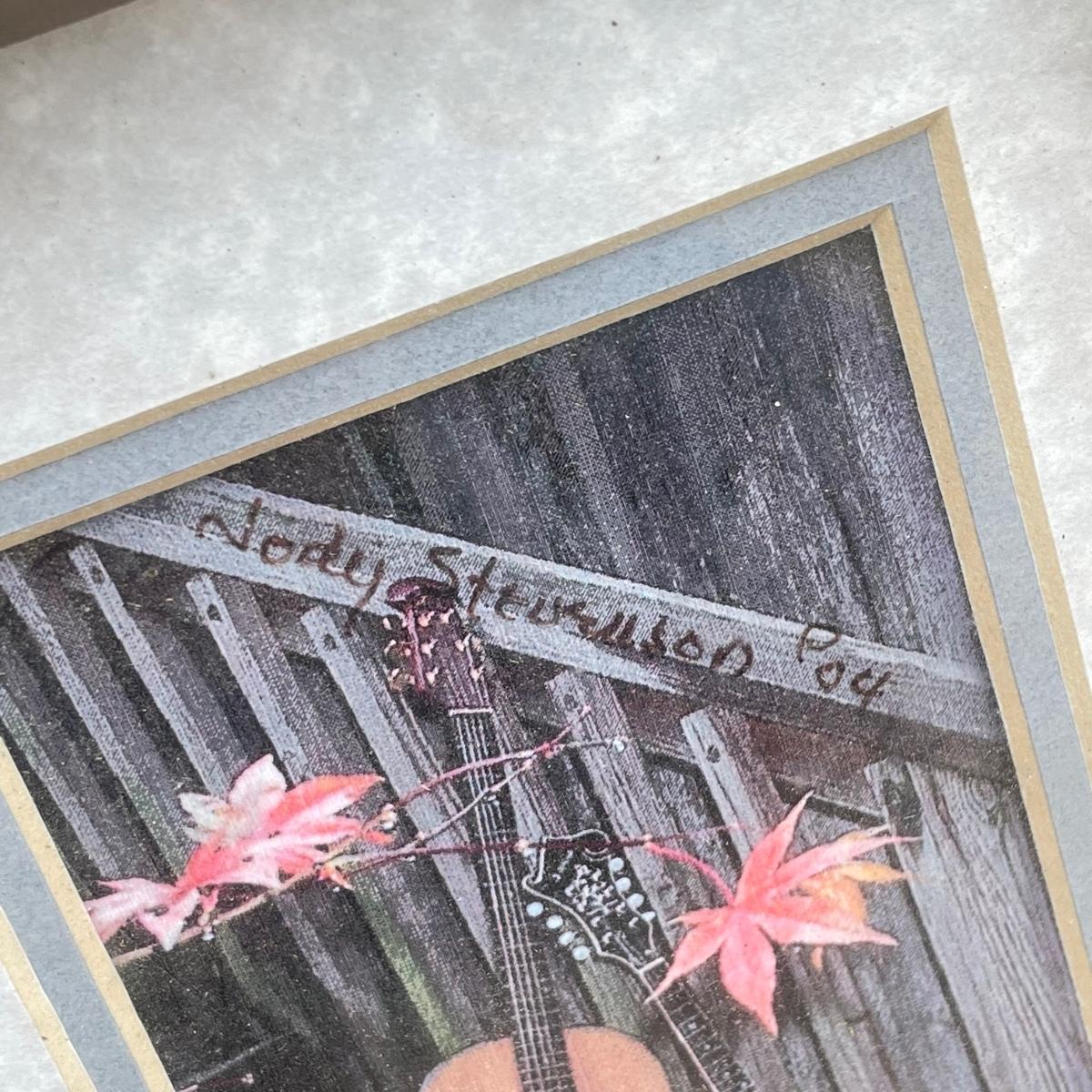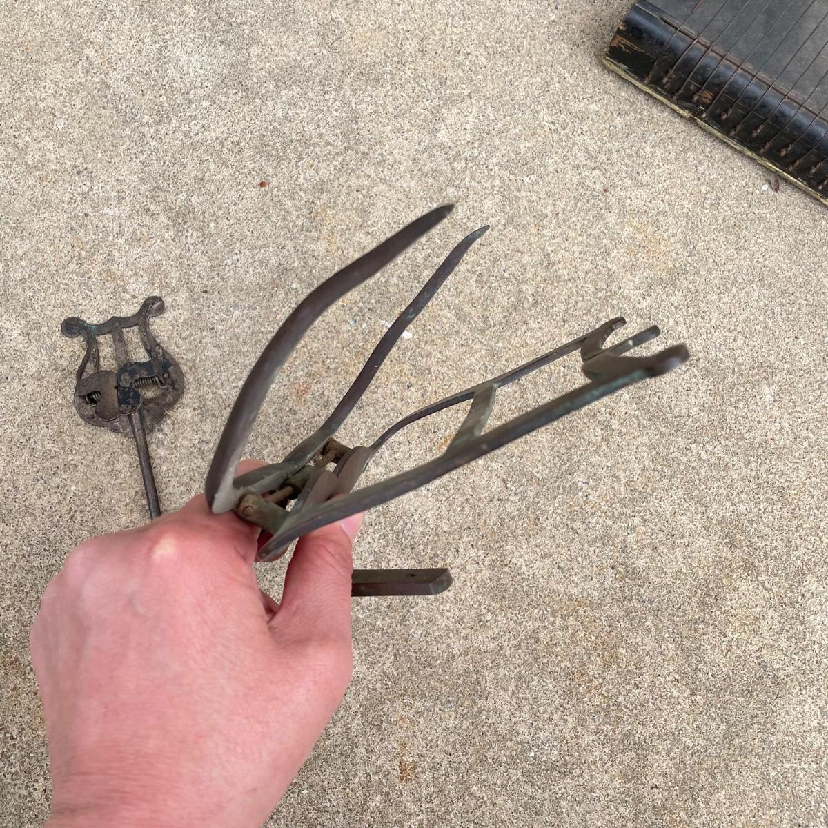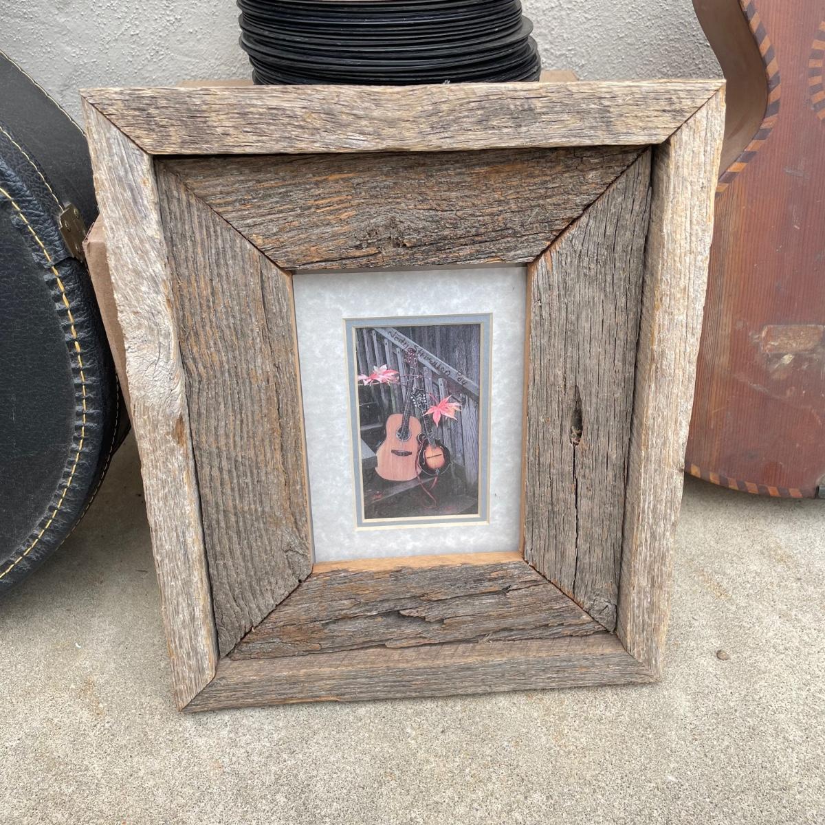Blue Ridge five string banjo with extra strings and hard case measuring 15” x 40”. Lot also has one vintage Autoharp by Zimmerman Autoharp Company, a handmade in Horse Shoe, NC lovely guitar that appears to have inlay throughout. Two classic music stands, the larger appears to be brass, a stack of 33 1/3 plus two 78s vinyl and a rustic wood framed picture. See images. Shipping available. Please call UPS with dimensions at 828-252-6930 for a shipping quote prior to bidding.