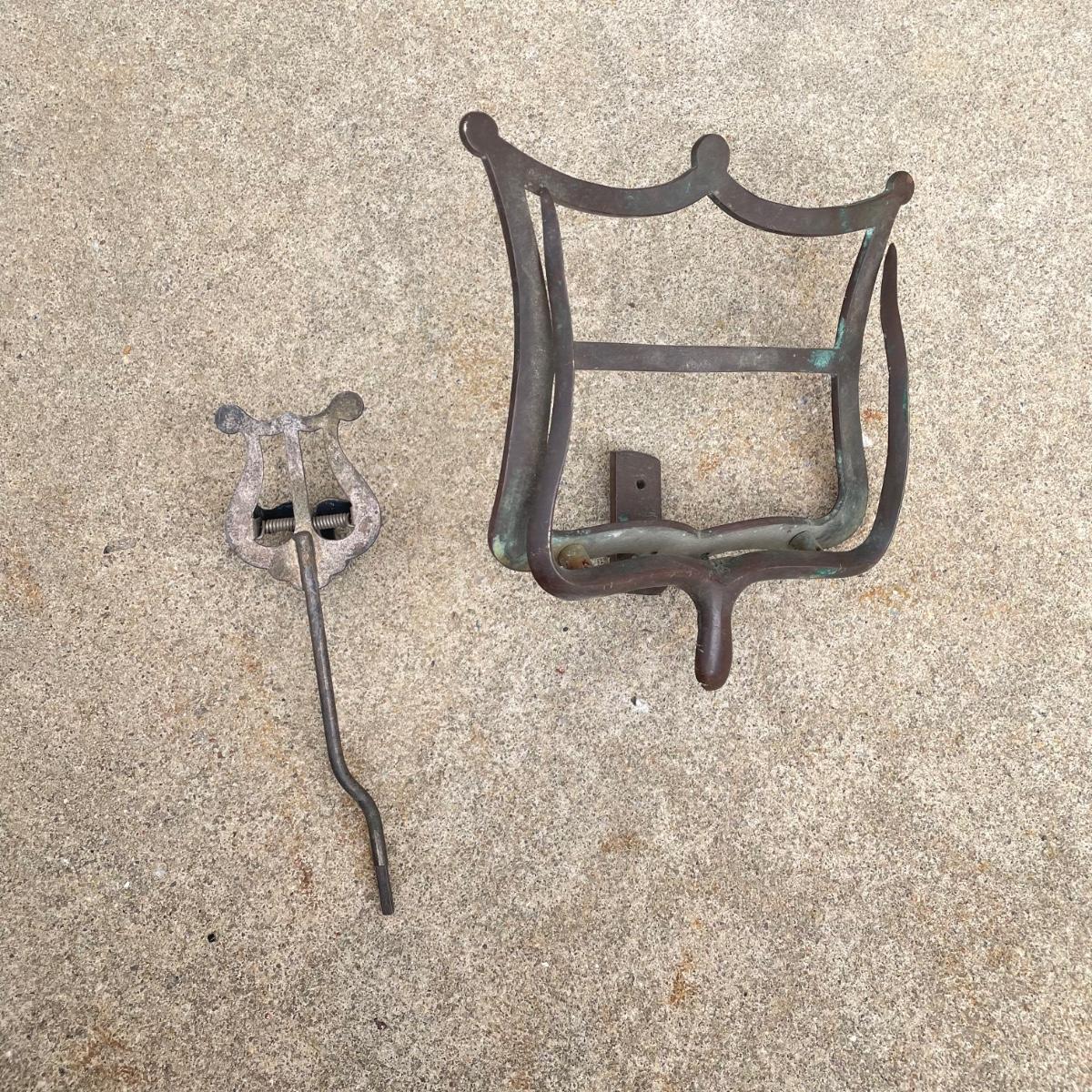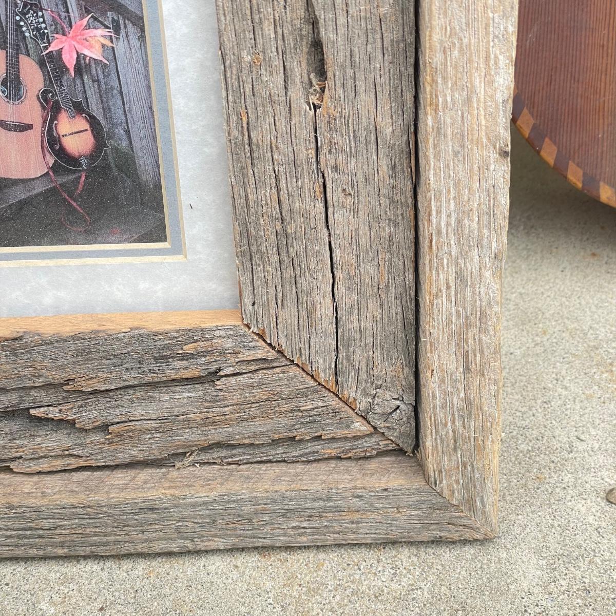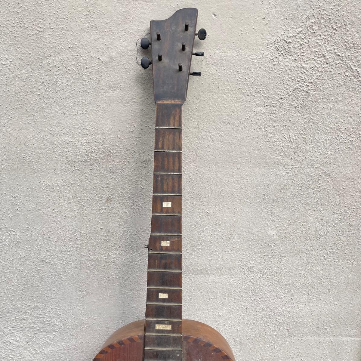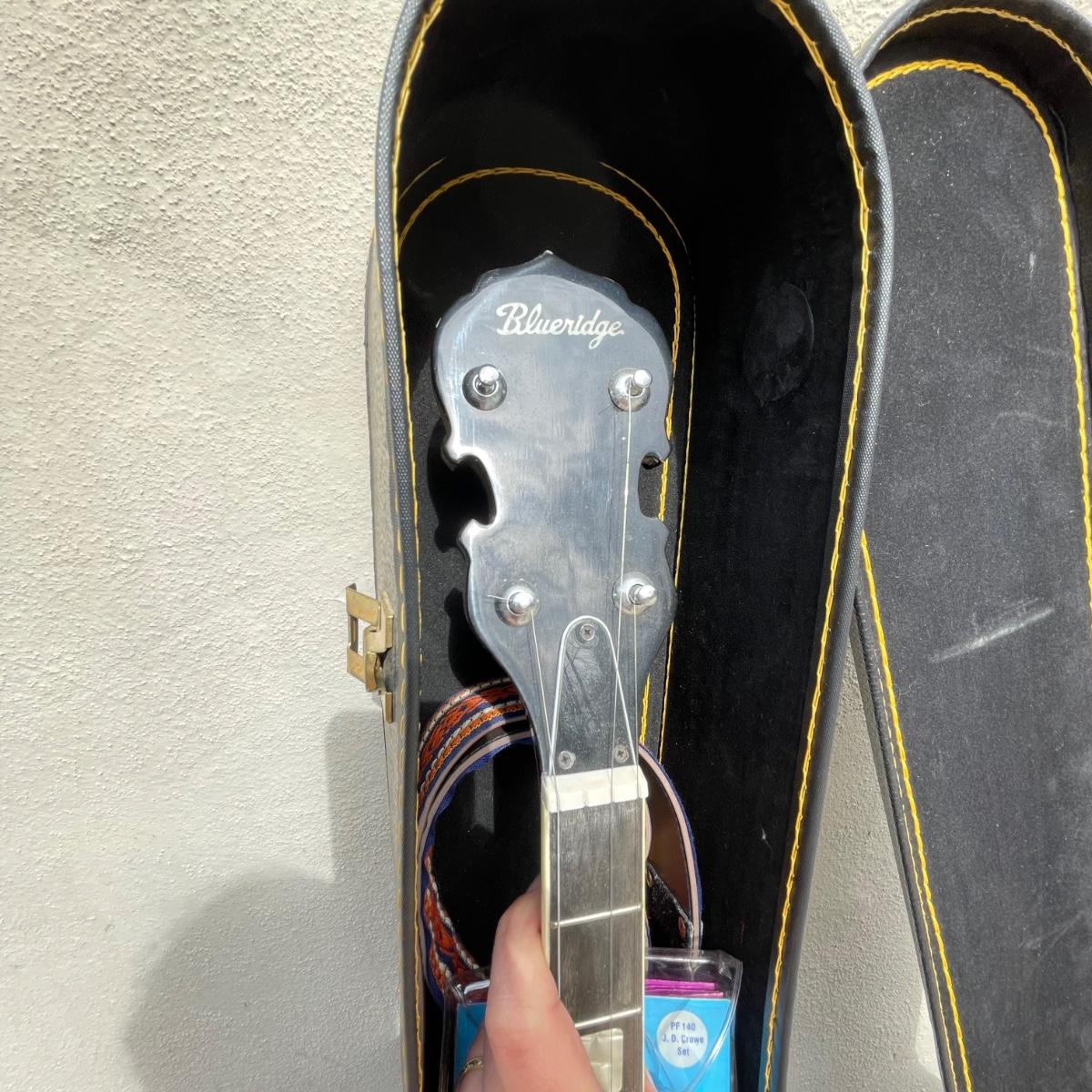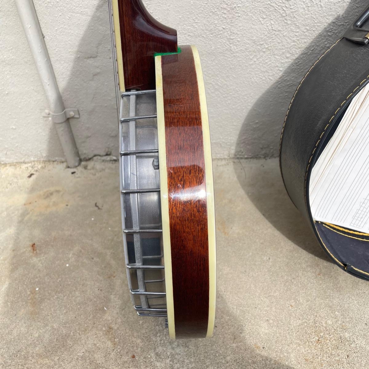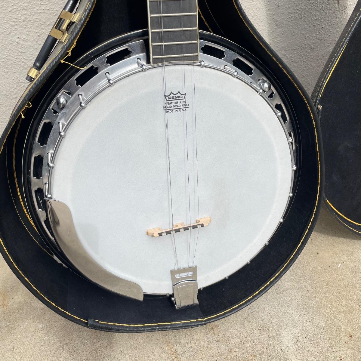 Blue Ridge five string banjo with extra strings and hard case measuring 15” x 40”. Lot also has one vintage Autoharp by Zimmerman Autoharp Company, a handmade in Horse Shoe, NC lovely guitar that appears to have inlay throughout. Two classic music stands, the larger appears to be brass, a stack of 33 1/3 plus two 78s vinyl and a rustic wood framed picture. See images. Shipping available. Please call UPS with dimensions at 828-252-6930 for a shipping quote prior to bidding.
