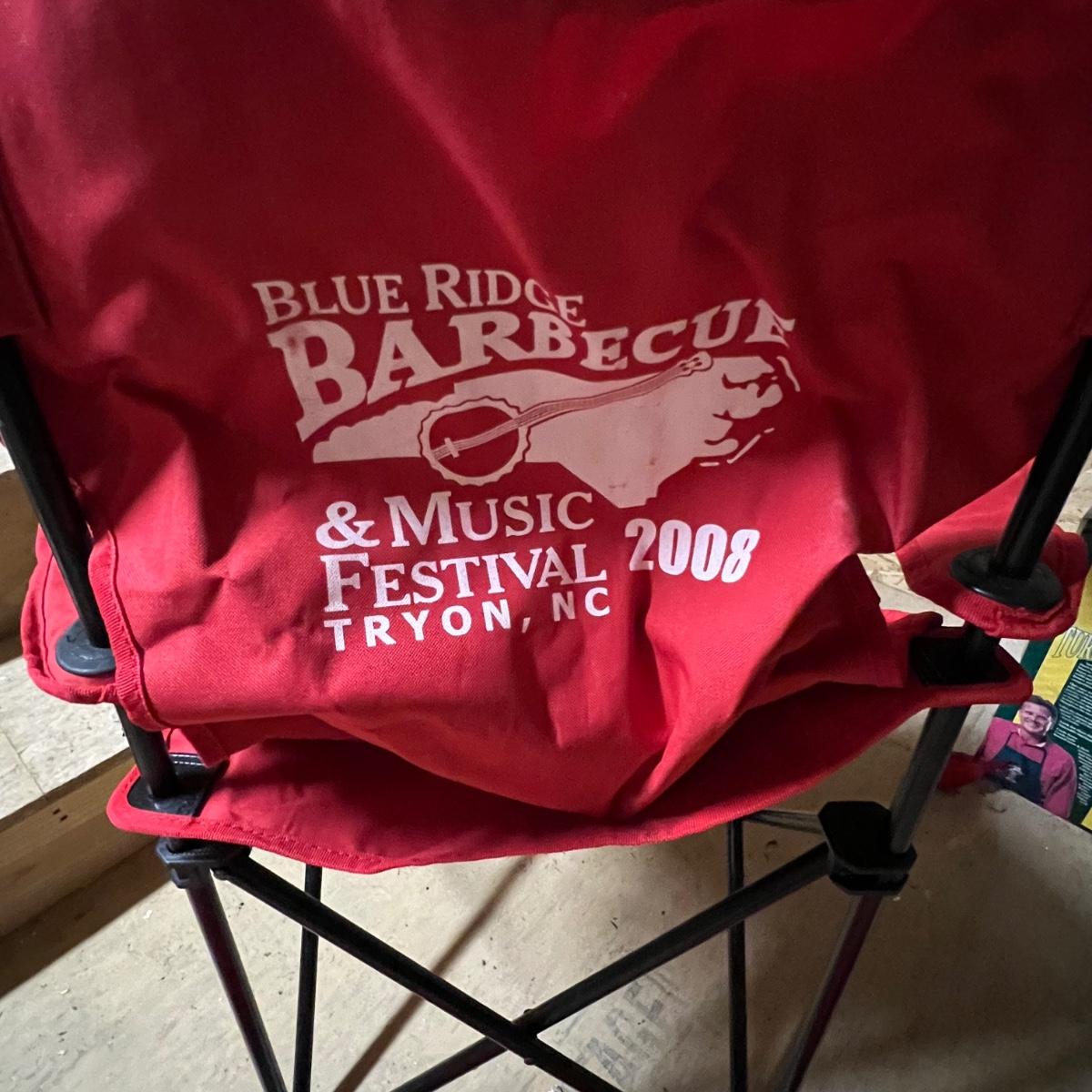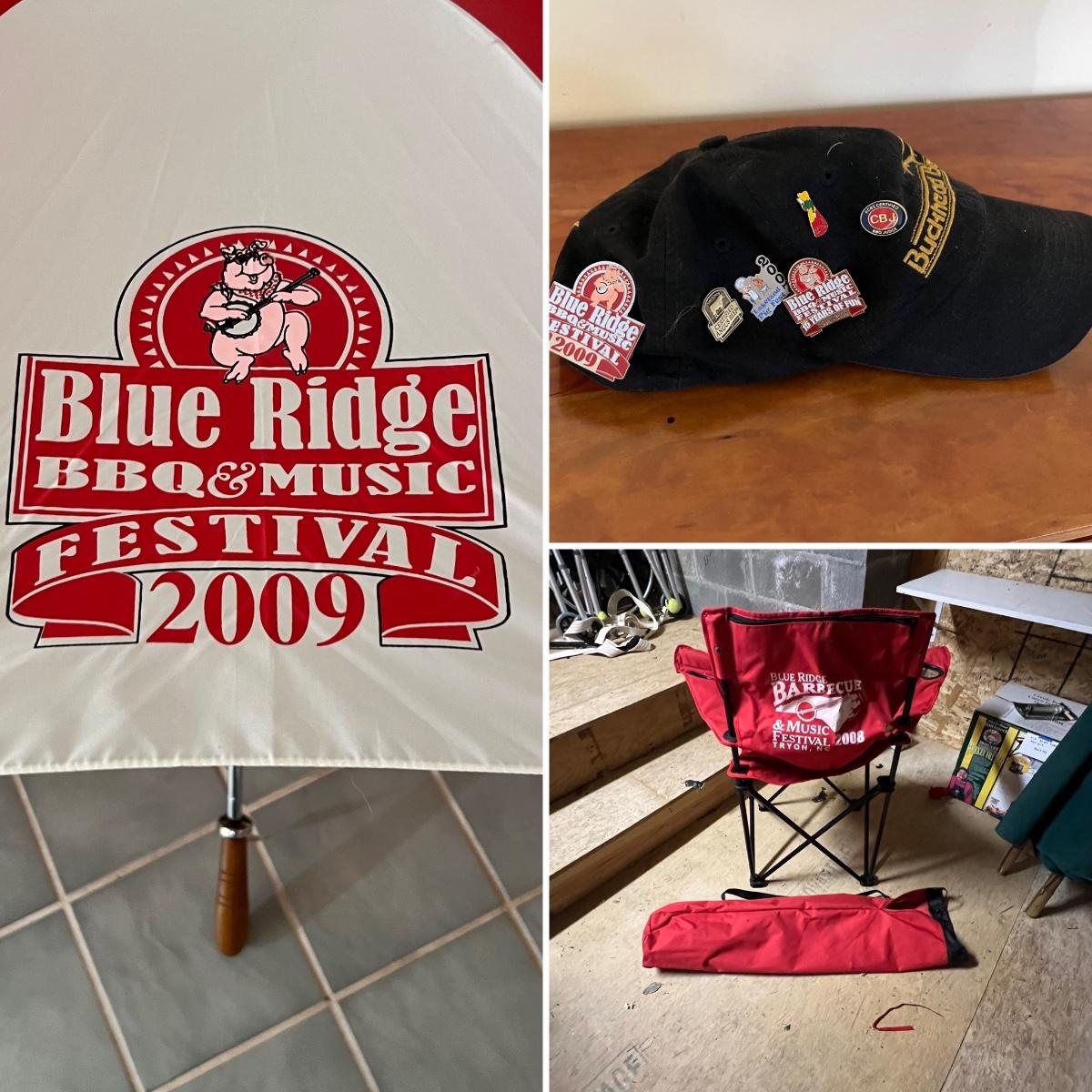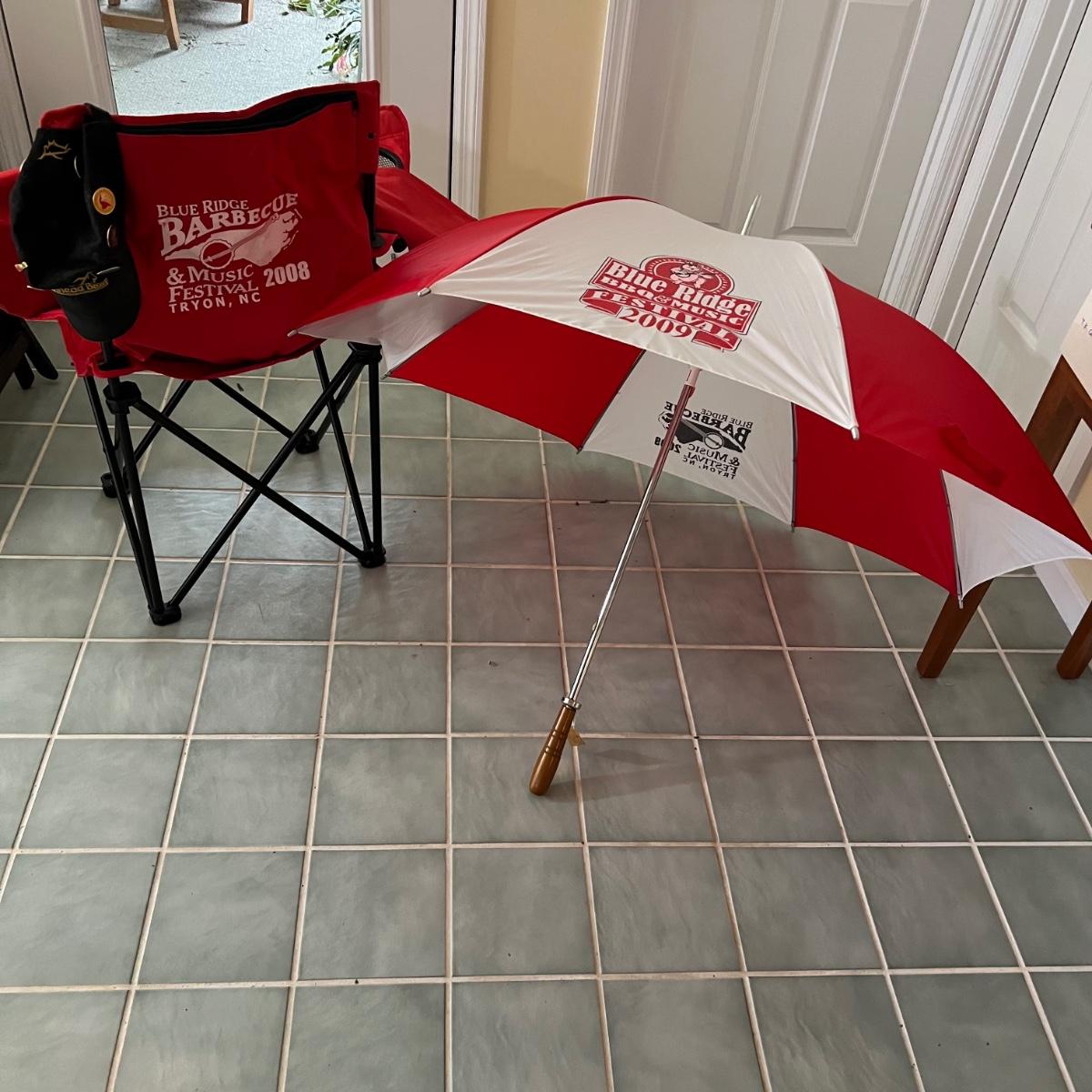 For all you lovers of BBQ! Blue Ridge Barbecue & Music Festival camp chair and a golf umbrella. Also an adjustable baseball cap with collectors BBQ related brooches attached.
