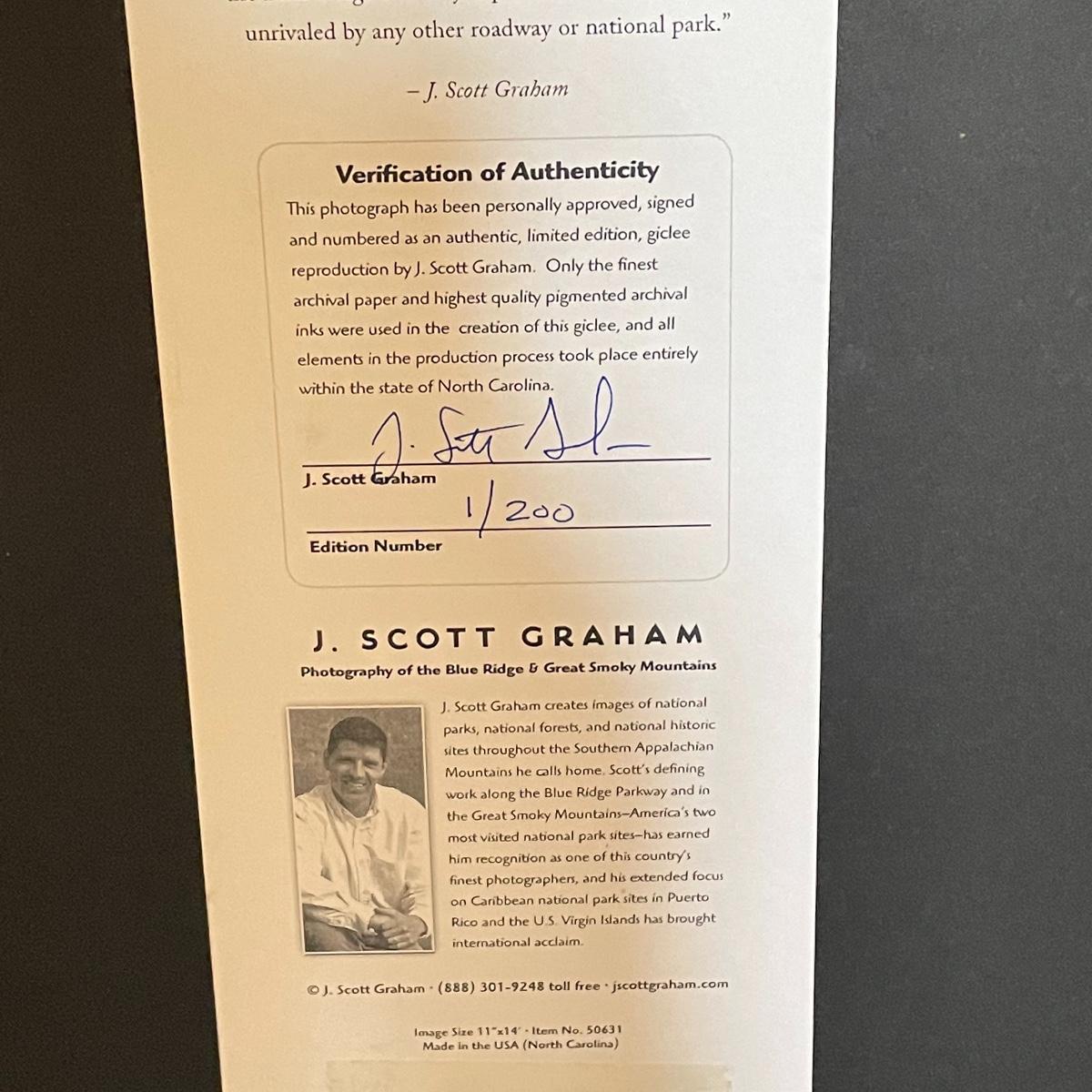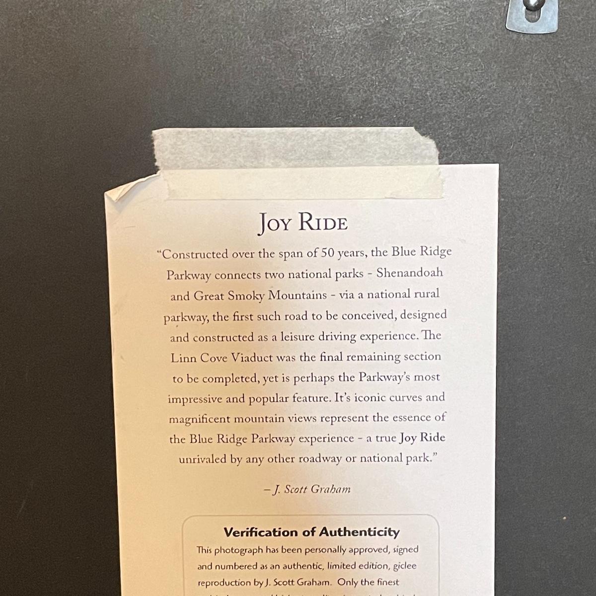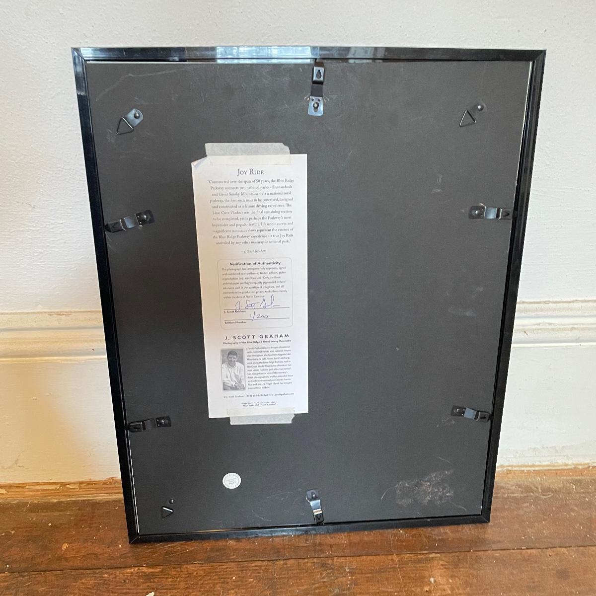 Signed and numbered 1/200 framed photograph of the Blue Ridge Parkway titled “Joy Ride” by J Scott Graham. Art sits behind glass in a 17” x 21” black plastic frame. See images. Shipping available. Please call UPS with dimensions at 828-252-6930 for a shipping quote prior to bidding.