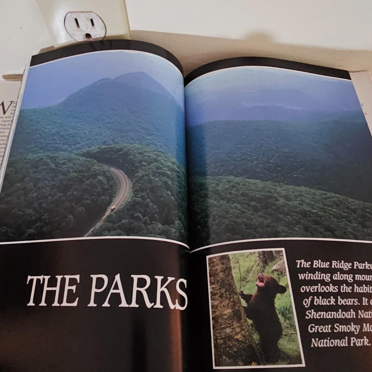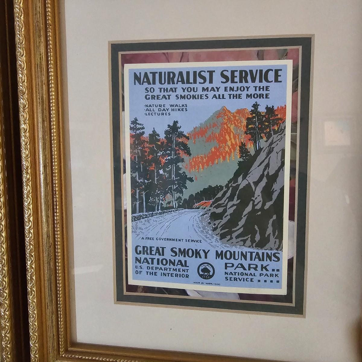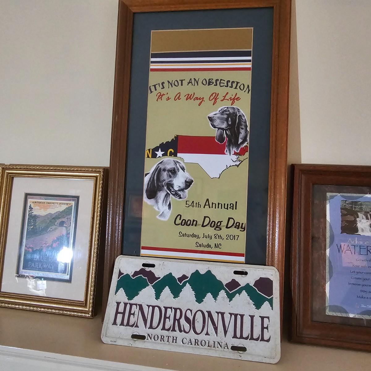 Several pieces of art and advertising for the Blue Ridge Mountain area. One framed promotional poster for Coon Dog Day measures 13.5" x 25"H. An ode from a waterfall is 10.5" x 12.5" H. The two gold framed U.S. parks ads are 9.5" x 12"H. Also, a National Geographic pictorial study of the area and some local photos and other. See photos for details. Shipping available. Shipping can be costly. We suggest contacting our preferred local shipping provider, Postage Express, with dimensions and getting an estimate before bidding: (828) 255-9250 or shipping@postageexpressnc.com.