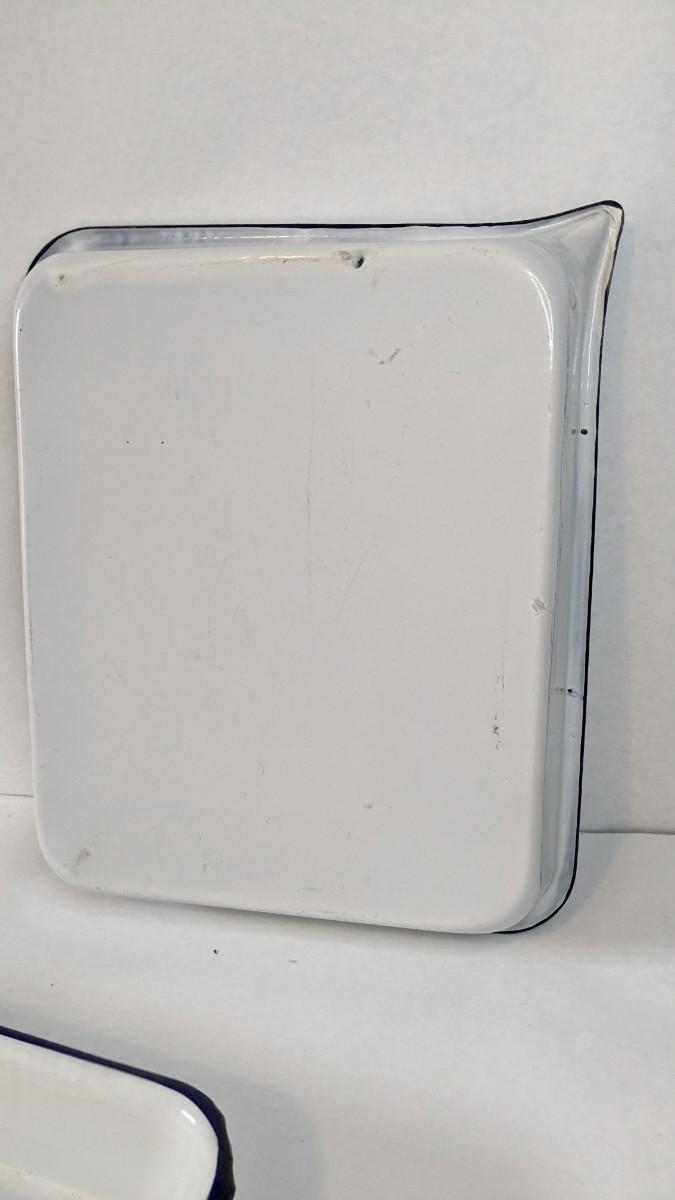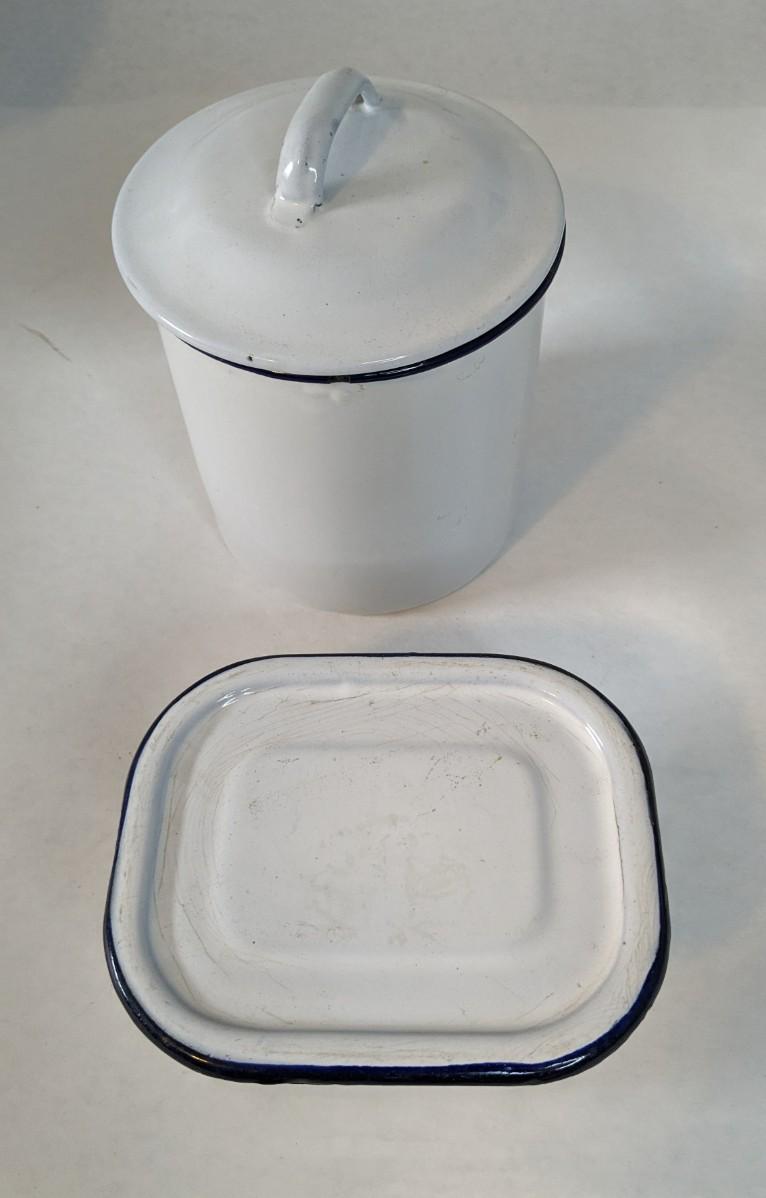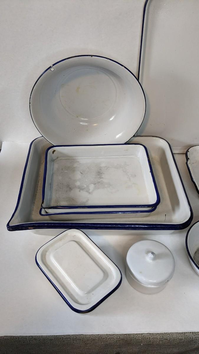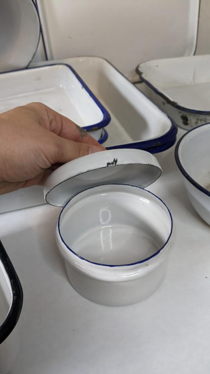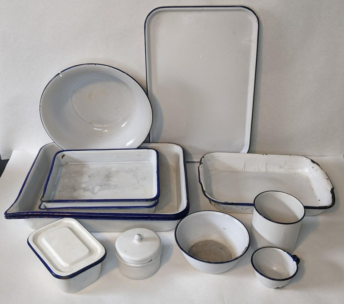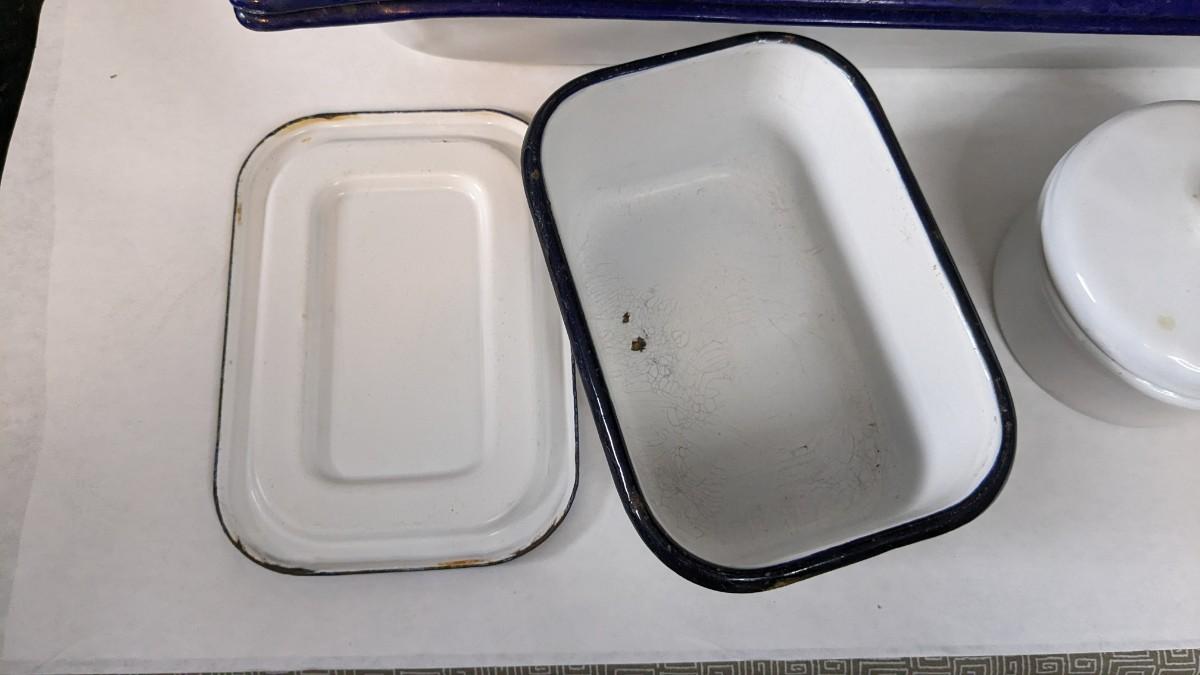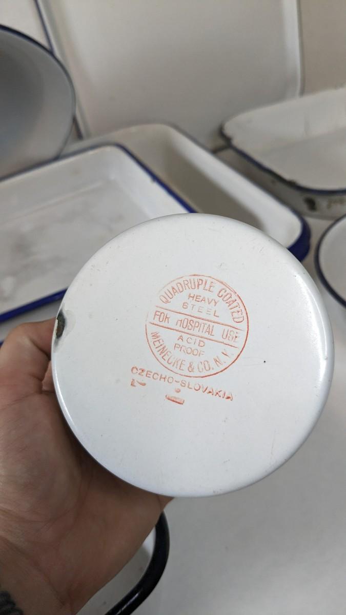 a beautiful assortment of medical and household blue rim enamelware. Includes (2) 11"x17" instrument pans with draining edge, as well as (2) smaller 8"x10" of the same design. 2 covered bandage dishes, one small lidded apothecary jar that is marked on the bottom and a larger lidded jar. Please note smaller lidded bandage container and lid for larger lidded jar were found after initial photographing. Also includes a large instrument tray, 2 small basin, and cup. Overall this lot is in really nice condition for age.