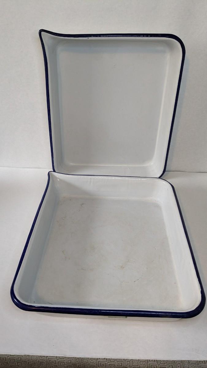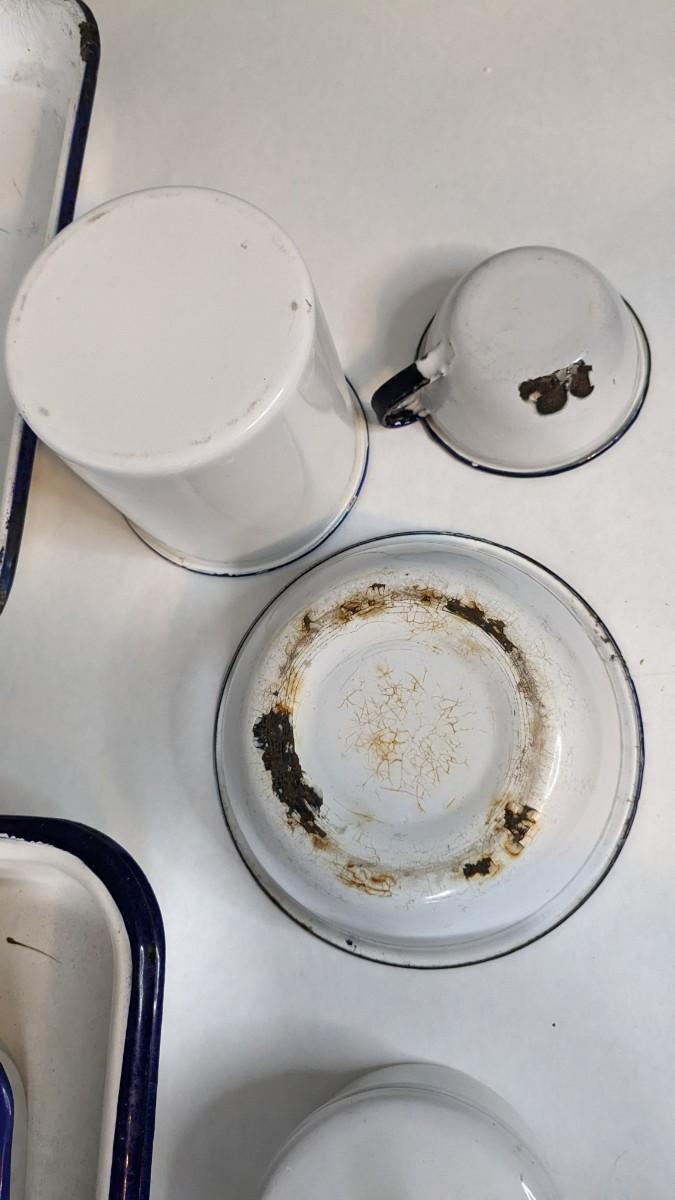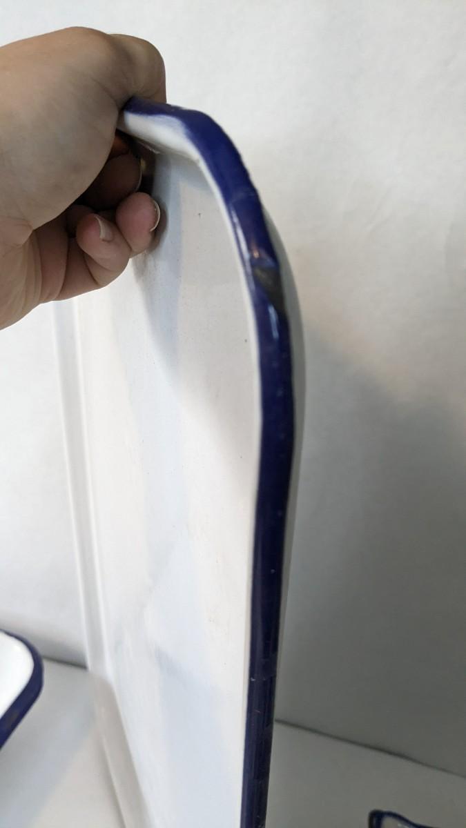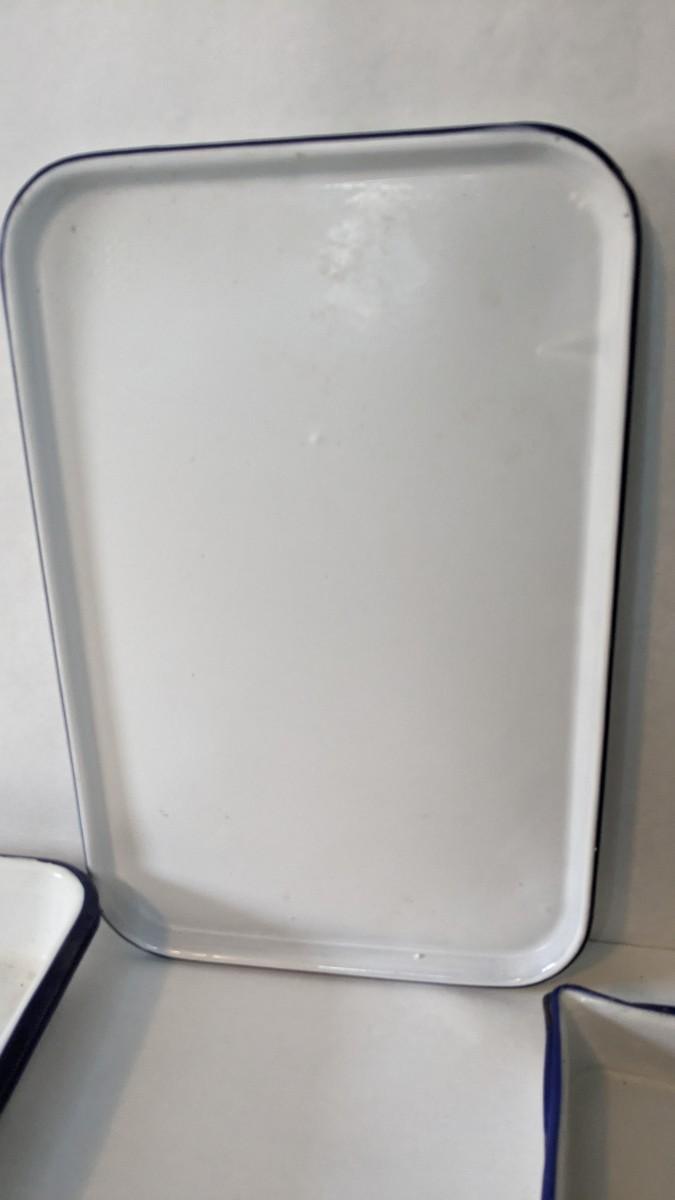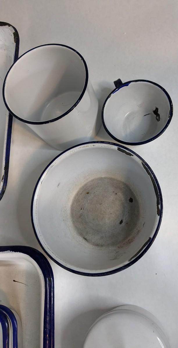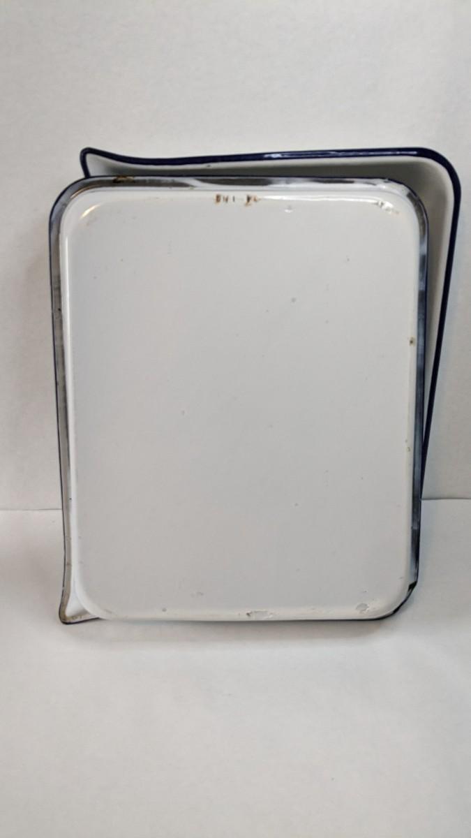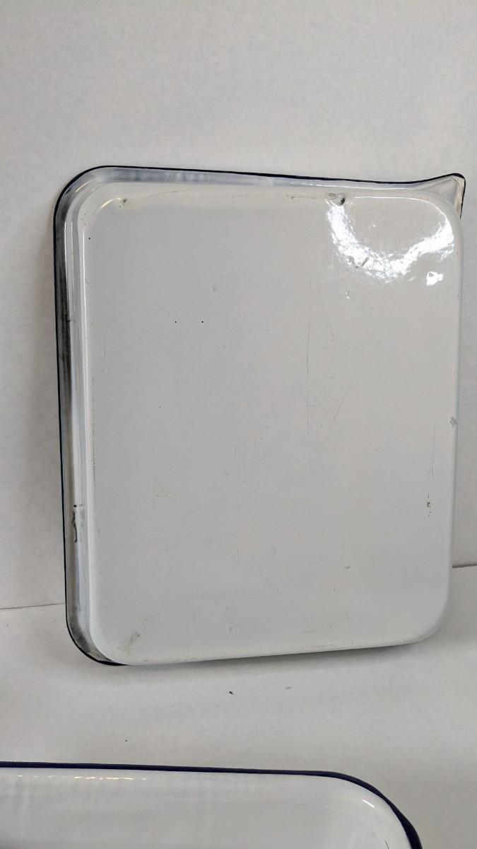 a beautiful assortment of medical and household blue rim enamelware. Includes (2) 11"x17" instrument pans with draining edge, as well as (2) smaller 8"x10" of the same design. 2 covered bandage dishes, one small lidded apothecary jar that is marked on the bottom and a larger lidded jar. Please note smaller lidded bandage container and lid for larger lidded jar were found after initial photographing. Also includes a large instrument tray, 2 small basin, and cup. Overall this lot is in really nice condition for age.