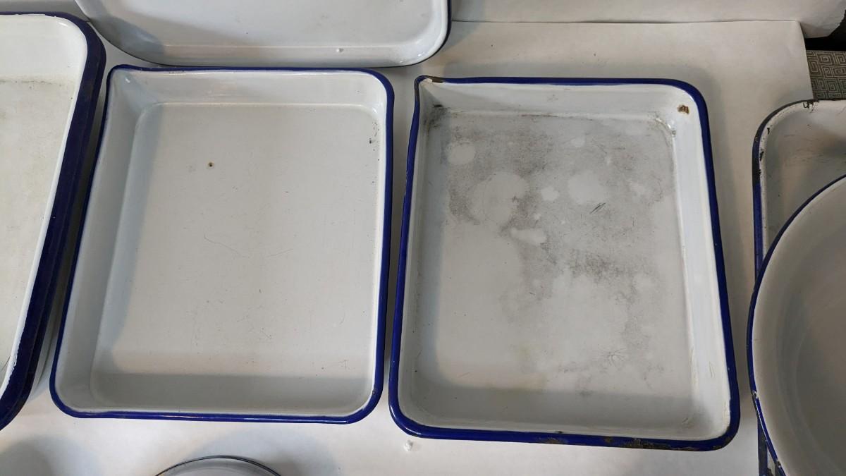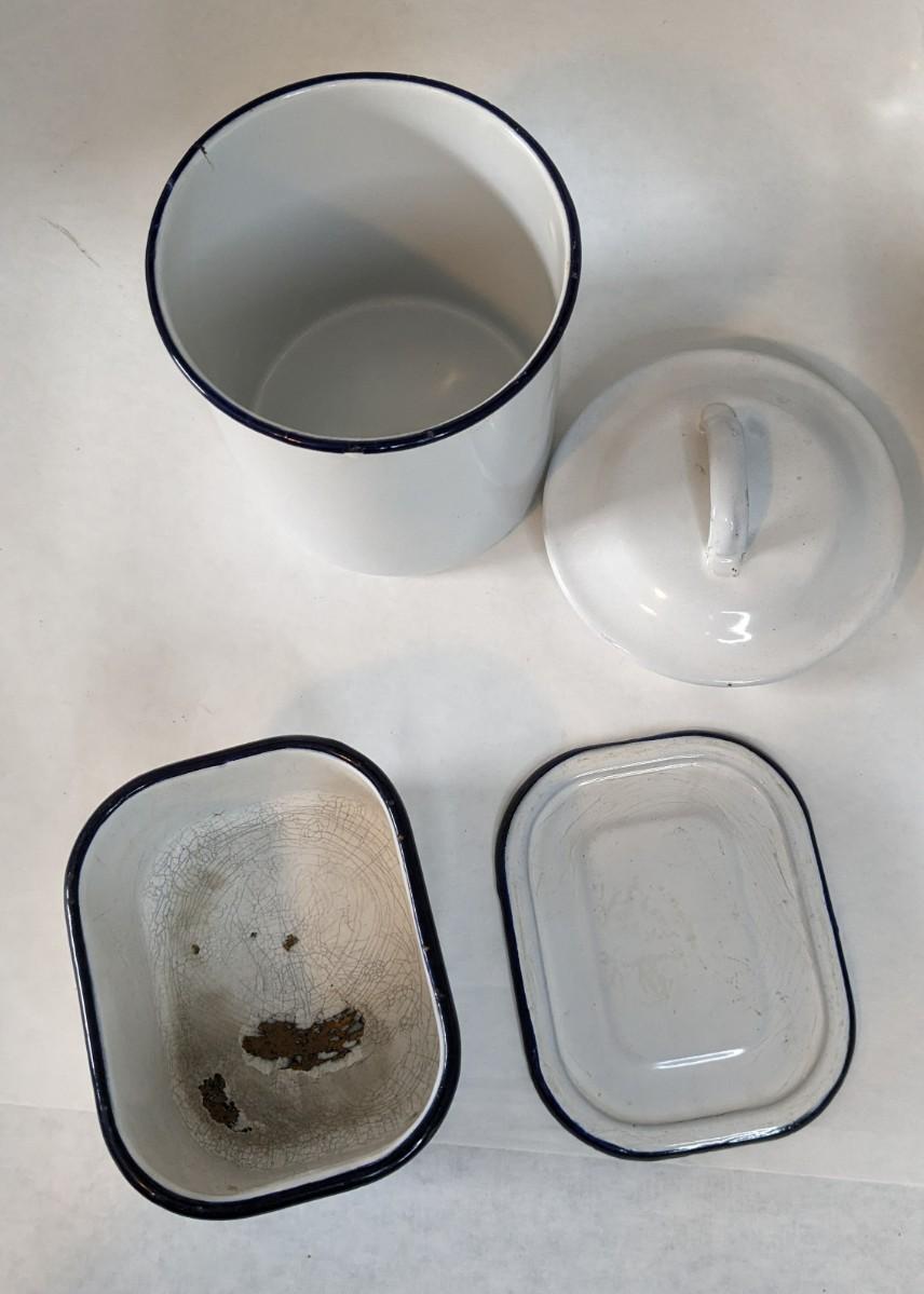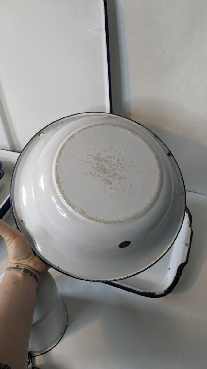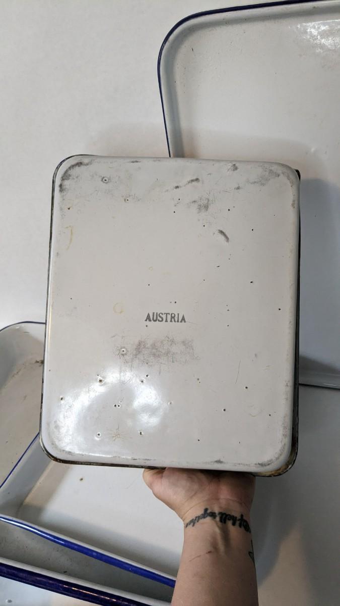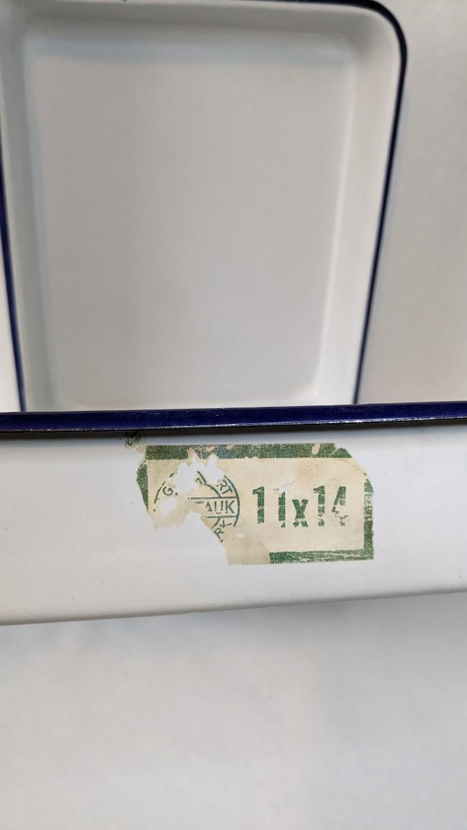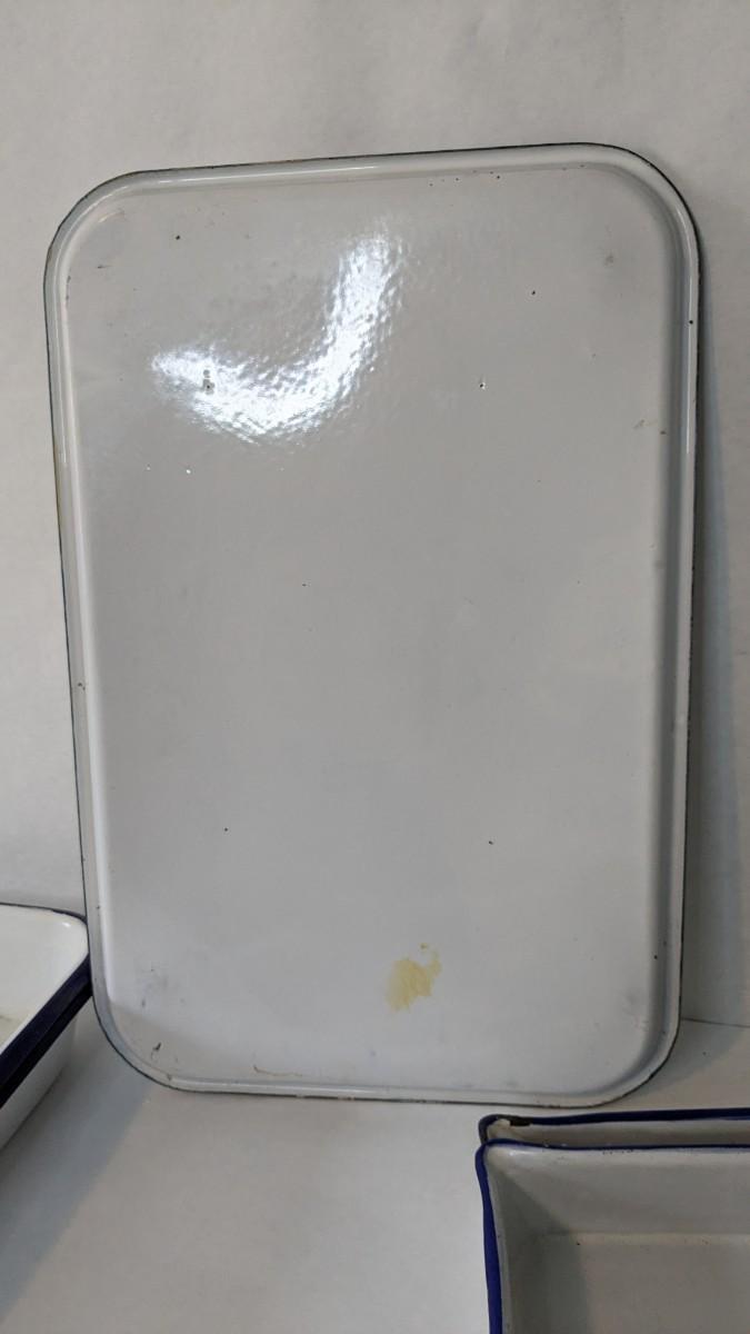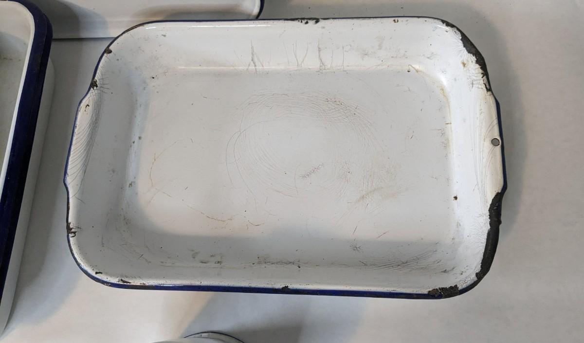 a beautiful assortment of medical and household blue rim enamelware. Includes (2) 11"x17" instrument pans with draining edge, as well as (2) smaller 8"x10" of the same design. 2 covered bandage dishes, one small lidded apothecary jar that is marked on the bottom and a larger lidded jar. Please note smaller lidded bandage container and lid for larger lidded jar were found after initial photographing. Also includes a large instrument tray, 2 small basin, and cup. Overall this lot is in really nice condition for age.