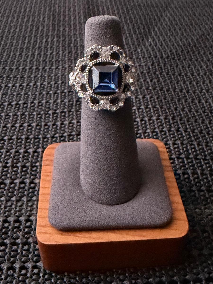 blue ring, featuring a square-cut Montana Blue gem surrounded by white rhinestones in silver pronged fittings.