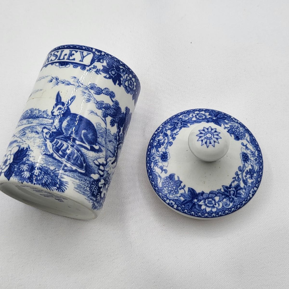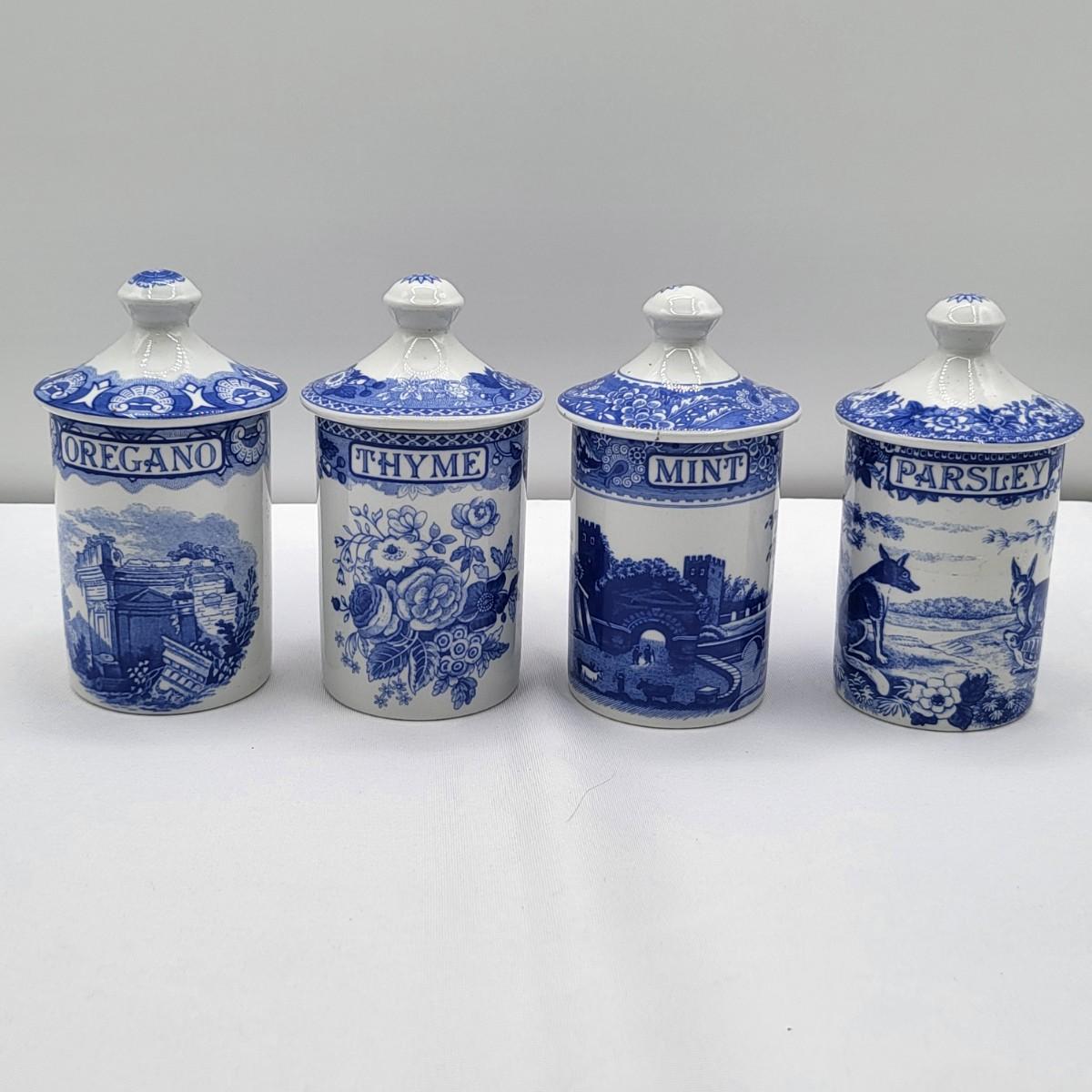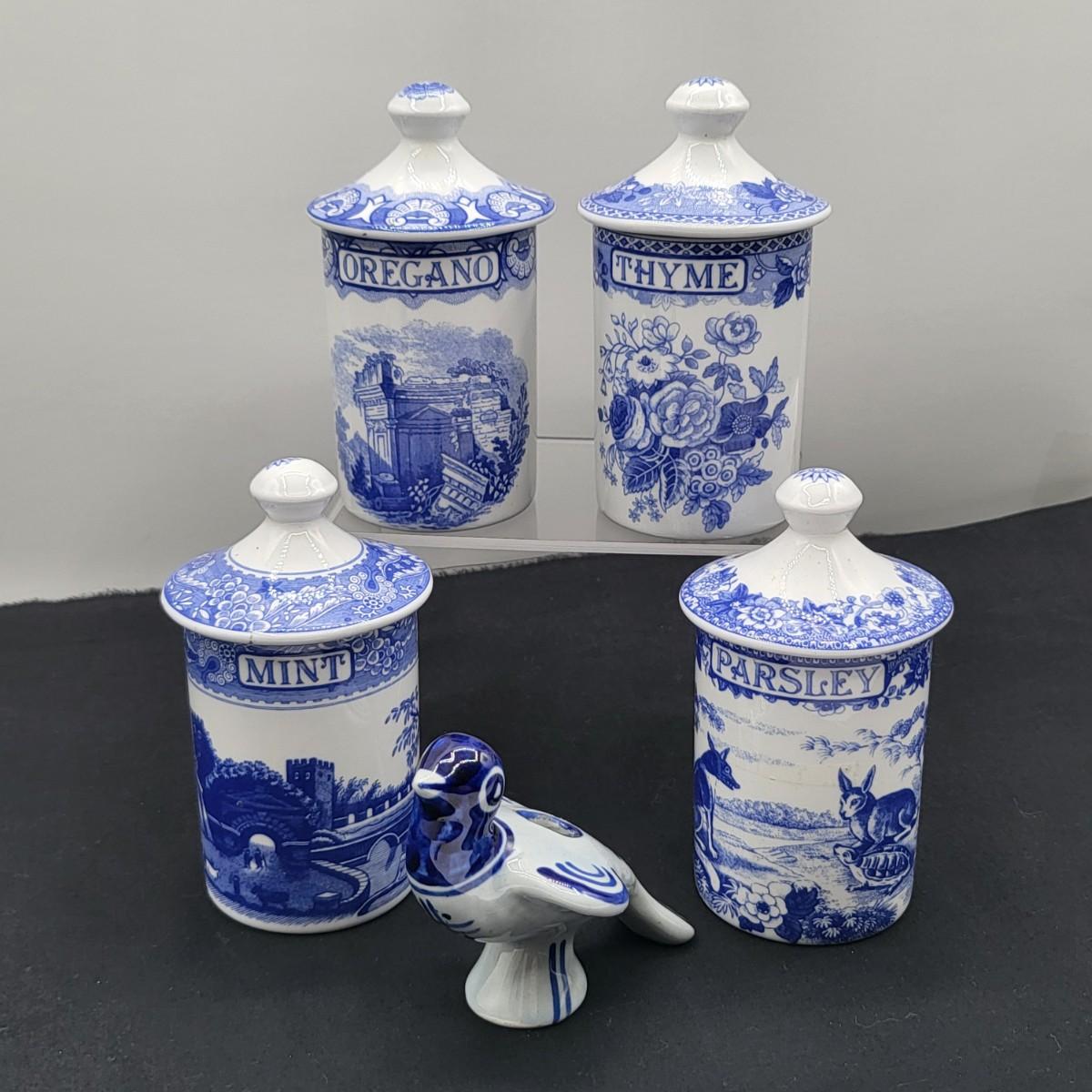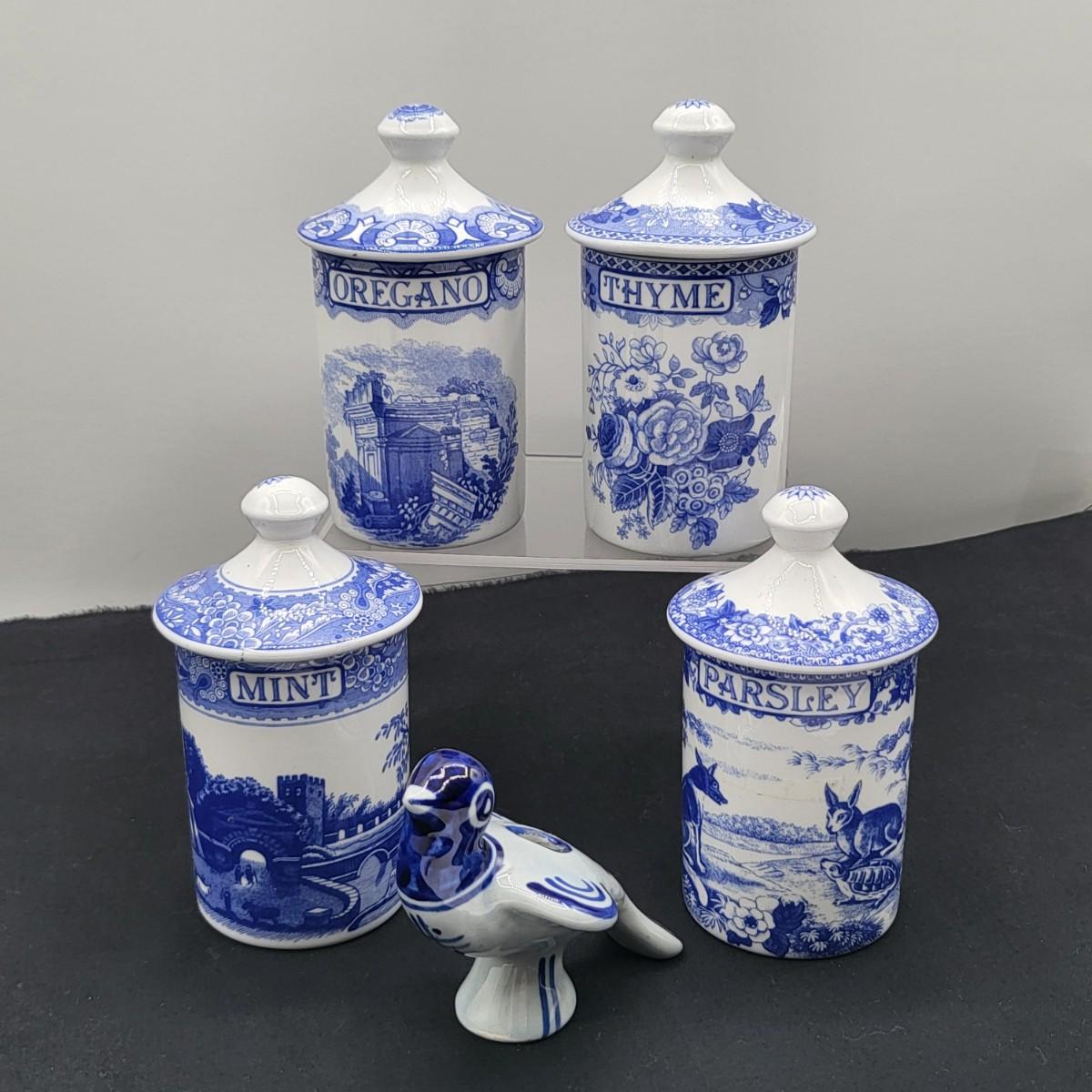 The Spode Blue Room Collection, four 4.25" lidded porcelain jars for herbs & spices (Mint, Thyme, Parsley & Oregano) and a ceramic 4" dove small candle stick holder, signed Soholm Denmark.
