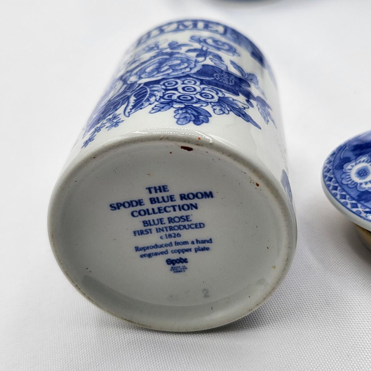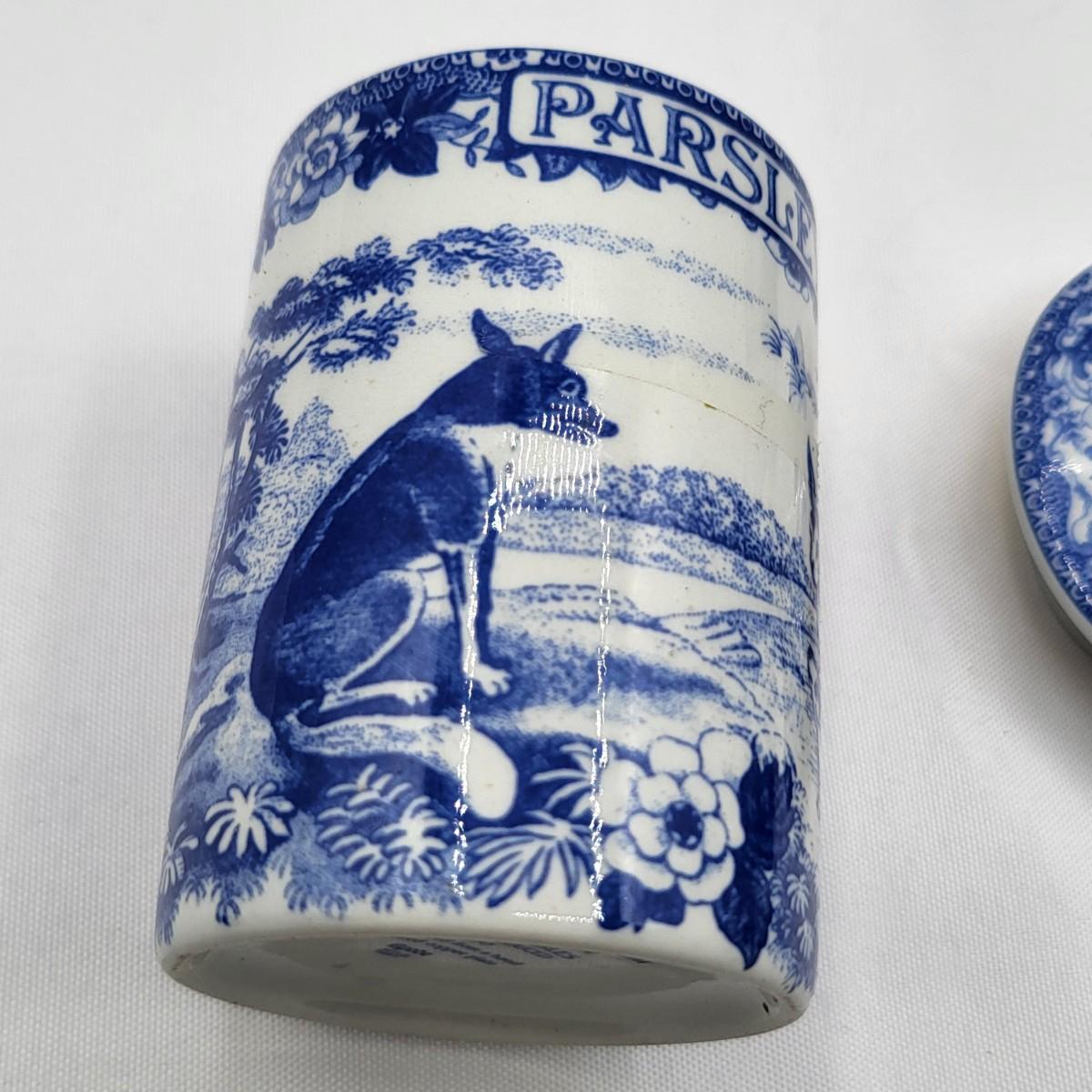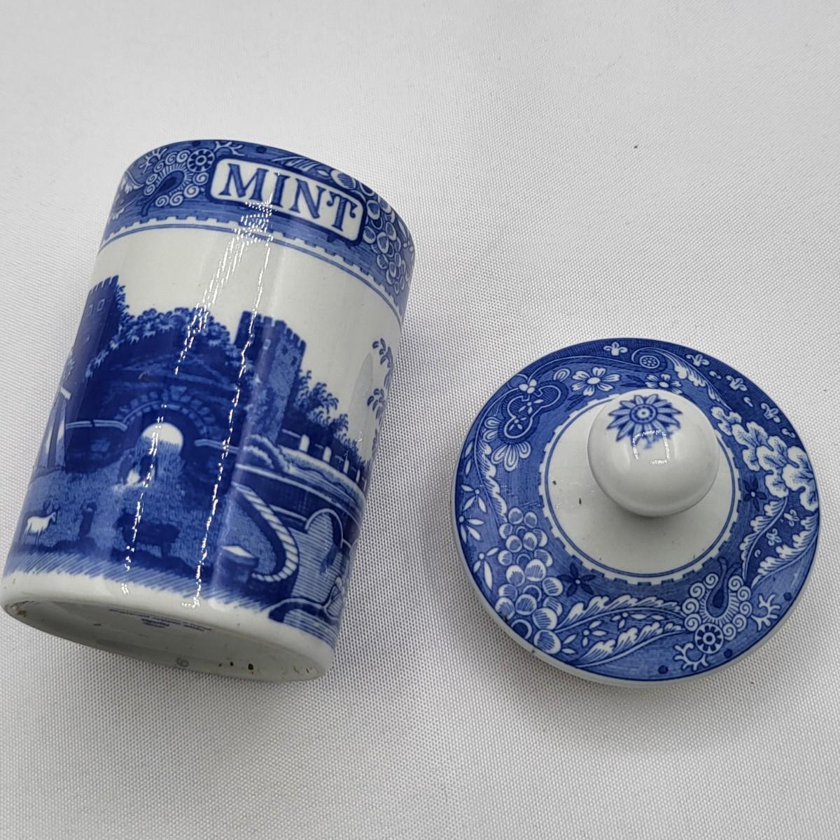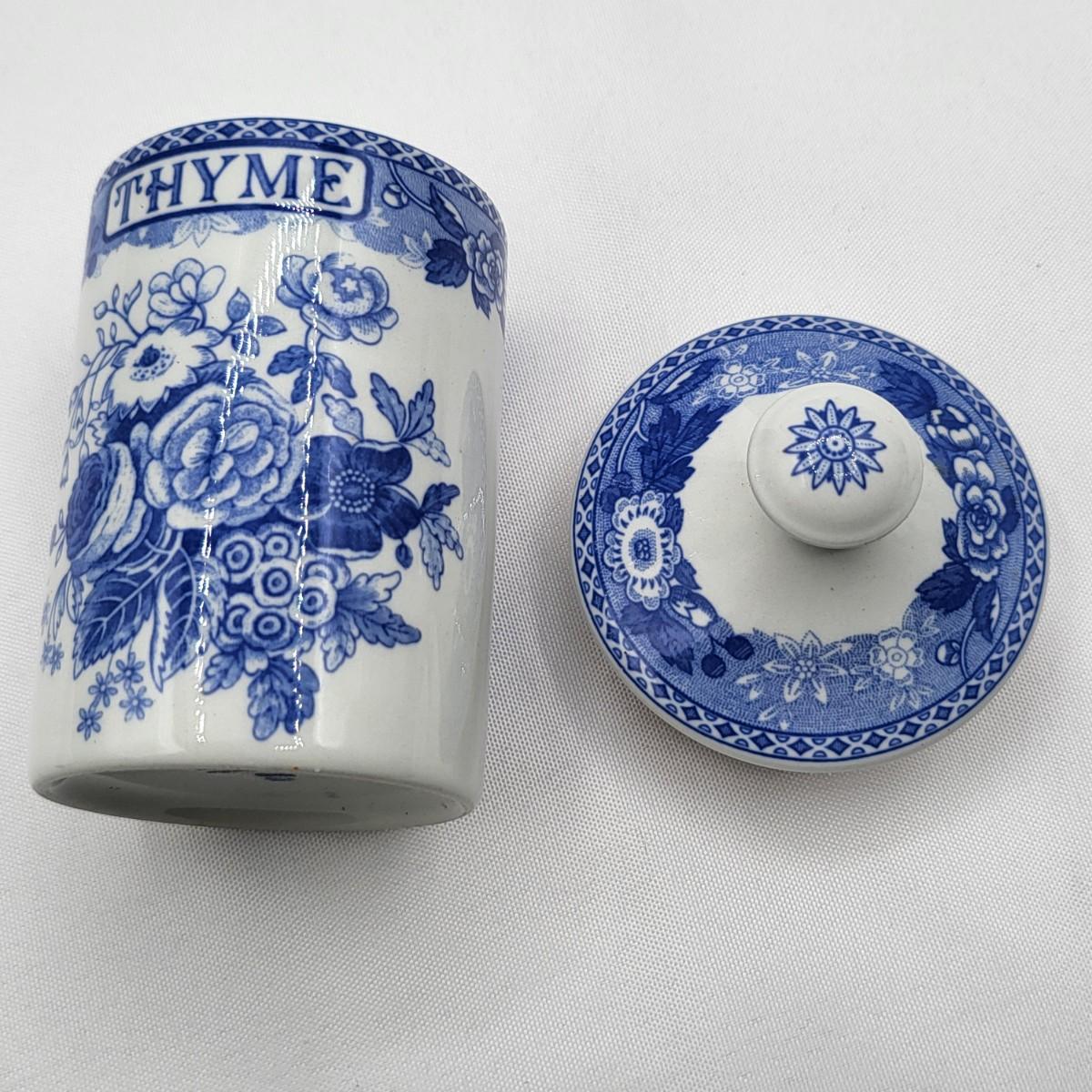 The Spode Blue Room Collection, four 4.25" lidded porcelain jars for herbs & spices (Mint, Thyme, Parsley & Oregano) and a ceramic 4" dove small candle stick holder, signed Soholm Denmark.