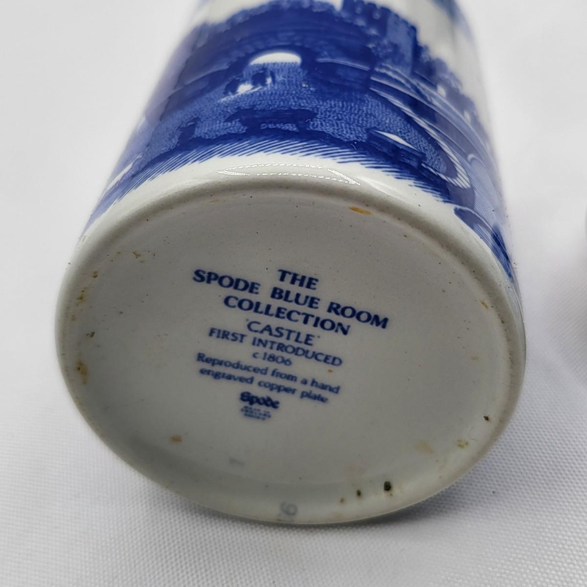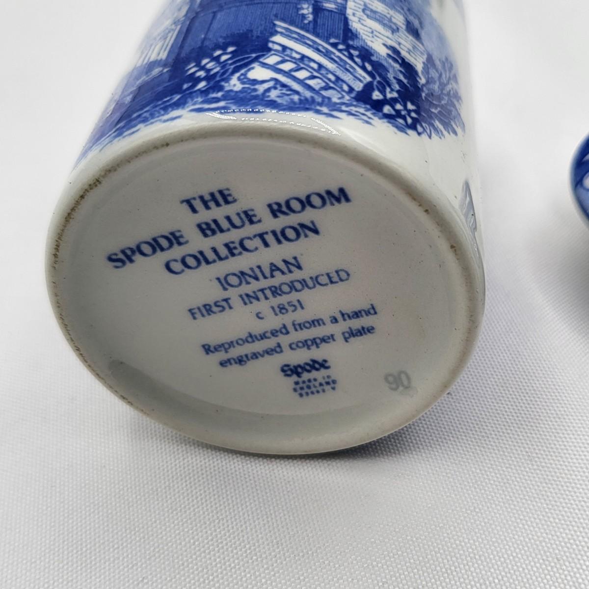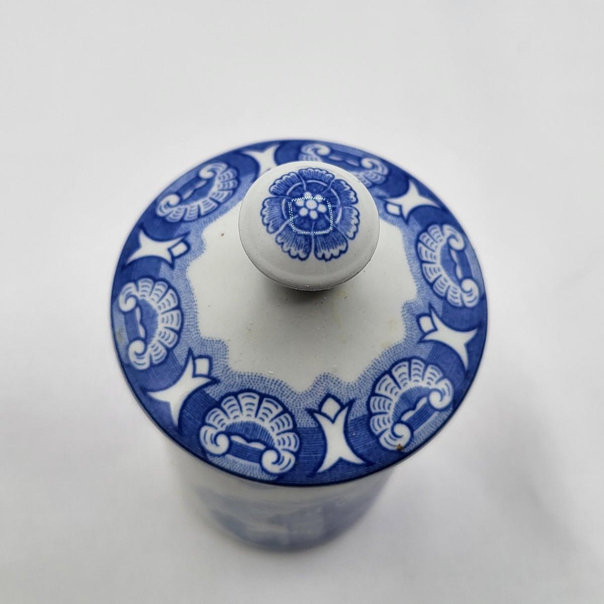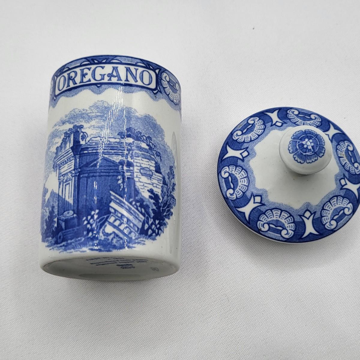The Spode Blue Room Collection, four 4.25" lidded porcelain jars for herbs & spices (Mint, Thyme, Parsley & Oregano) and a ceramic 4" dove small candle stick holder, signed Soholm Denmark.