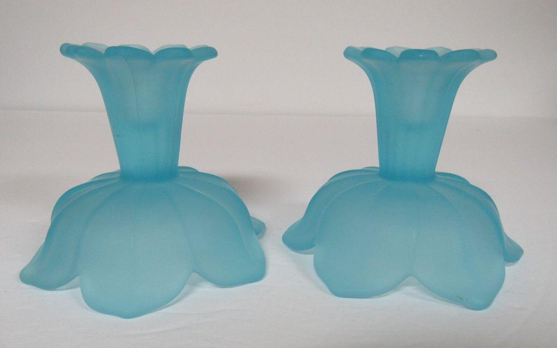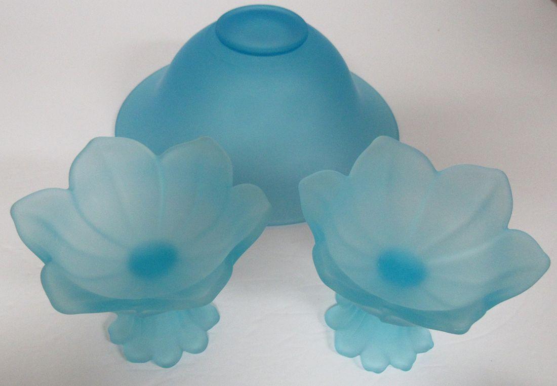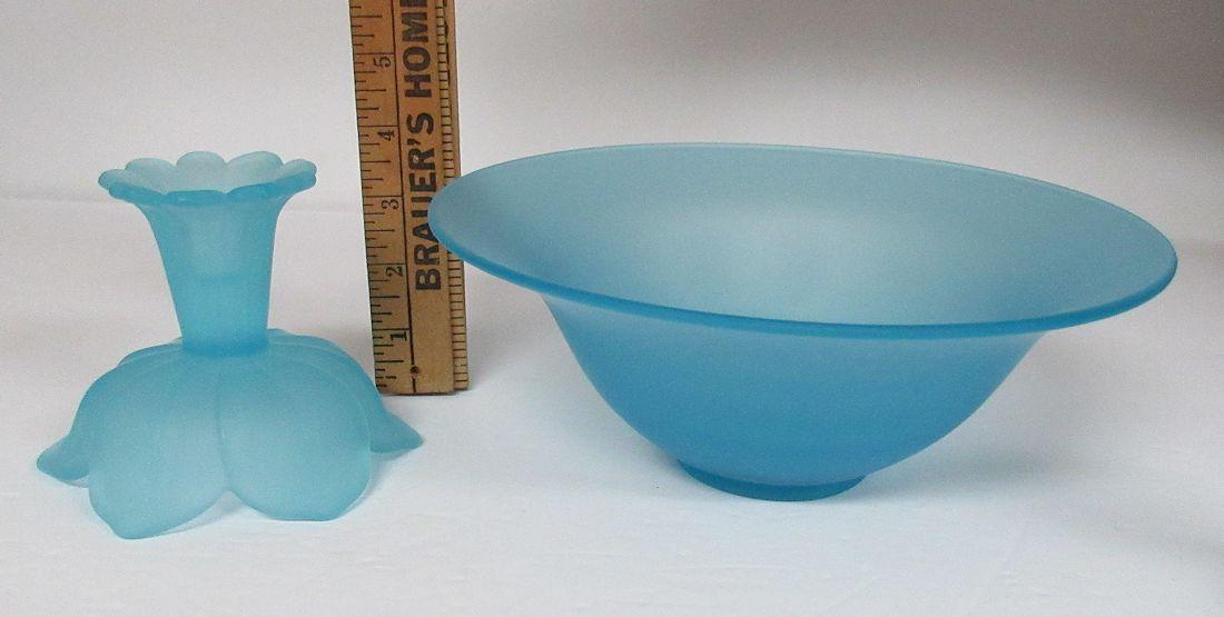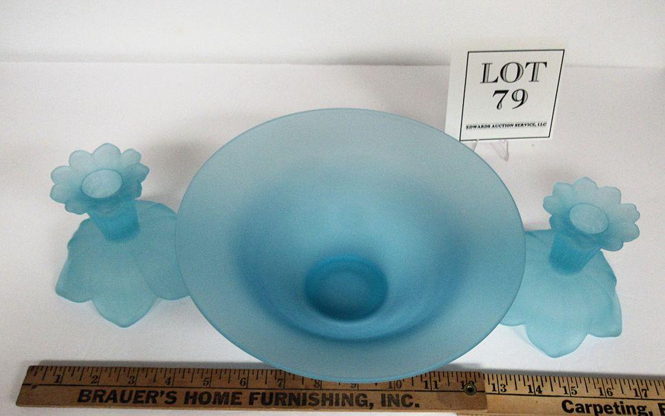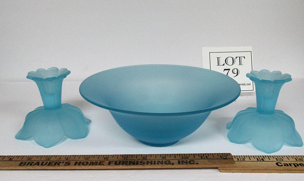 Blue Satin Glass Westmoreland Lotus Pair Candlesticks and Bowl, Unmarked