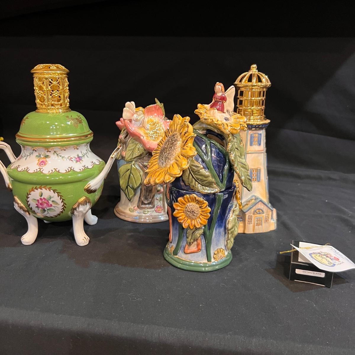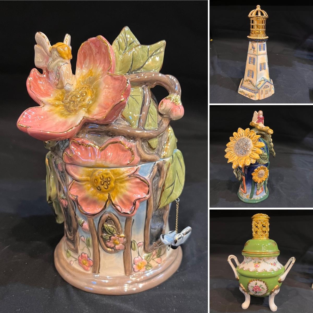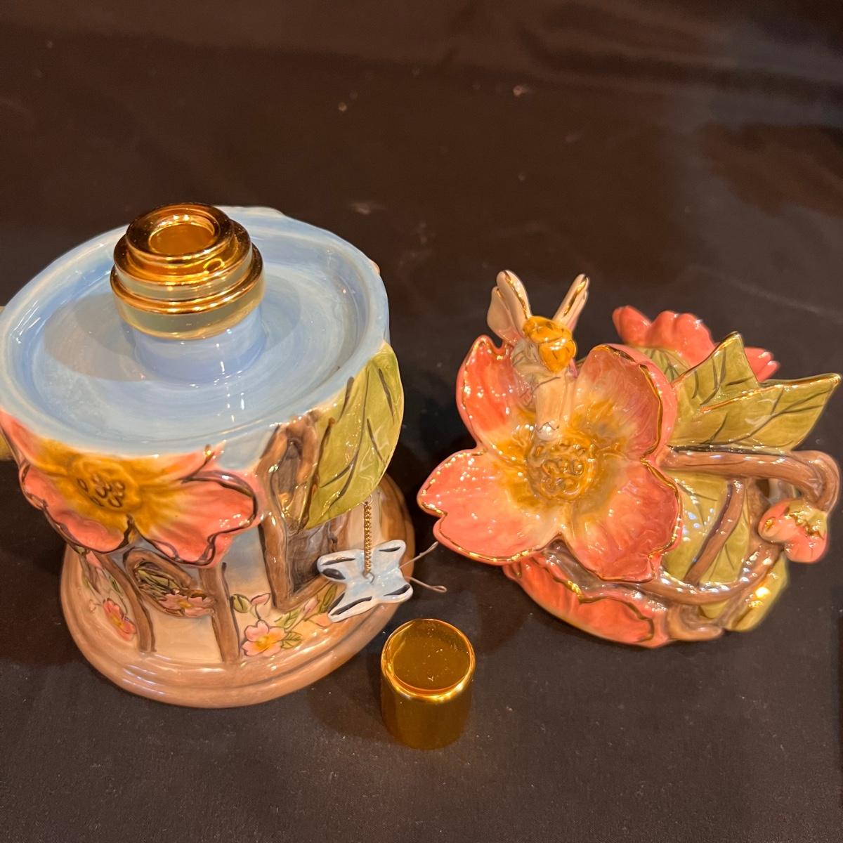 Four ceramic fragrance lamps includes two Blue Sky lamps that are highly decorative; one has a butterfly hanging on a chain, the other has a lady bug. None have wicks but a new in box wick is included.