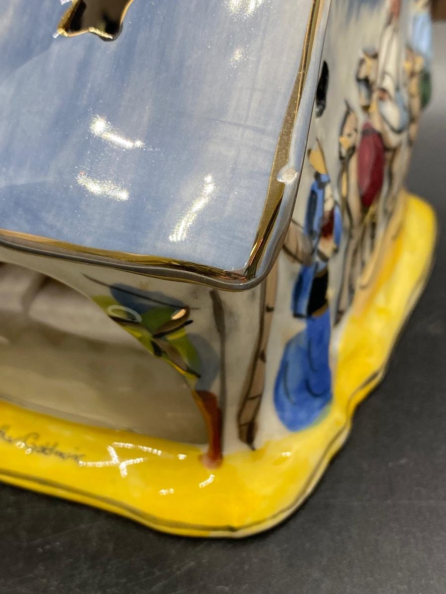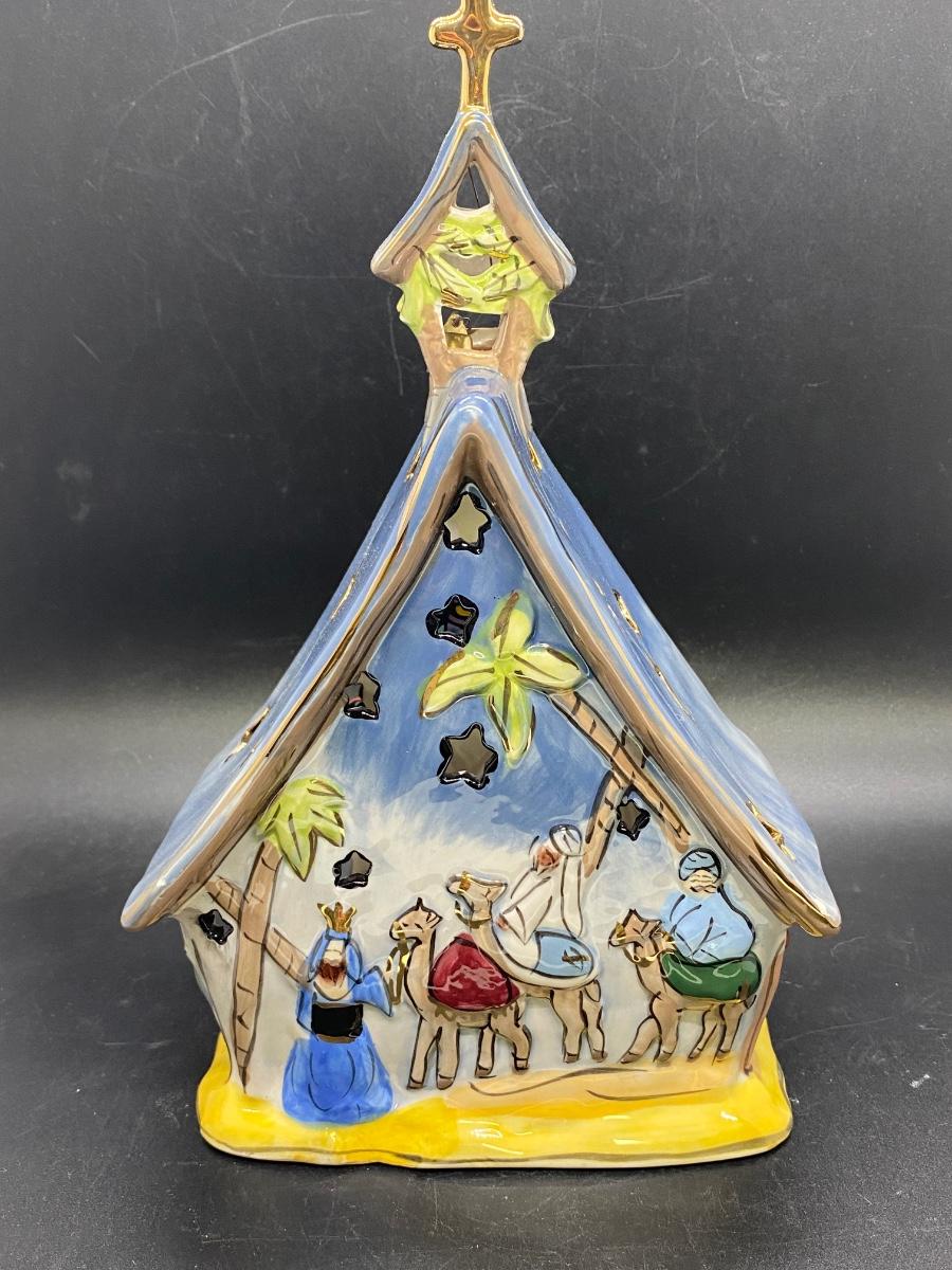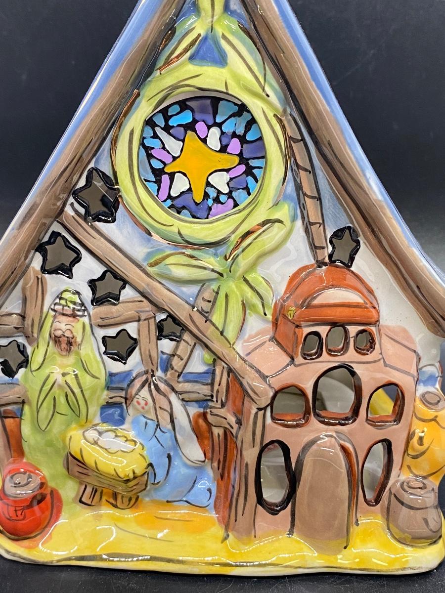Blue Sky Clayworks Ceramic Holiday Religious Home Decor Light Up Nativity Manger Scene by Heather Goldminc. The piece does not come with candle. There are a couple very small chips but no significant damage and is in good displayable condition. Check pictures for more details and for sizing.
