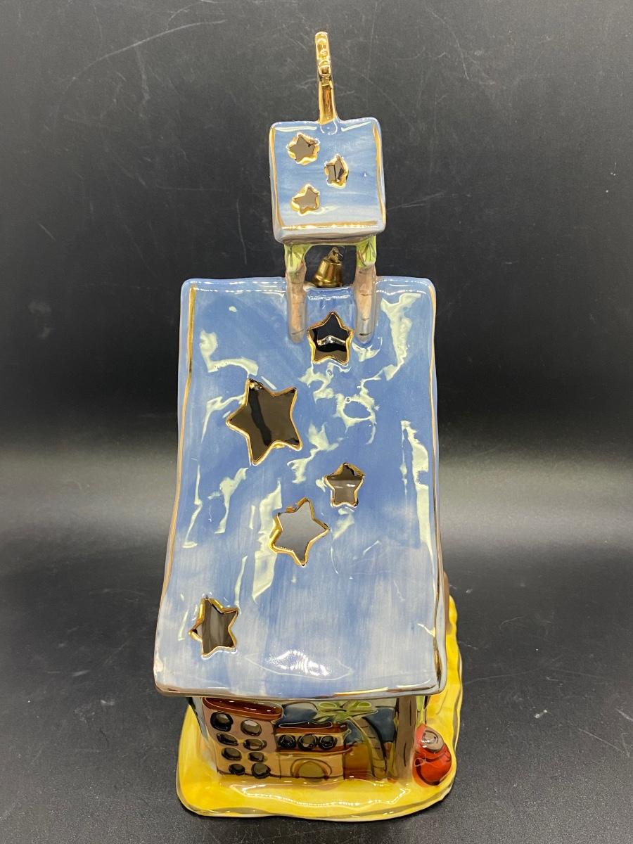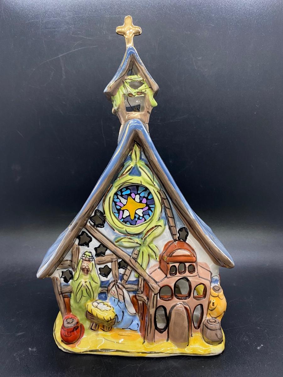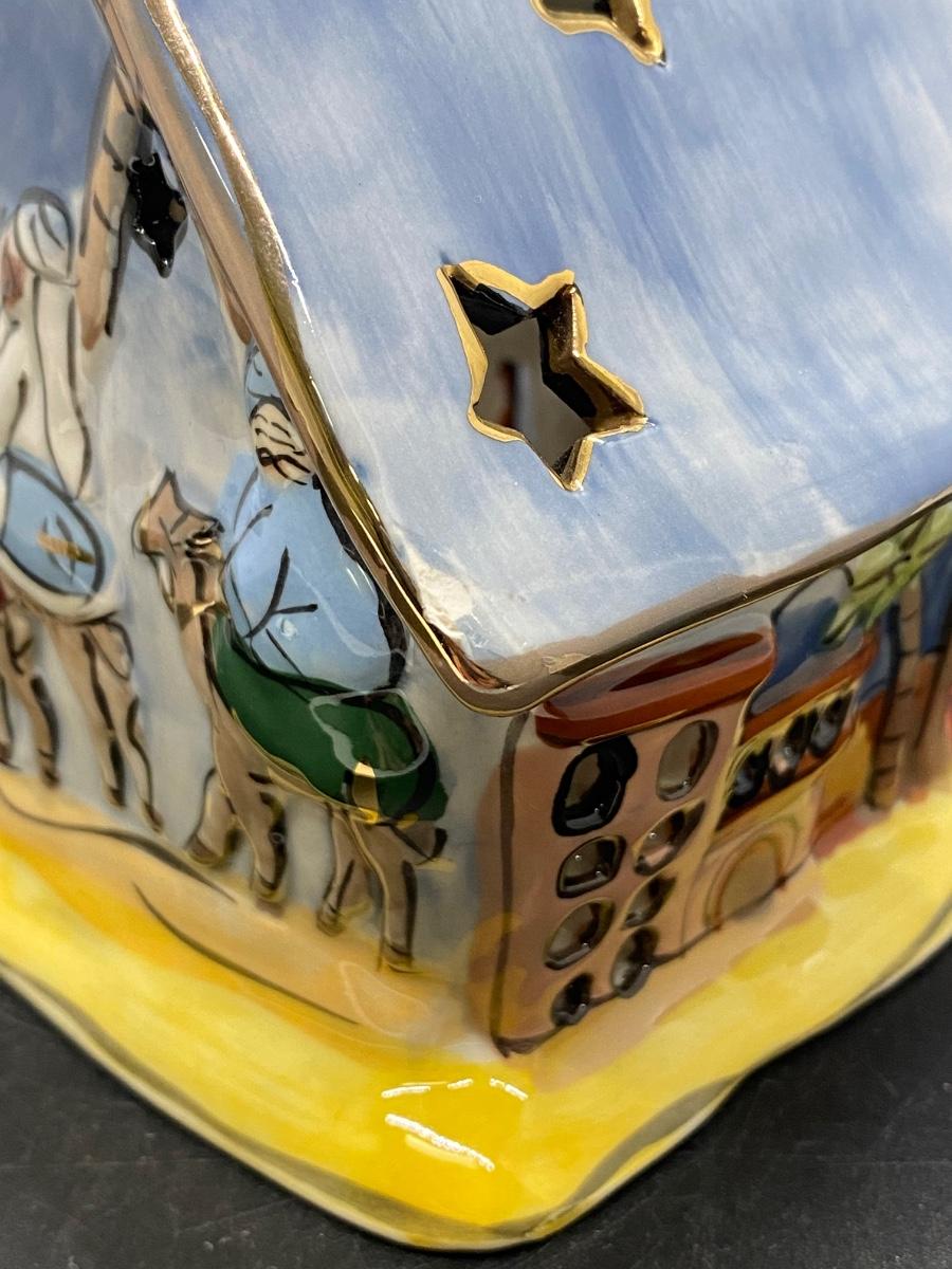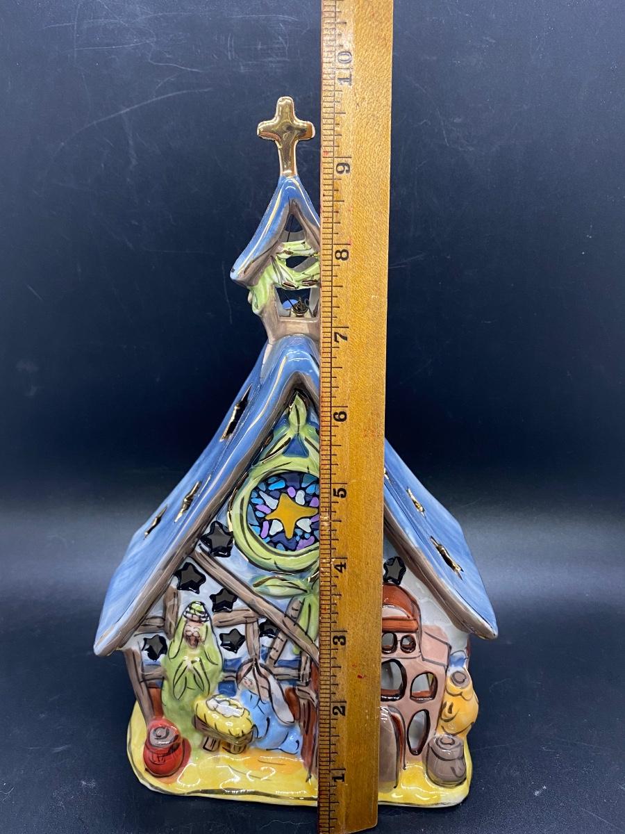 Blue Sky Clayworks Ceramic Holiday Religious Home Decor Light Up Nativity Manger Scene by Heather Goldminc. The piece does not come with candle. There are a couple very small chips but no significant damage and is in good displayable condition. Check pictures for more details and for sizing.