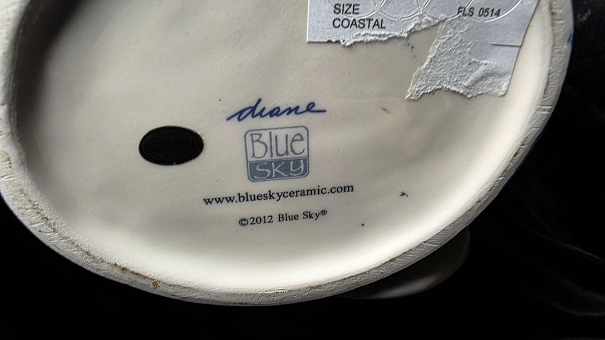 The underside is clearly marked Blue Sky Clayworks with designer signature “Diane” and website stamp, confirming authentic production. These functional art teapots are produced as collectible tabletop ceramics and are highly sought after for their playful form and handcrafted aesthetic. They display beautifully as décor and remain fully usable as a serving piece.