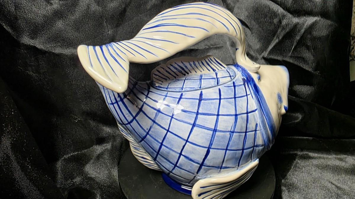 This whimsical Blue Sky Clayworks ceramic teapot features a charming fish-shaped design, commonly known as the “Kissy Fish” or koi-style teapot. The tail forms the handle, the open mouth serves as the spout, and the removable lid rests atop the fish’s back. The piece is hand-painted in a blue and white pattern with expressive brushwork and a glossy glazed finish, giving it strong coastal and artisan character.