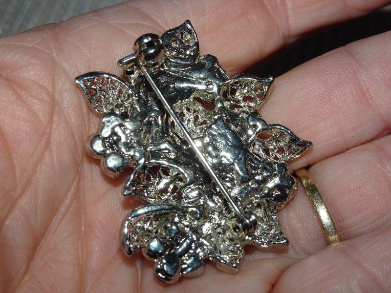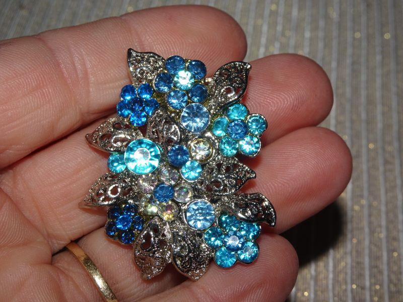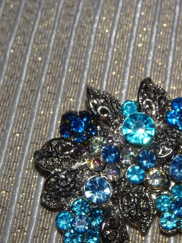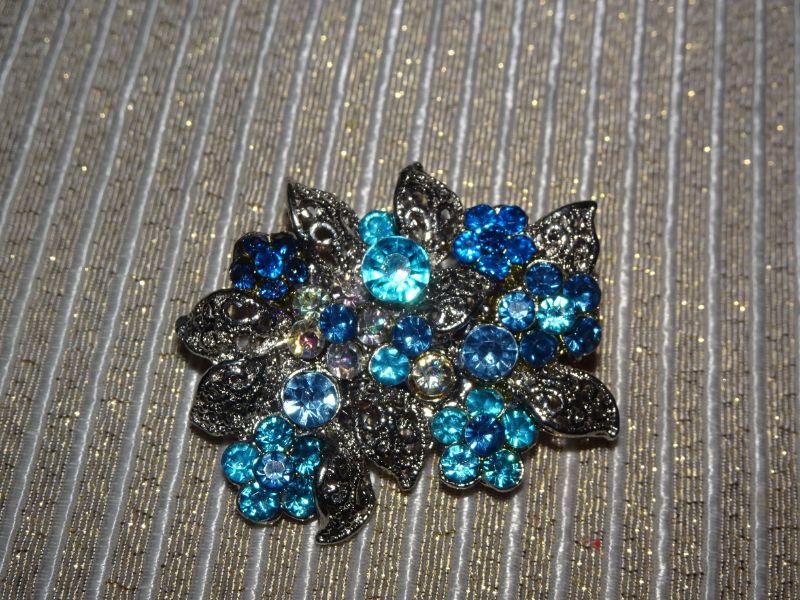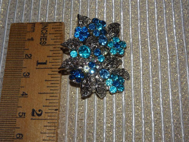 Blue & Smokey Silver Tone Rhinestone Brooch