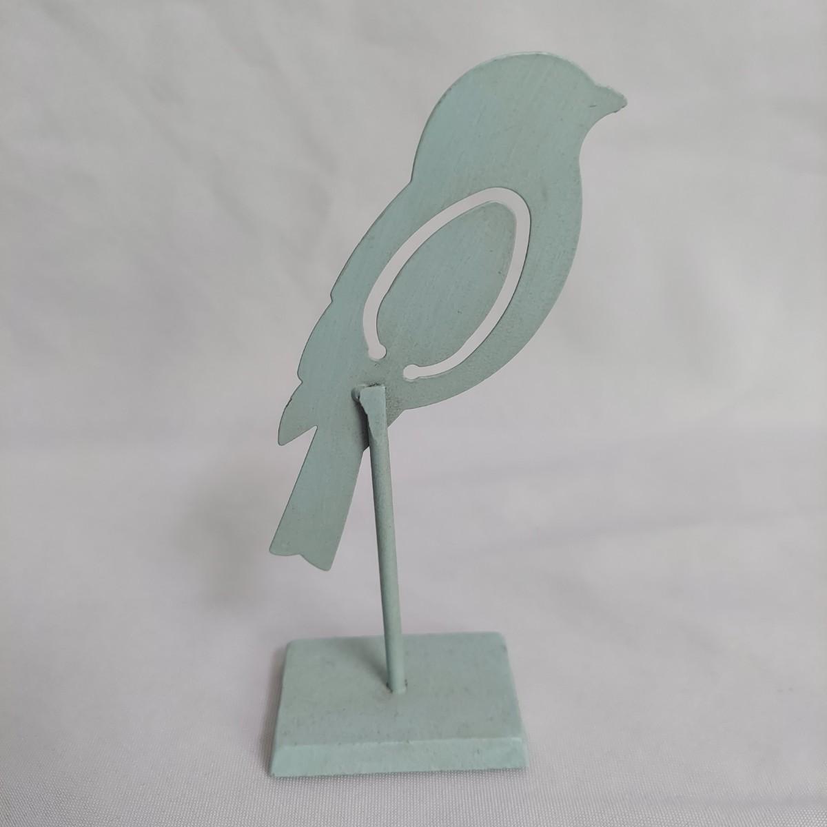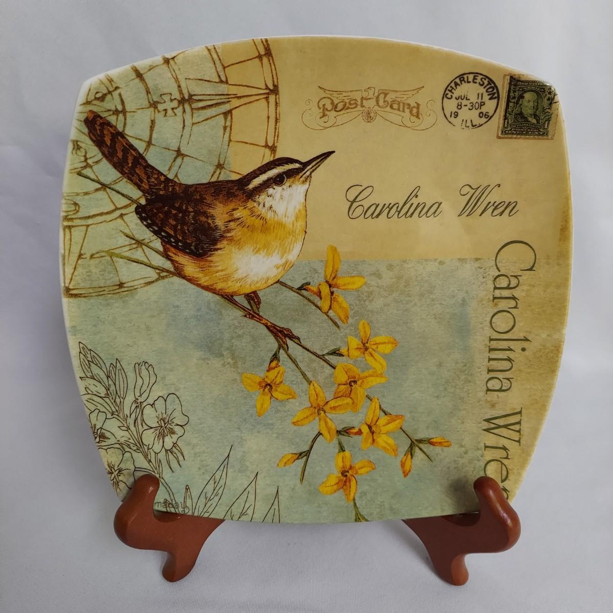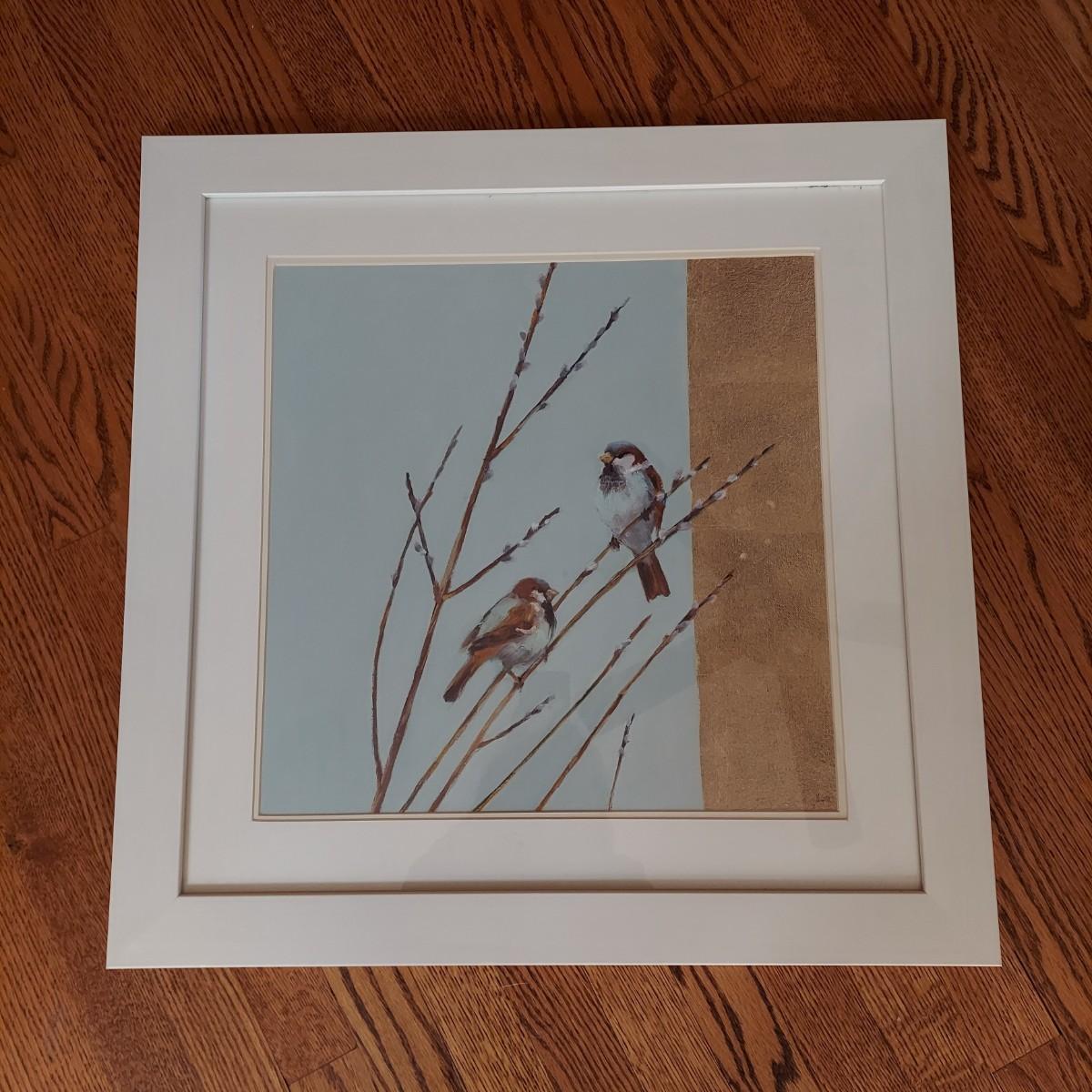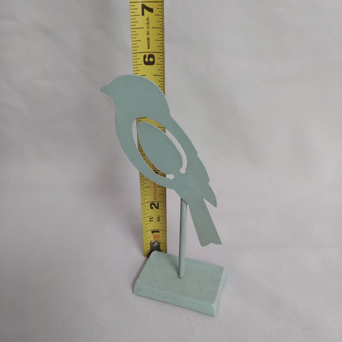 Many pieces of bird decor including a framed print of 'Blue Sparrow Willow I' by Ellen Grantner. White manufactured wood frame is 25.5" x 25.5"H. Also included are an 8" Carolina Wren plate, a ceramic tea light candle holder with a crackle glaze that's 19" x 3" x 5"H, a ceramic bird figurine and a painted metal bird on a stand. Local Pickup Only.