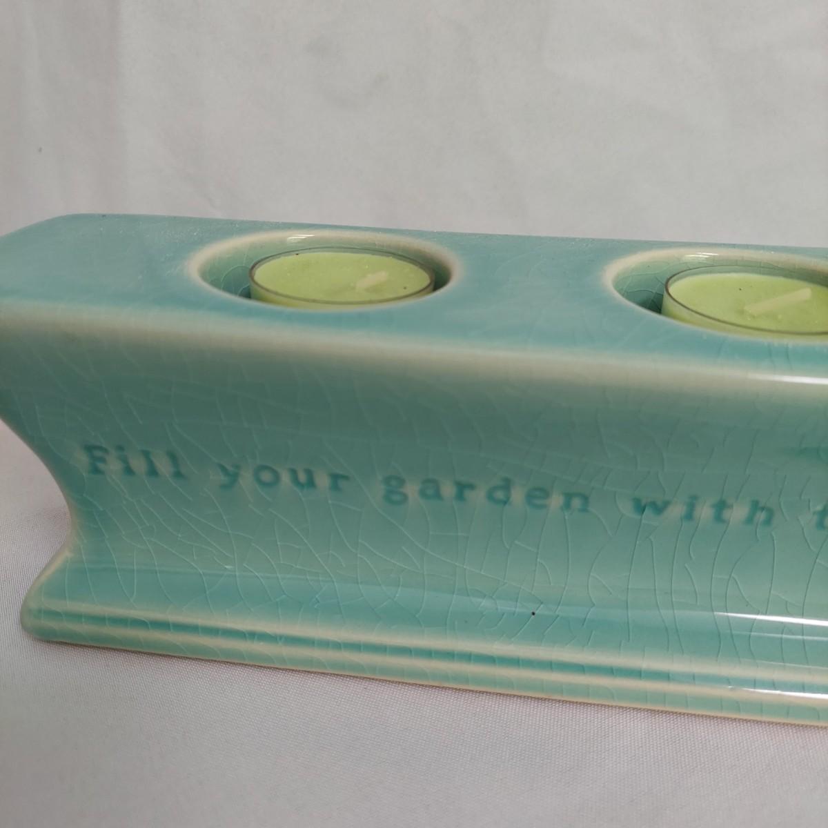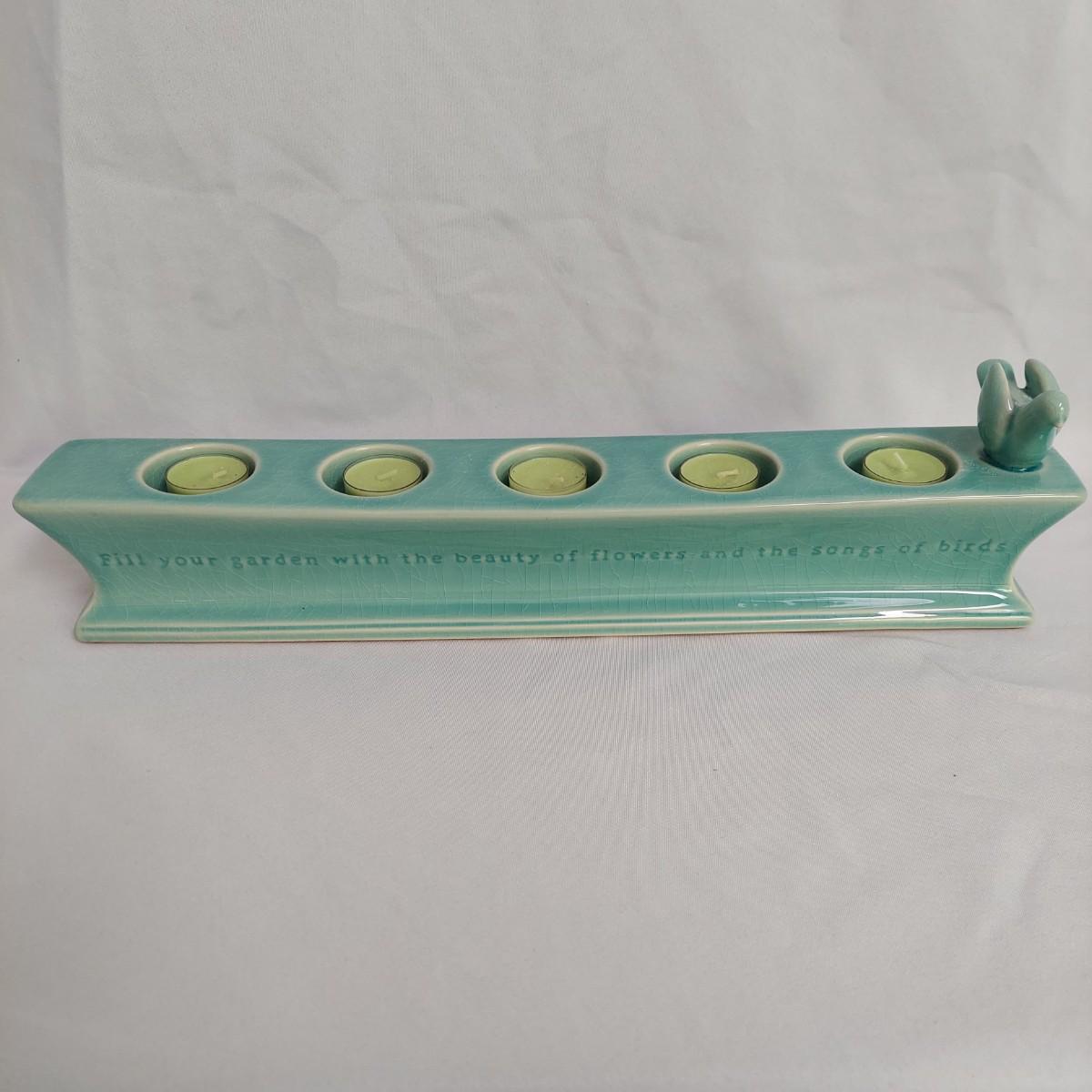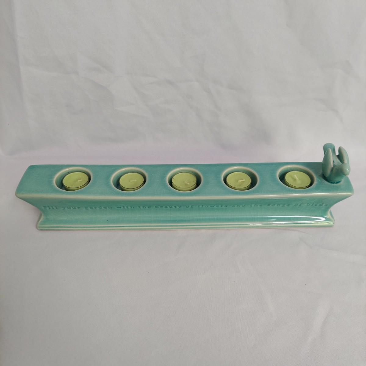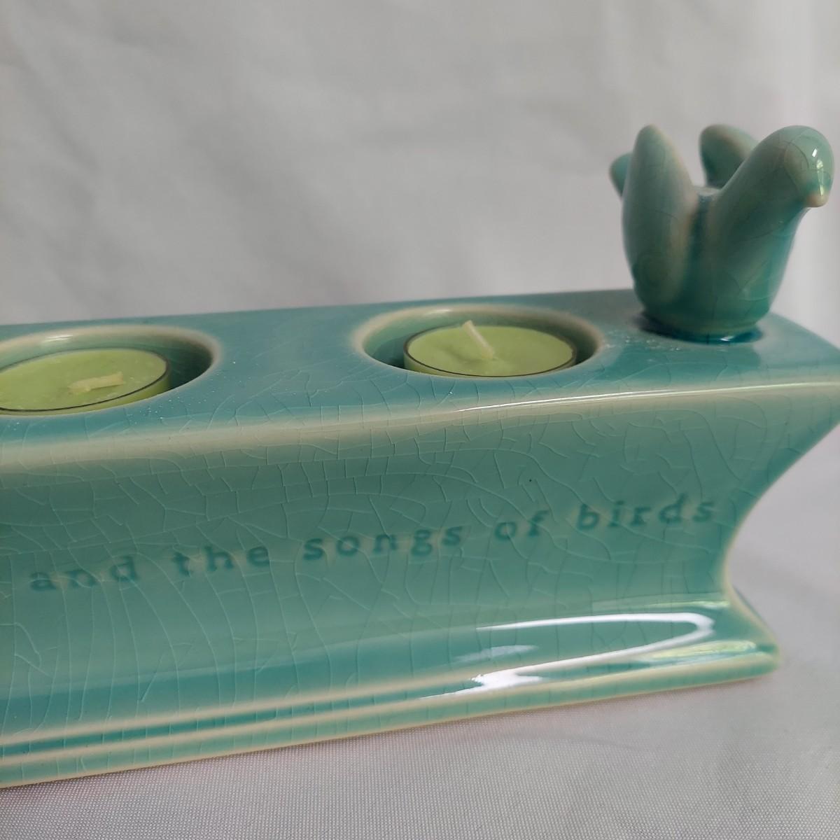 Many pieces of bird decor including a framed print of 'Blue Sparrow Willow I' by Ellen Grantner. White manufactured wood frame is 25.5" x 25.5"H. Also included are an 8" Carolina Wren plate, a ceramic tea light candle holder with a crackle glaze that's 19" x 3" x 5"H, a ceramic bird figurine and a painted metal bird on a stand. Local Pickup Only.