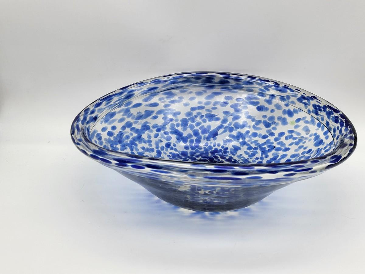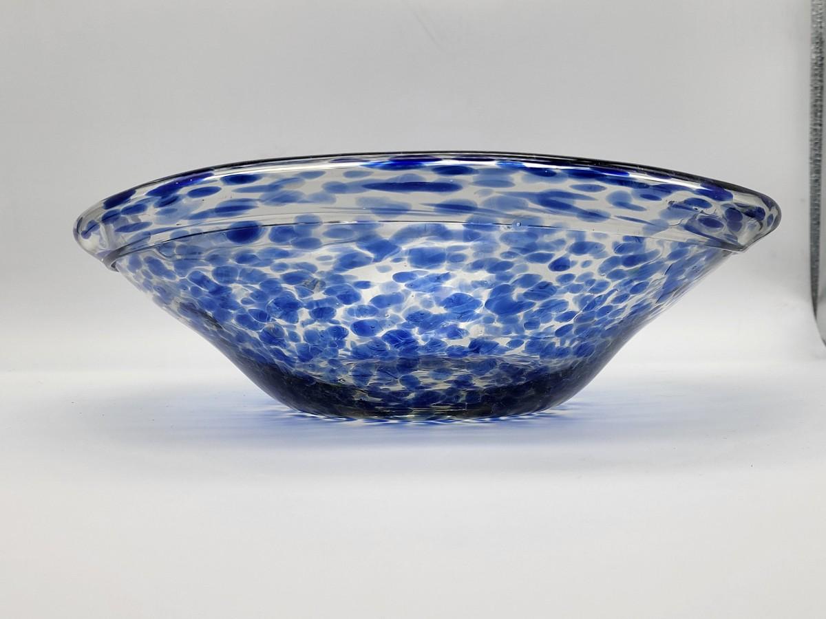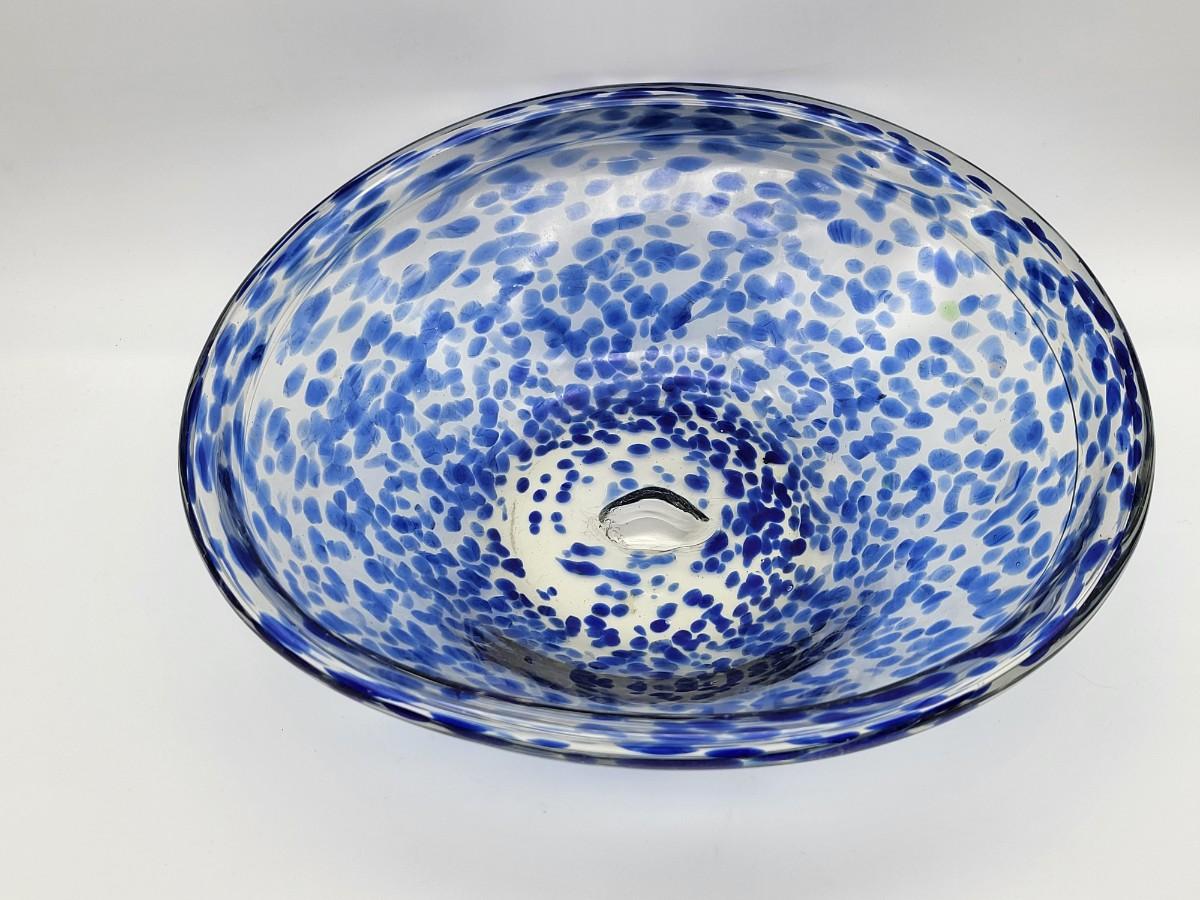 This is a gorgeous hand blown bowl which is the perfect size for fruit or to serve a salad. It is 12" across.