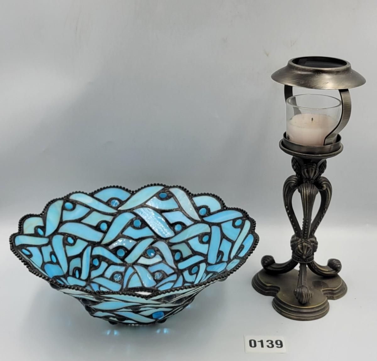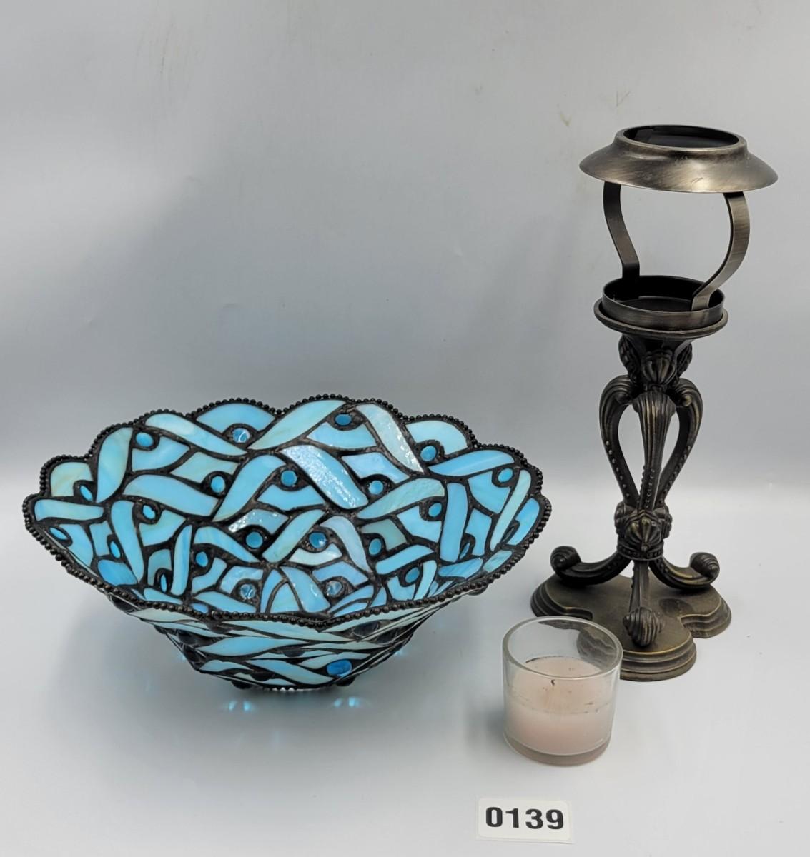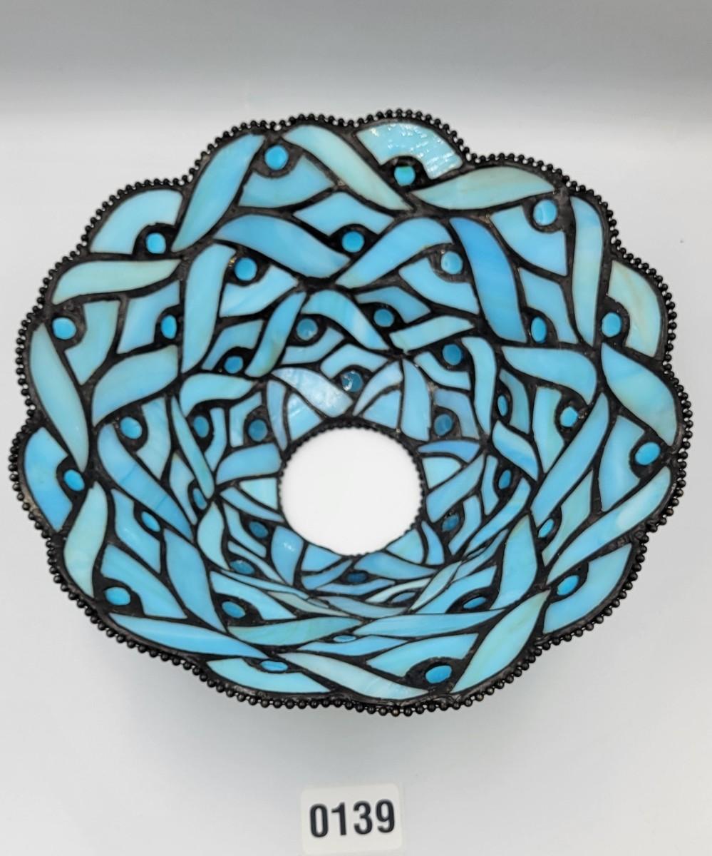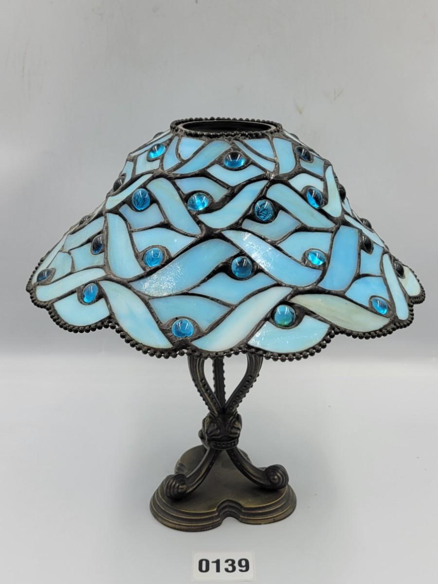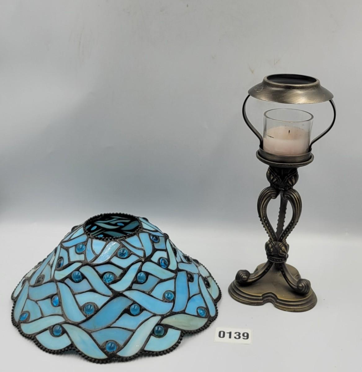 Woven stained glass pattern. Uses short votive candle or tea light candle. This is in great condition. The stain glass shade is free of any cracks, or other damage.