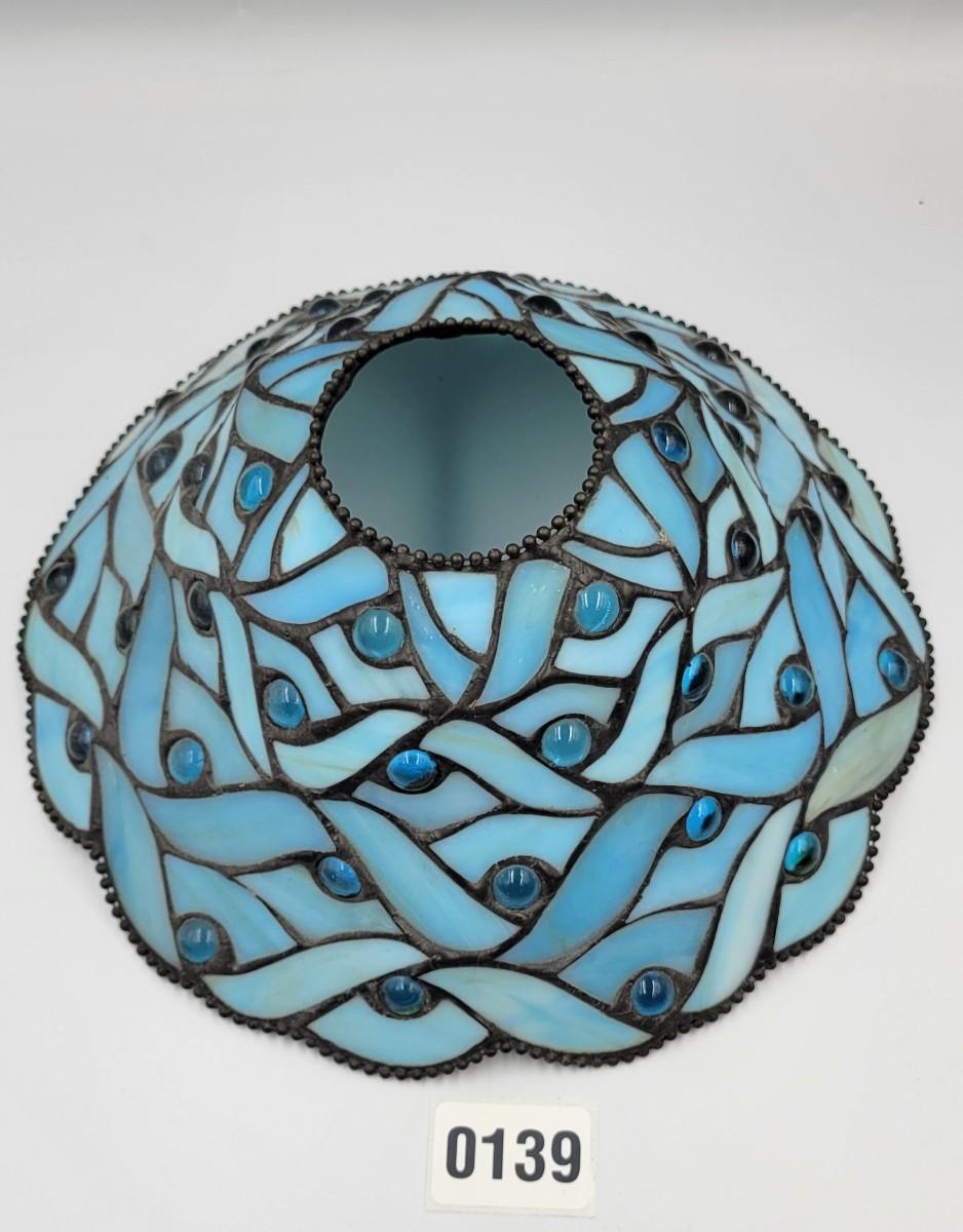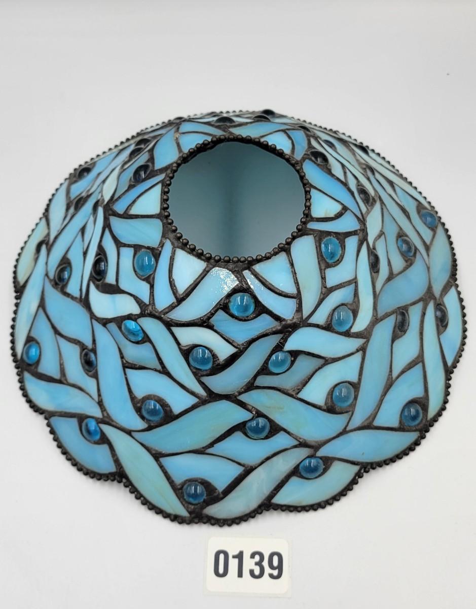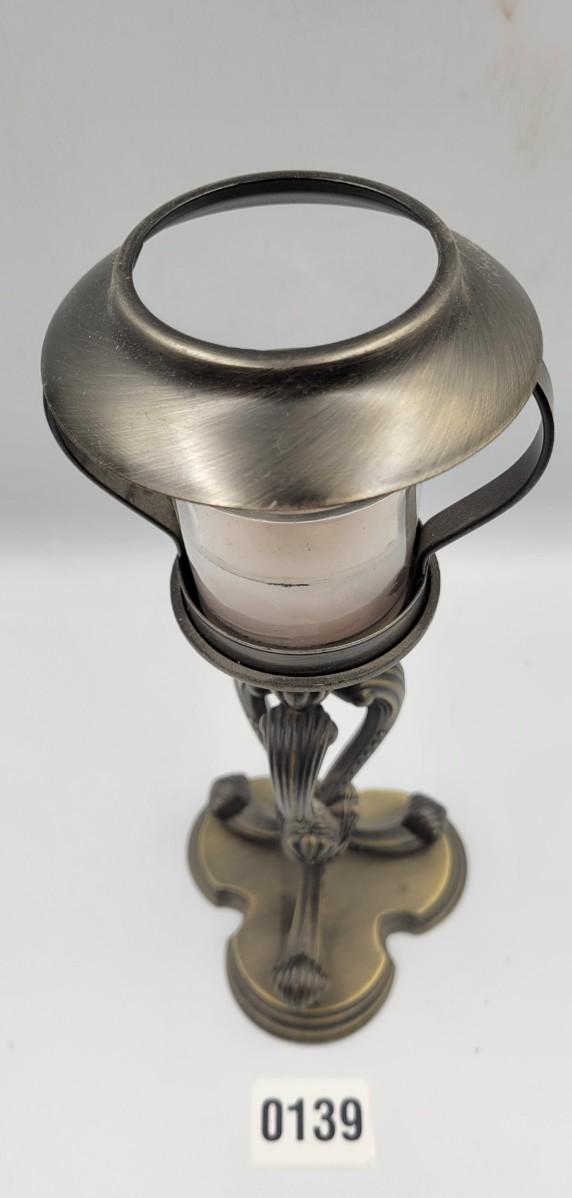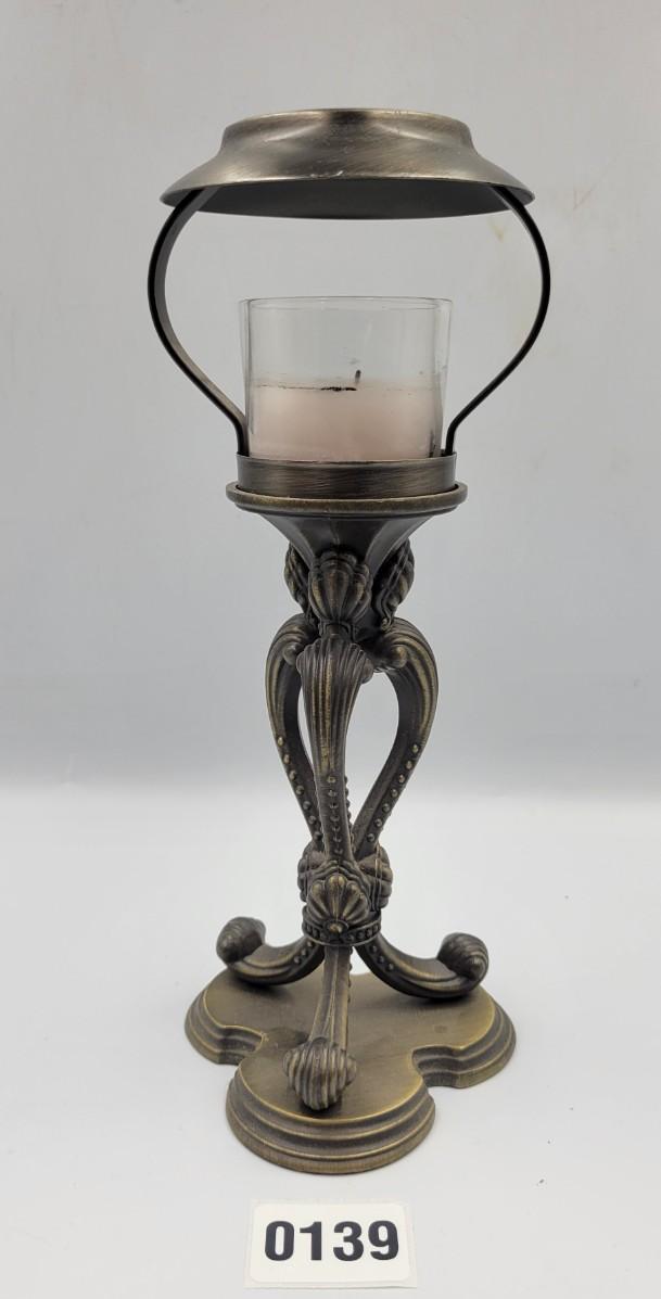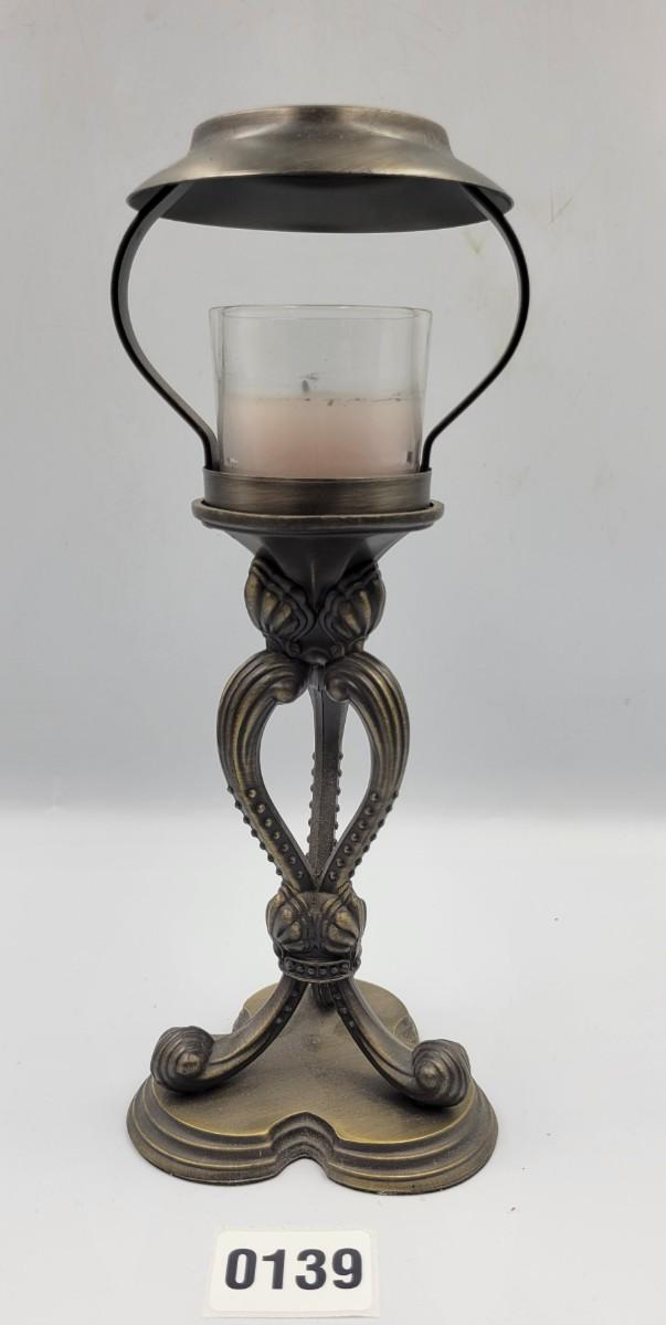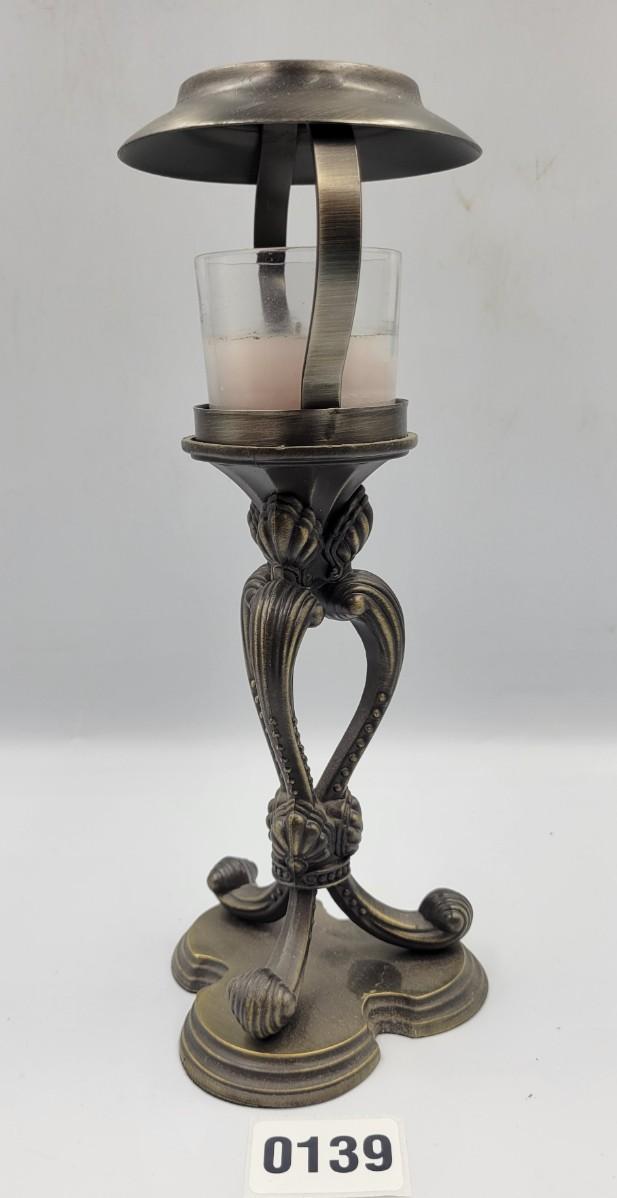 Woven stained glass pattern. Uses short votive candle or tea light candle. This is in great condition. The stain glass shade is free of any cracks, or other damage.