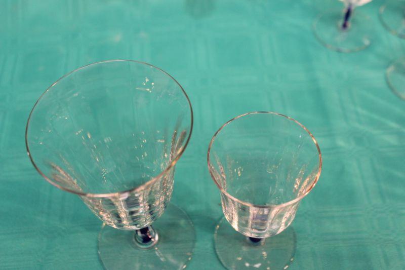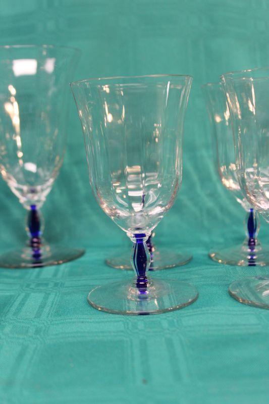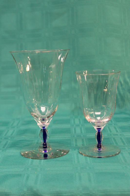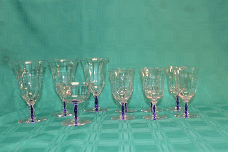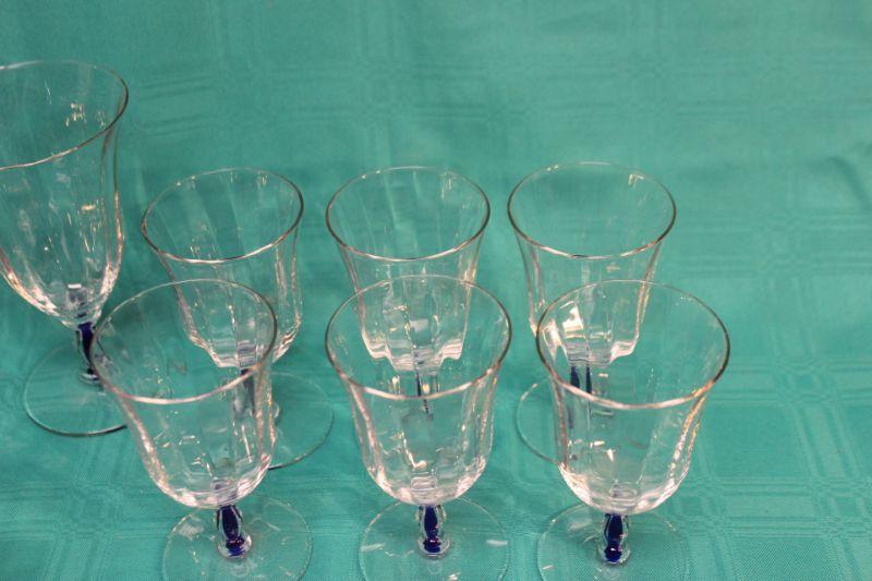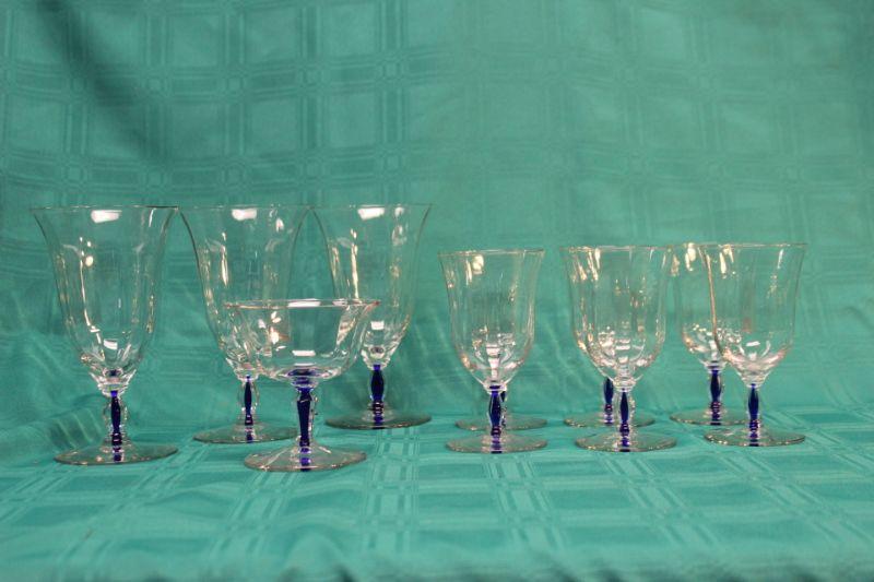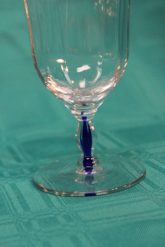 10 pieces of this blue stem glassware. 6 small glasses, 3 goblets, and 1 desert dish. Thin glass. Stem has a royal blue through the center.