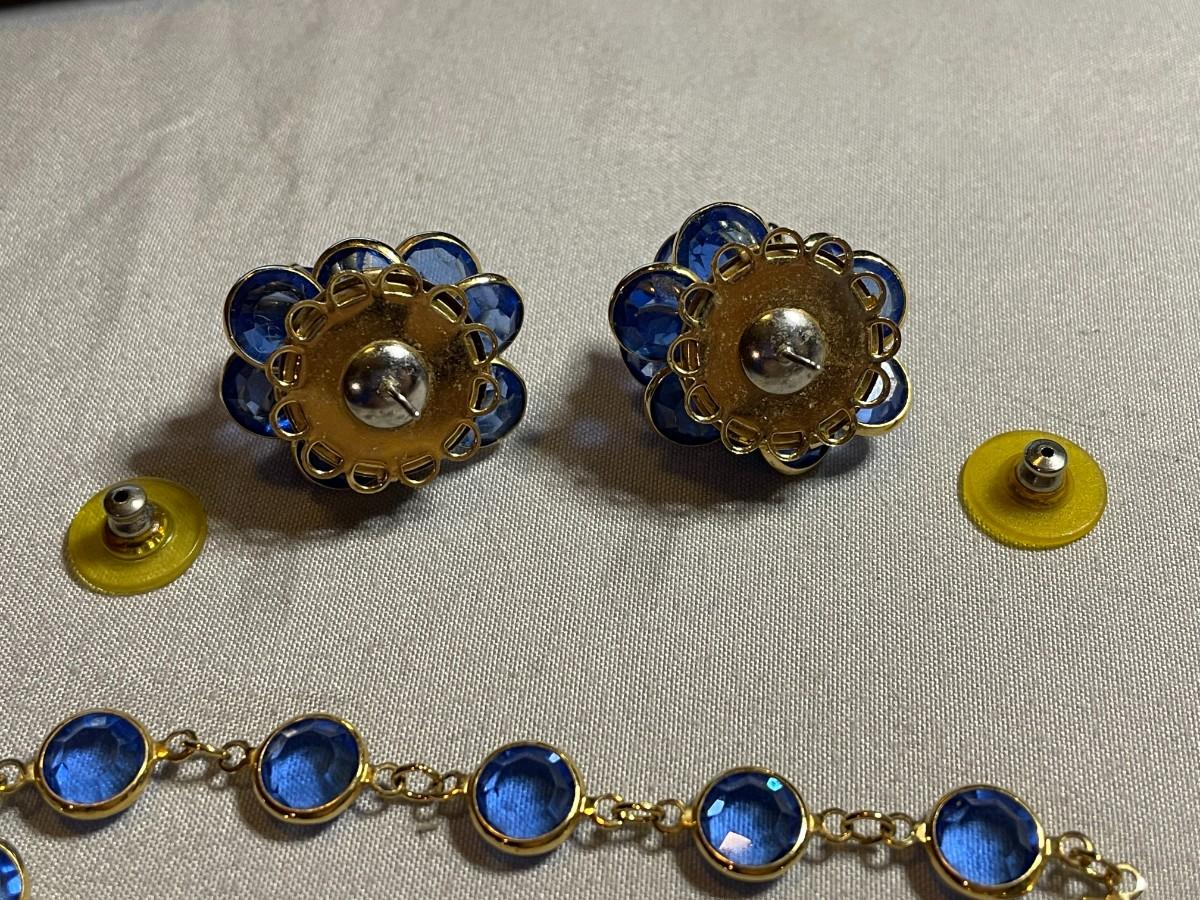 This is a pair of earrings and a bracelet from Swarovski. The bracelet is about 7.25 inches long and the earrings are for pierced ears and about 1 inch long.