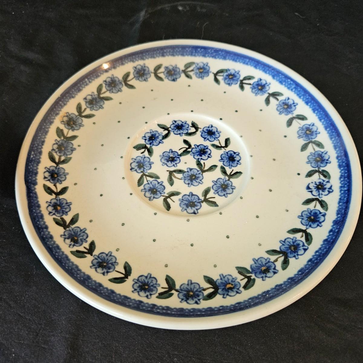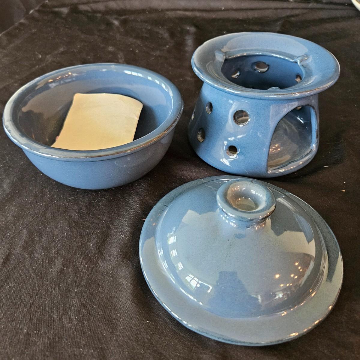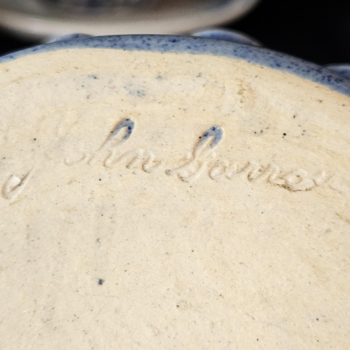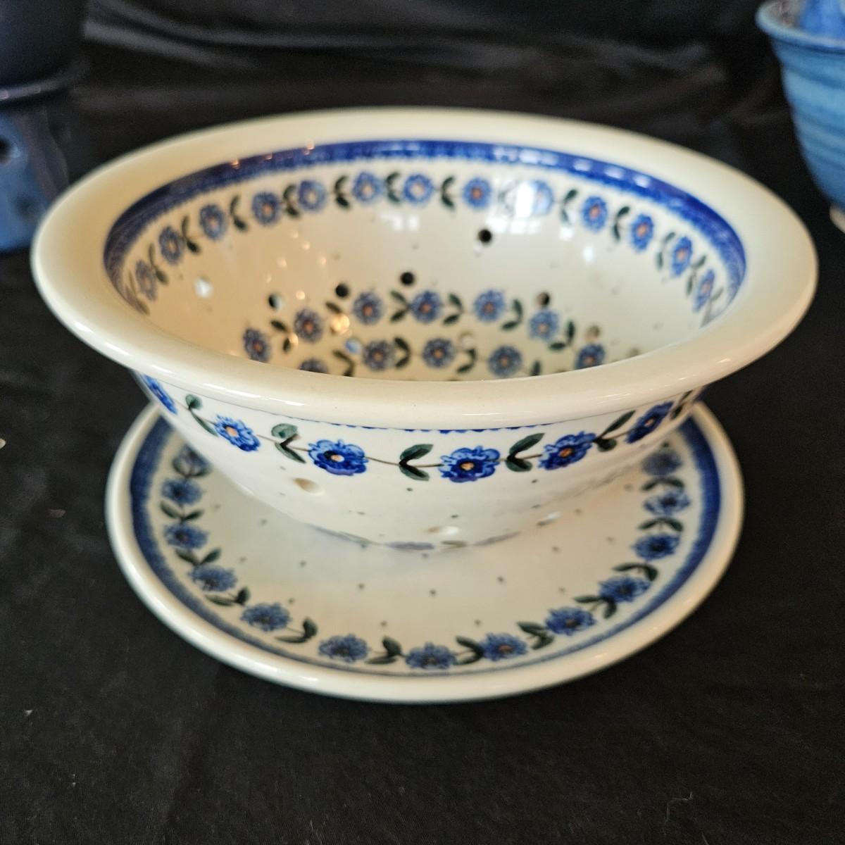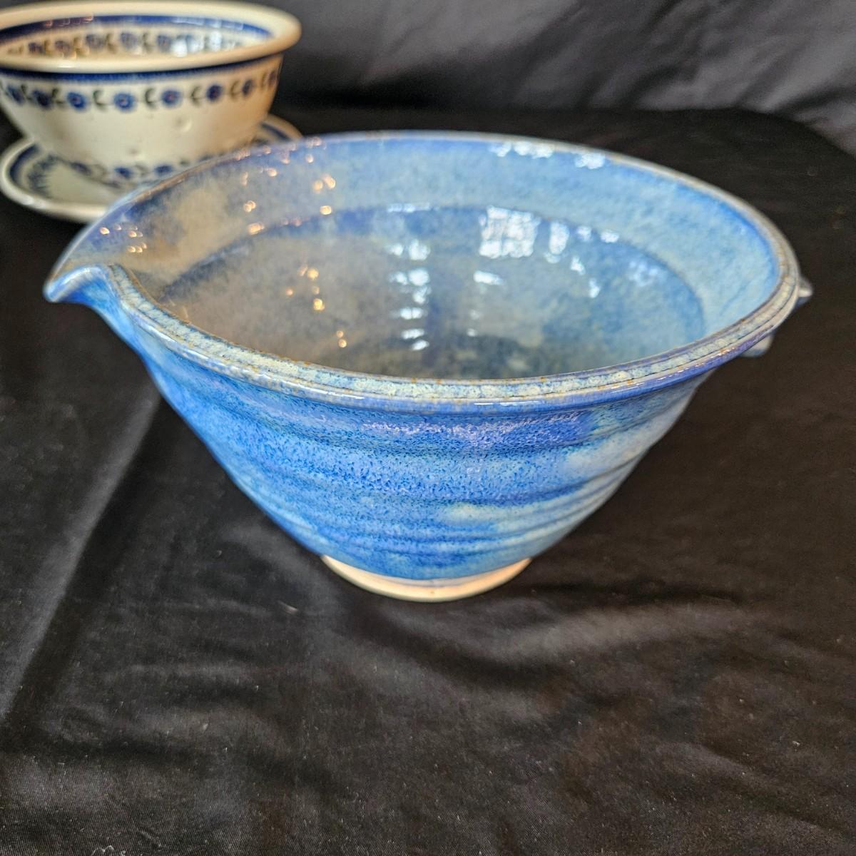 A collection of four useful kitchen pottery pieces that have a blue colored theme. Two pieces are signed. The cream colored berry bowl with flowers measures approximately 8"D x 4"H. Shipping available