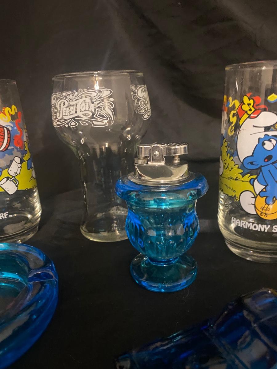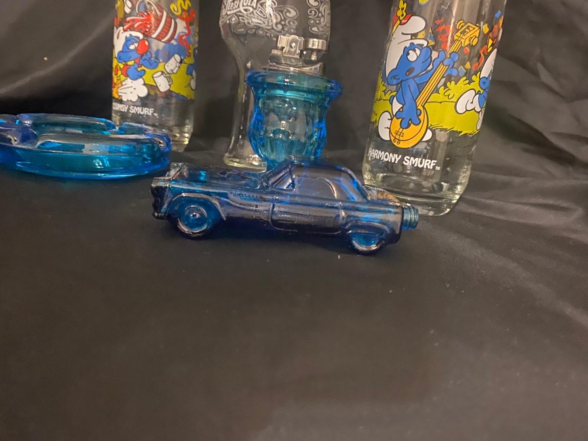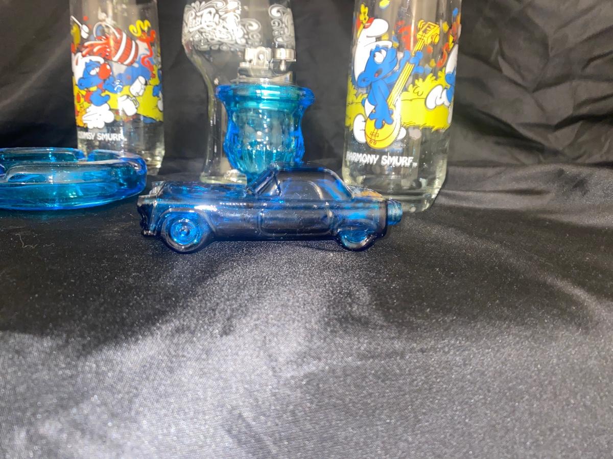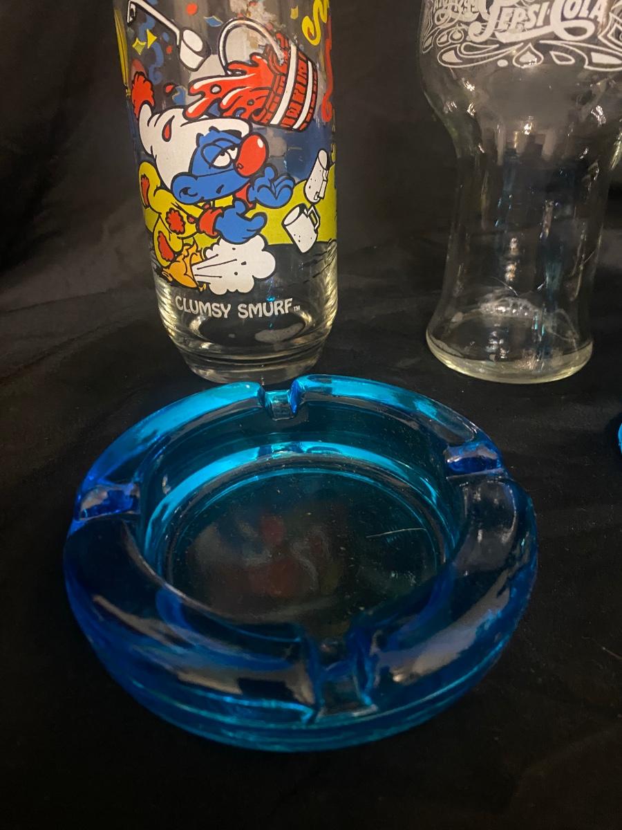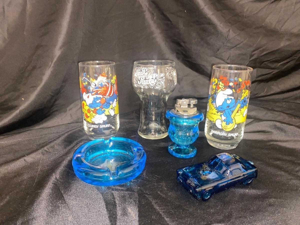 BLUE TIARA GLASS ASH TRAY AND LIGHTER, 1083 SMURFS COLLECTIBLE GLASSES, AND MORE