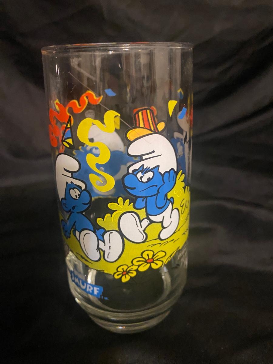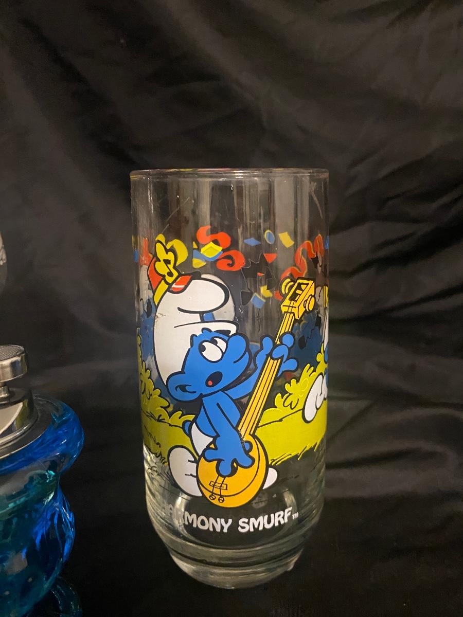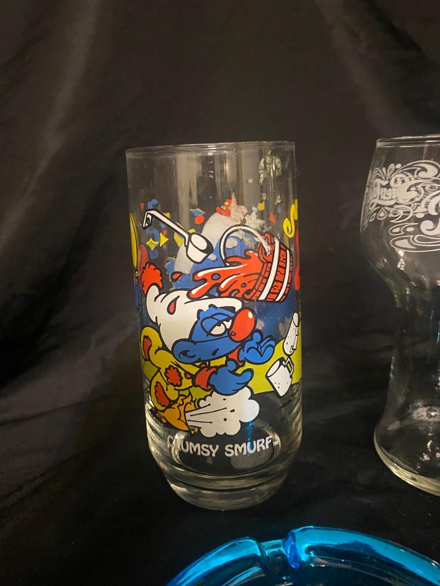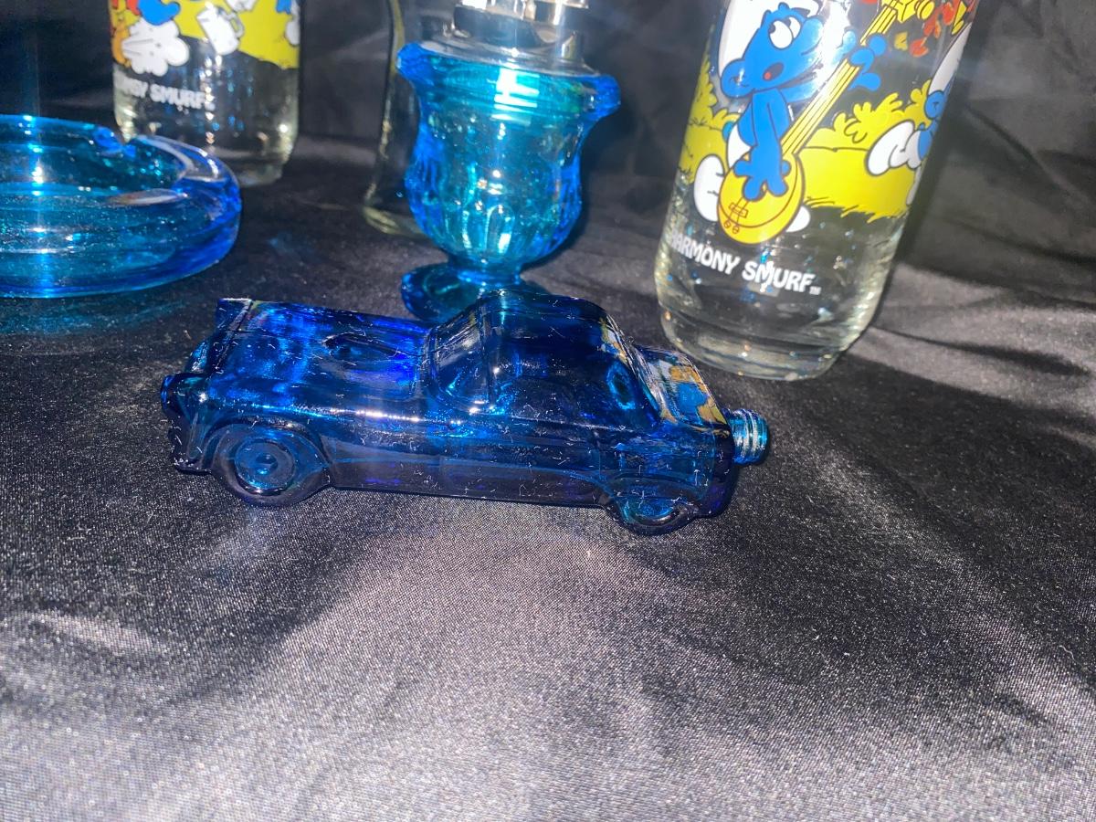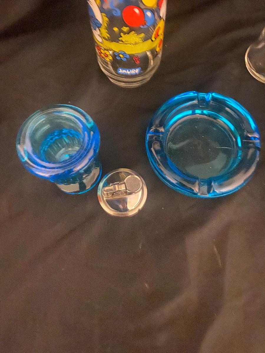 BLUE TIARA GLASS ASH TRAY AND LIGHTER, 1083 SMURFS COLLECTIBLE GLASSES, AND MORE