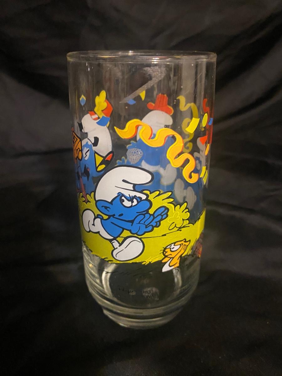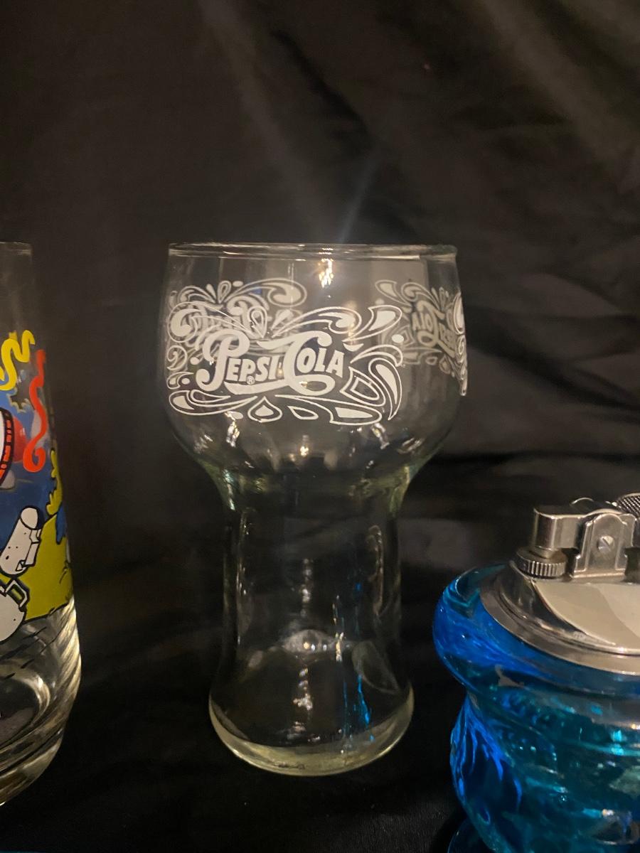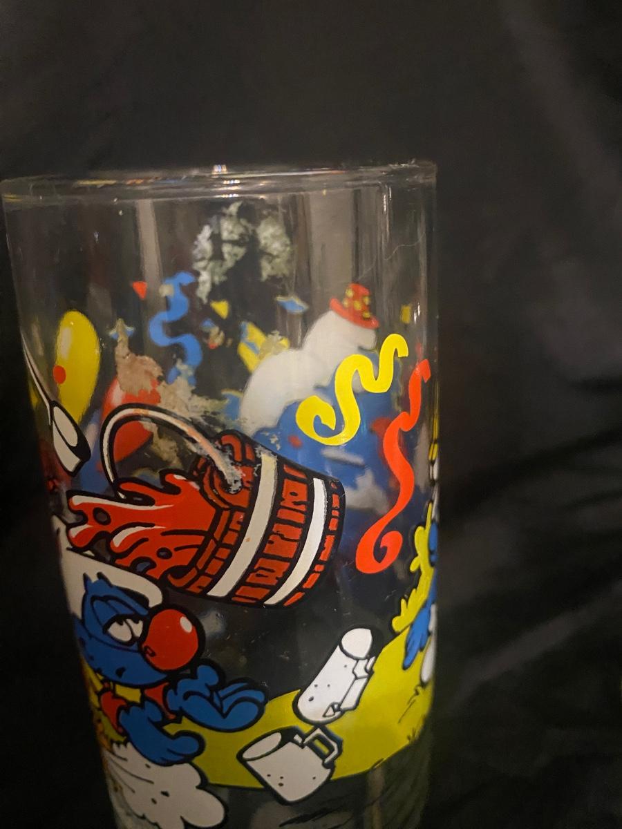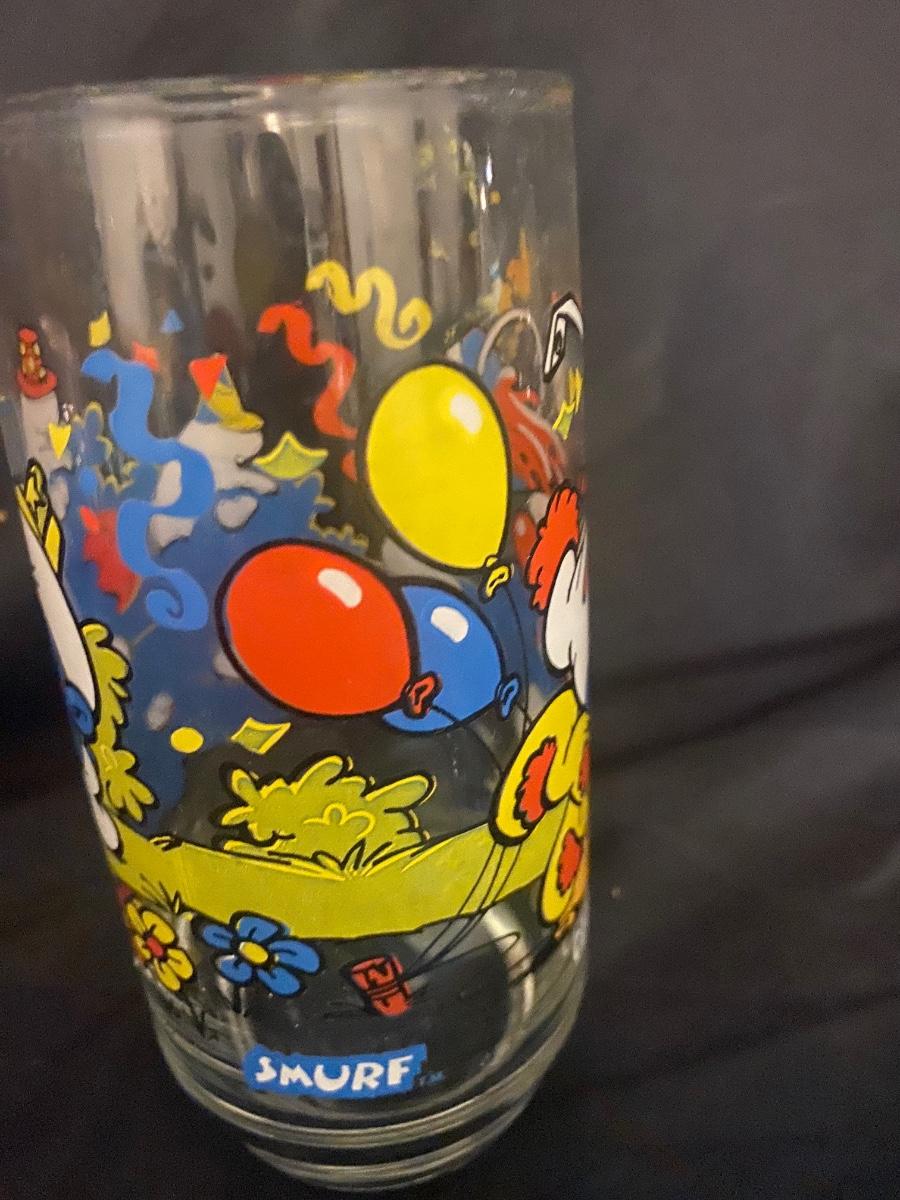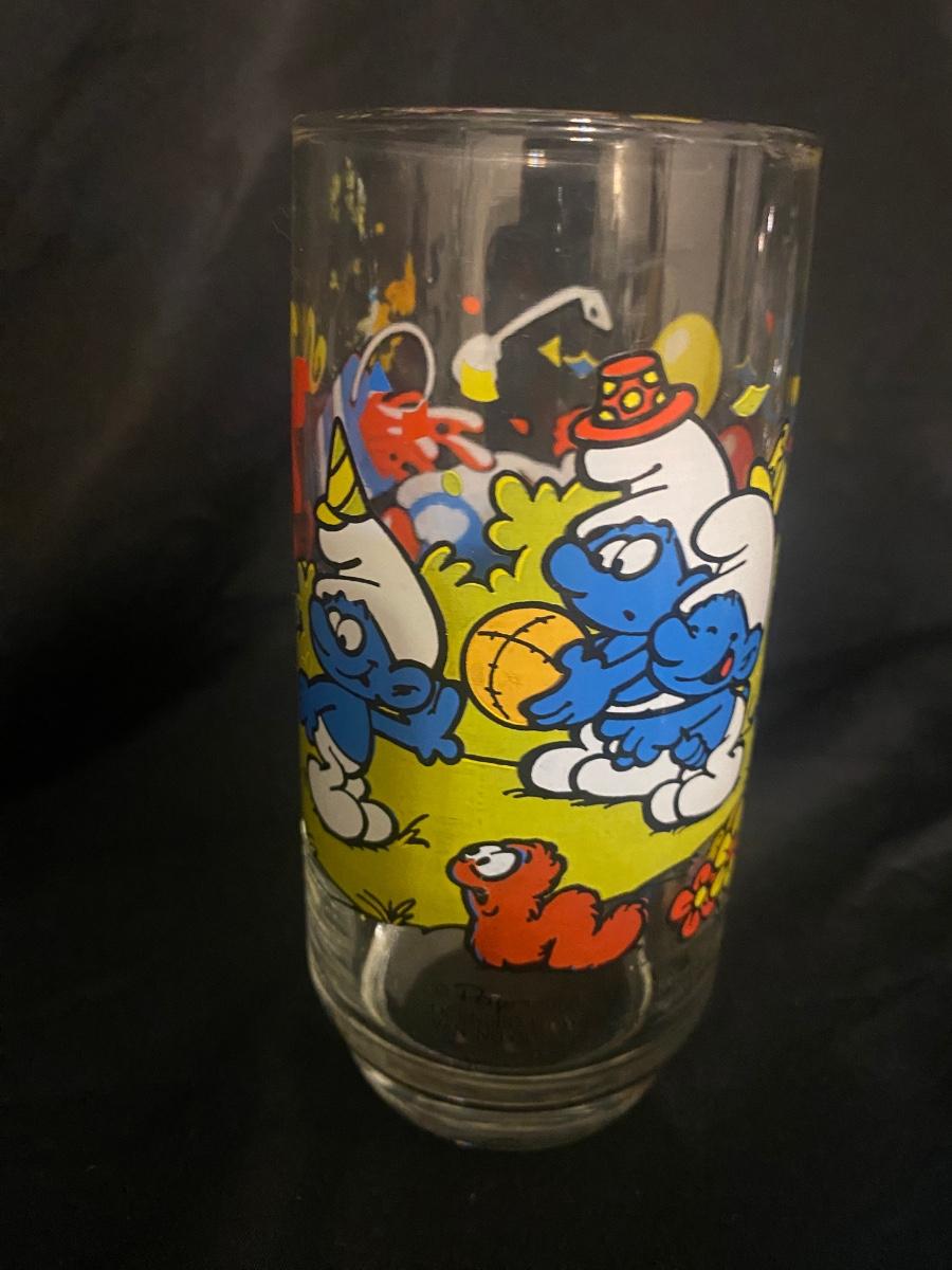 BLUE TIARA GLASS ASH TRAY AND LIGHTER, 1083 SMURFS COLLECTIBLE GLASSES, AND MORE
