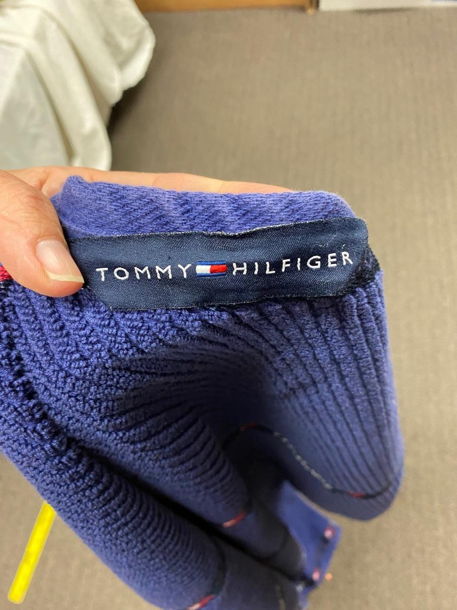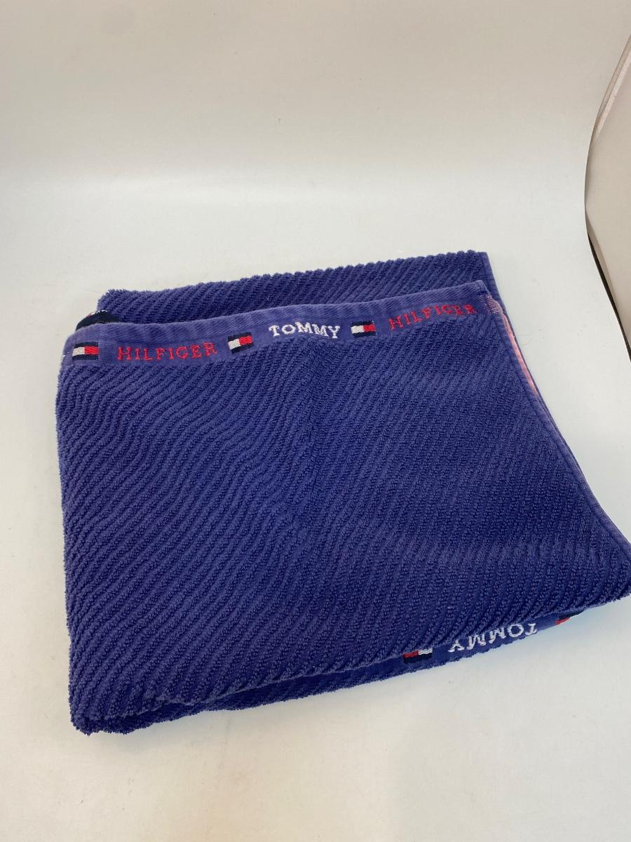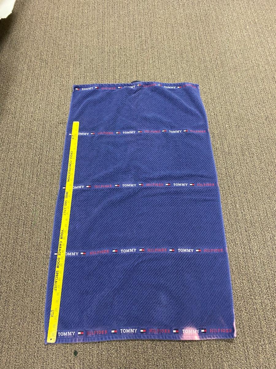 Blue Tommy Hilfiger Bath Towel. In fair condition, there is some bleaching stains at one end. Under 4' length.