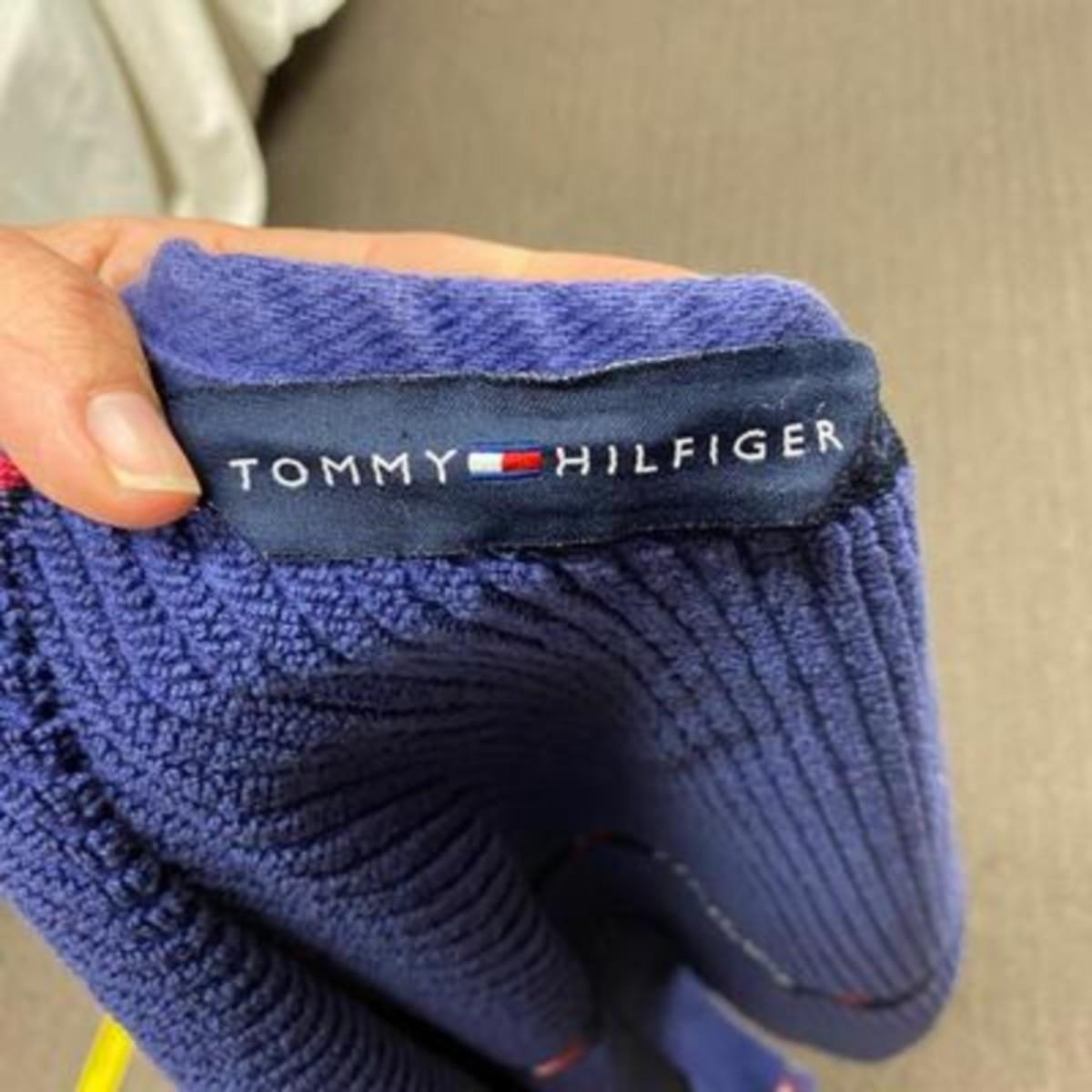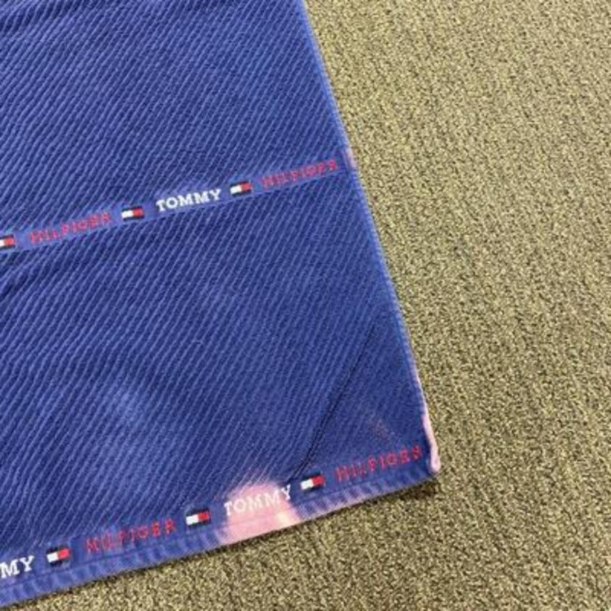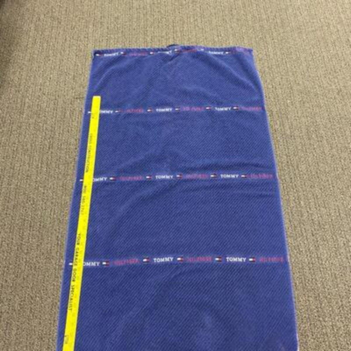 Blue Tommy Hilfiger Bath Towel. In fair condition, there is some bleaching stains at one end. Under 4' length.