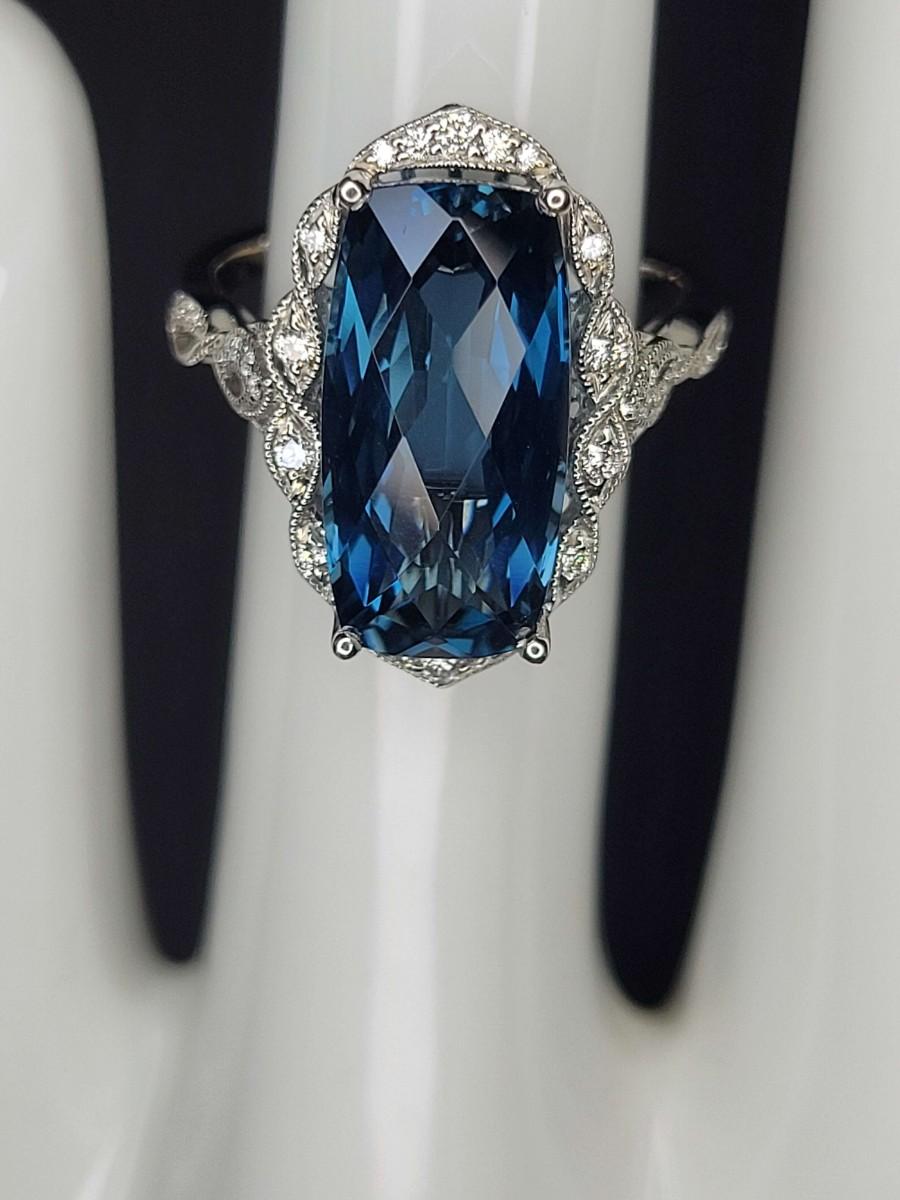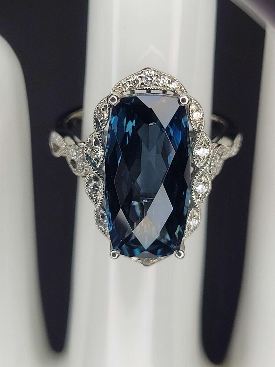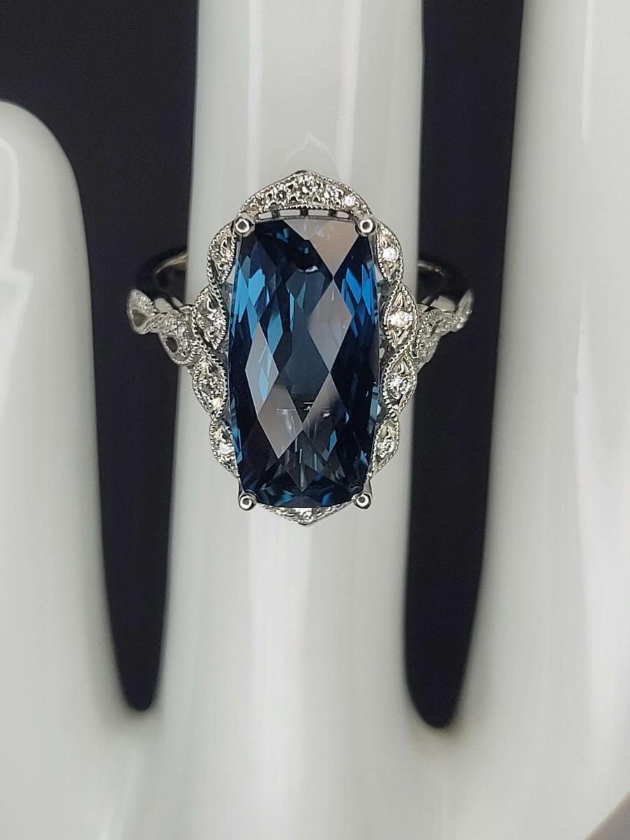 14k white gold with 6.5 Ct. cushion cut blue sapphire and 0.15 Tw. round diamonds