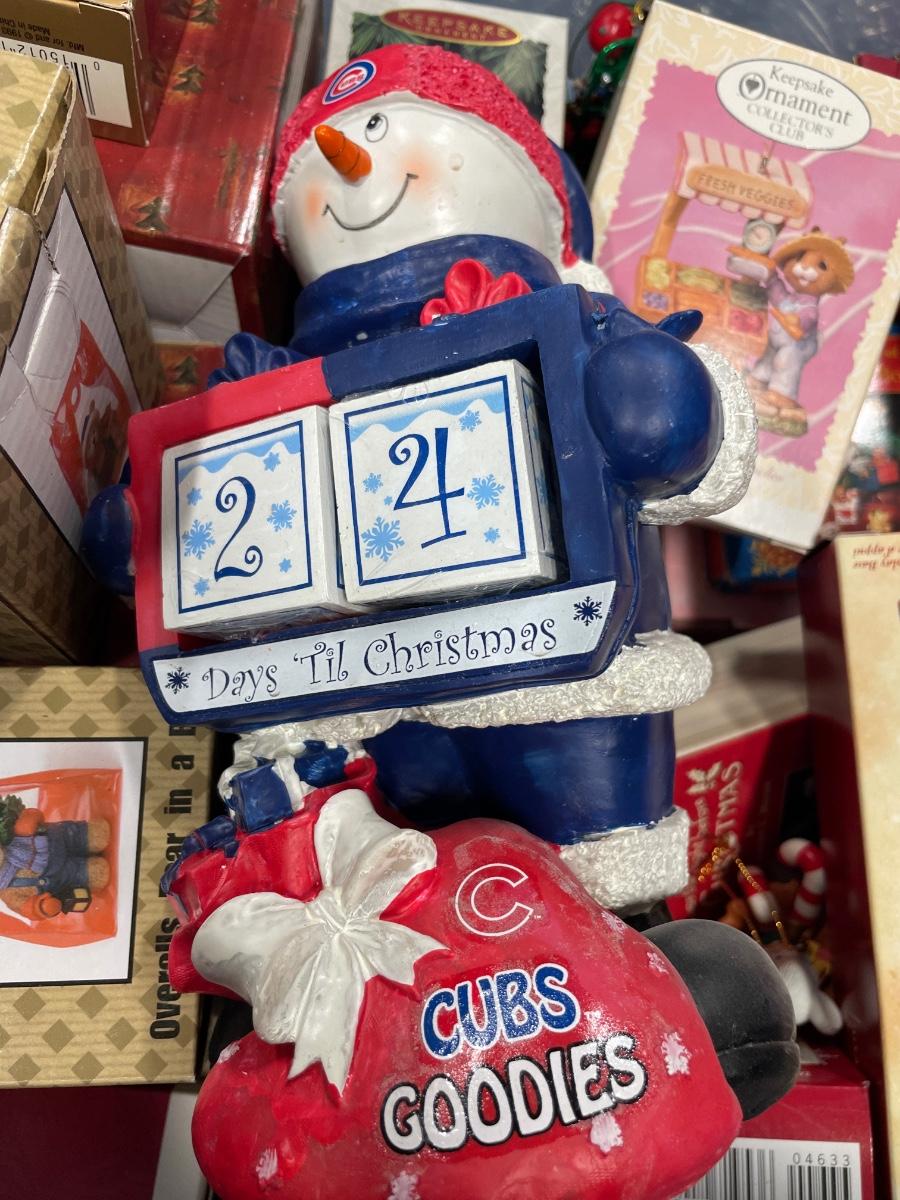 Blue tote with hallmark ornaments and cubs calendar