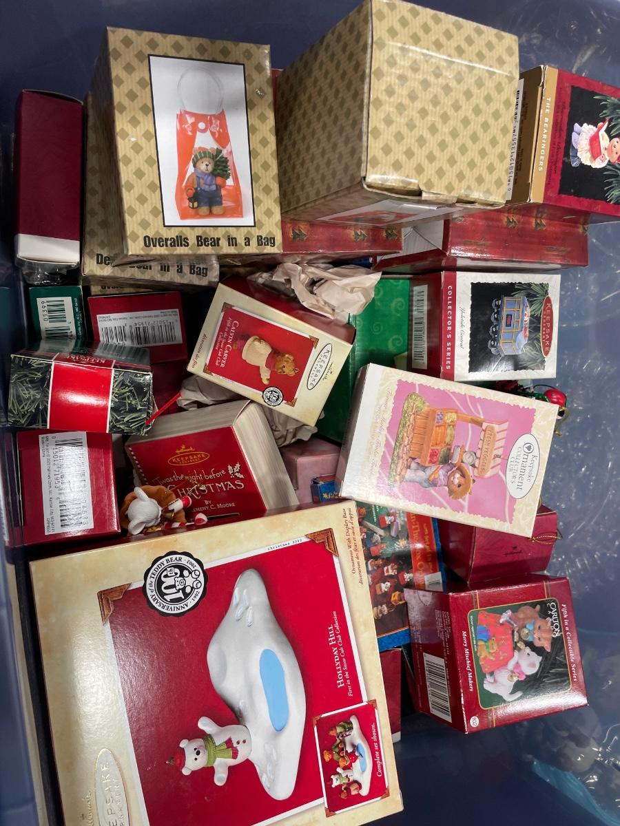 Tote with many Hallmark ornaments