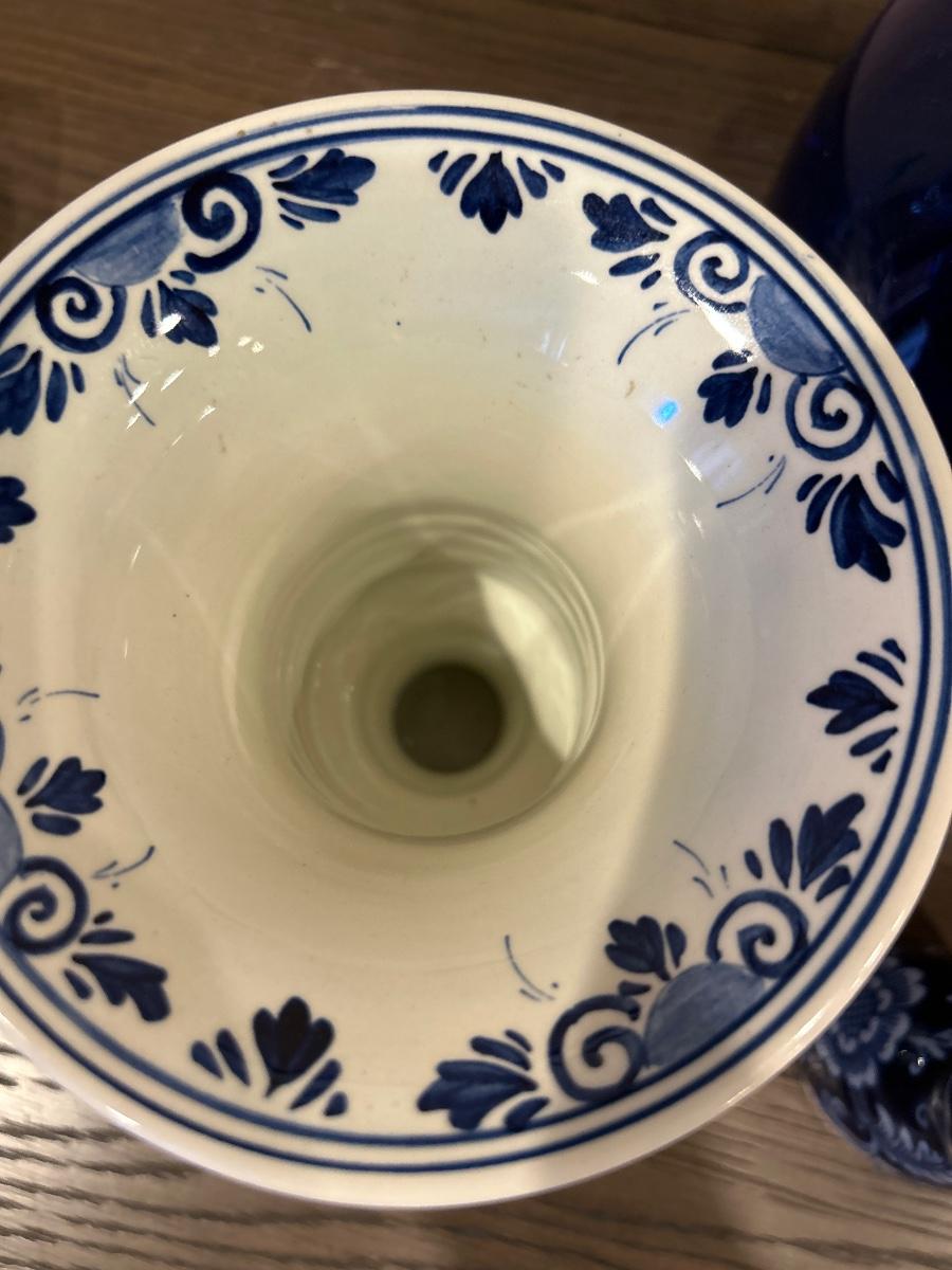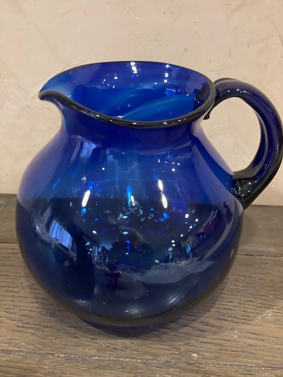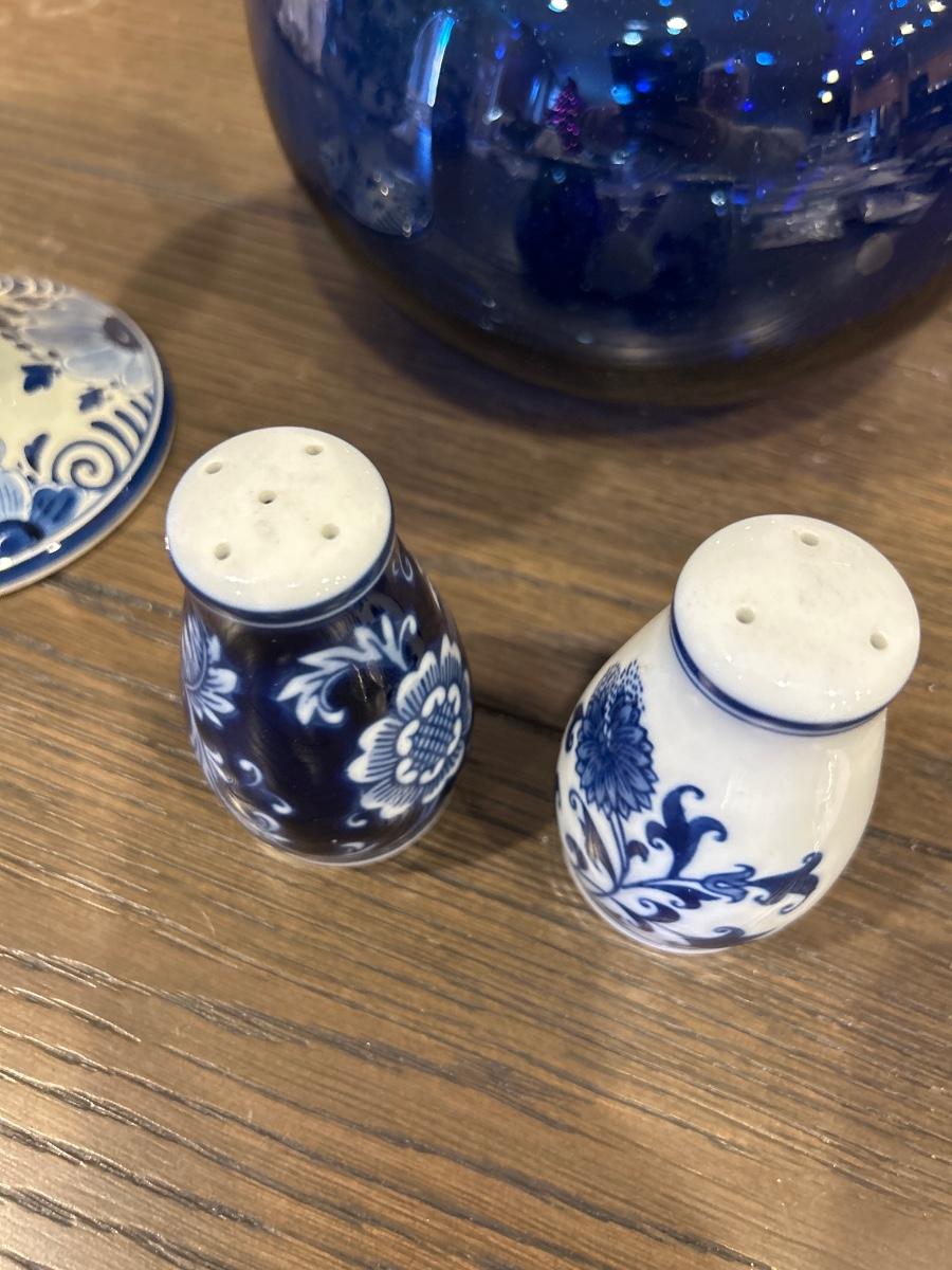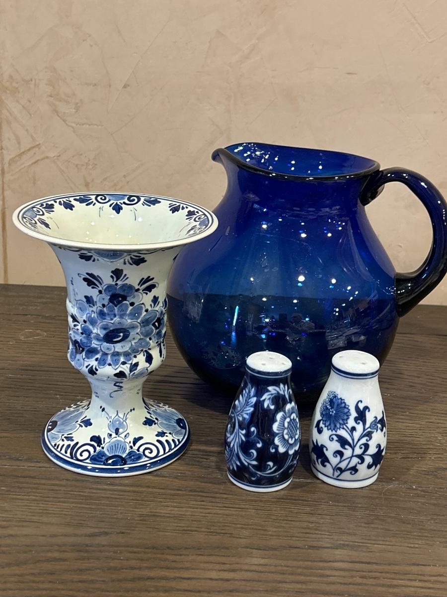 The vase is hand painted in Holland, the pitcher is an 8” cobalt blue handblown & the salt & pepper shakers are vintage Pier 1.