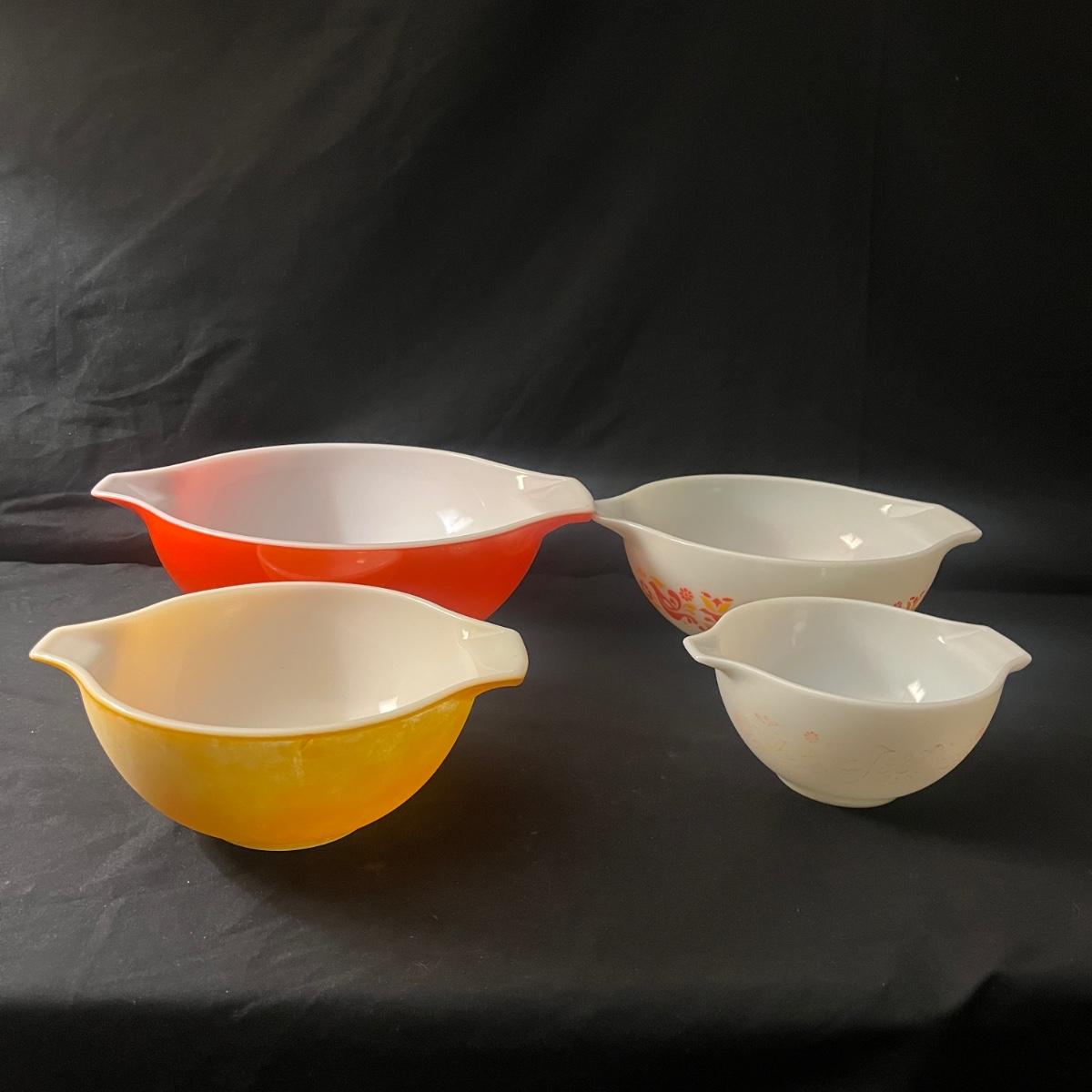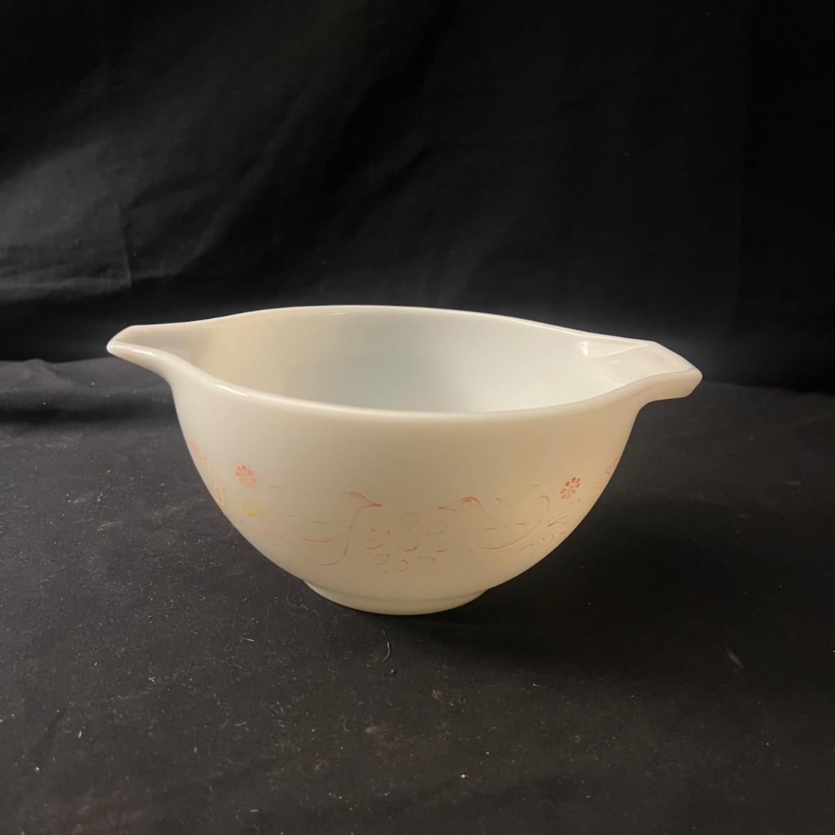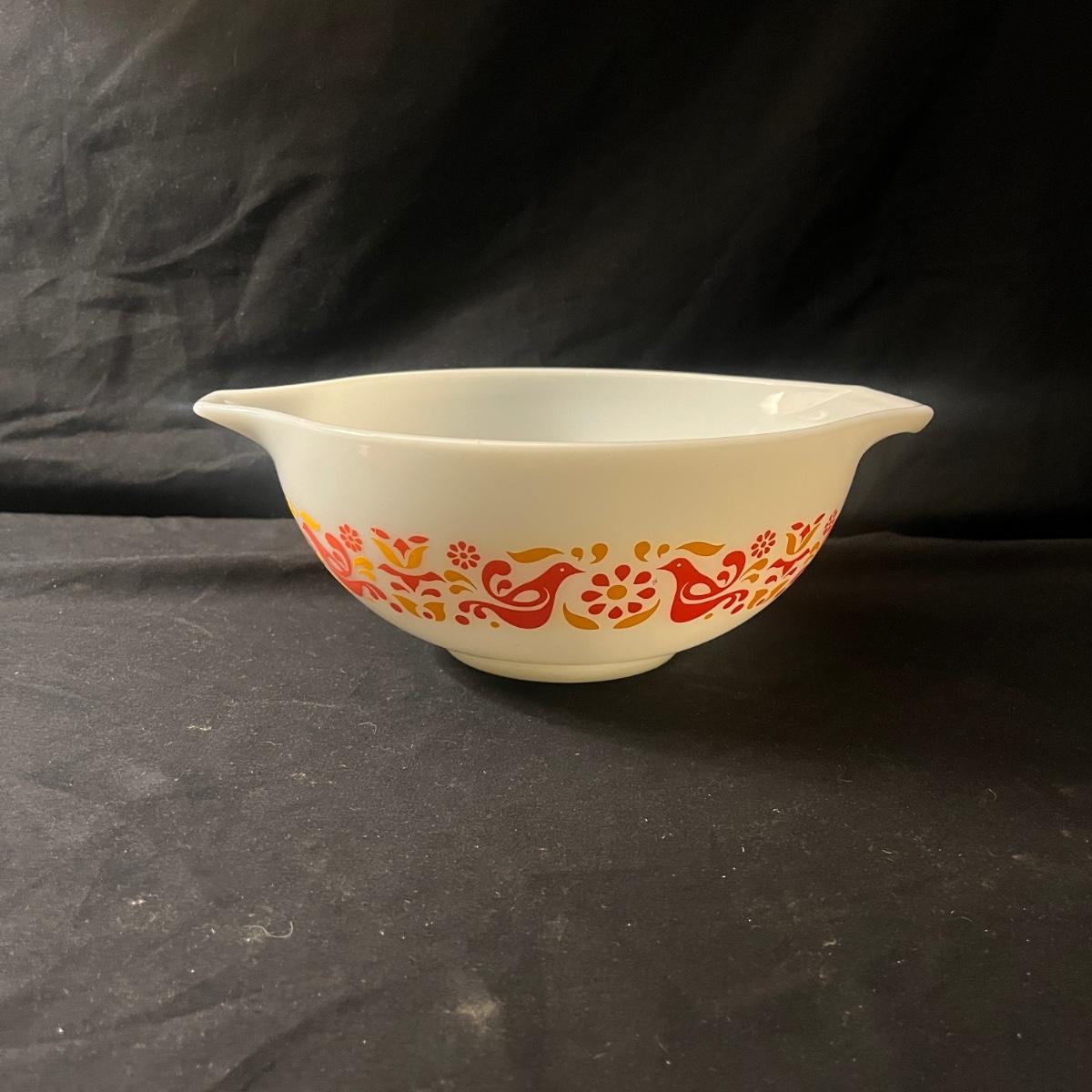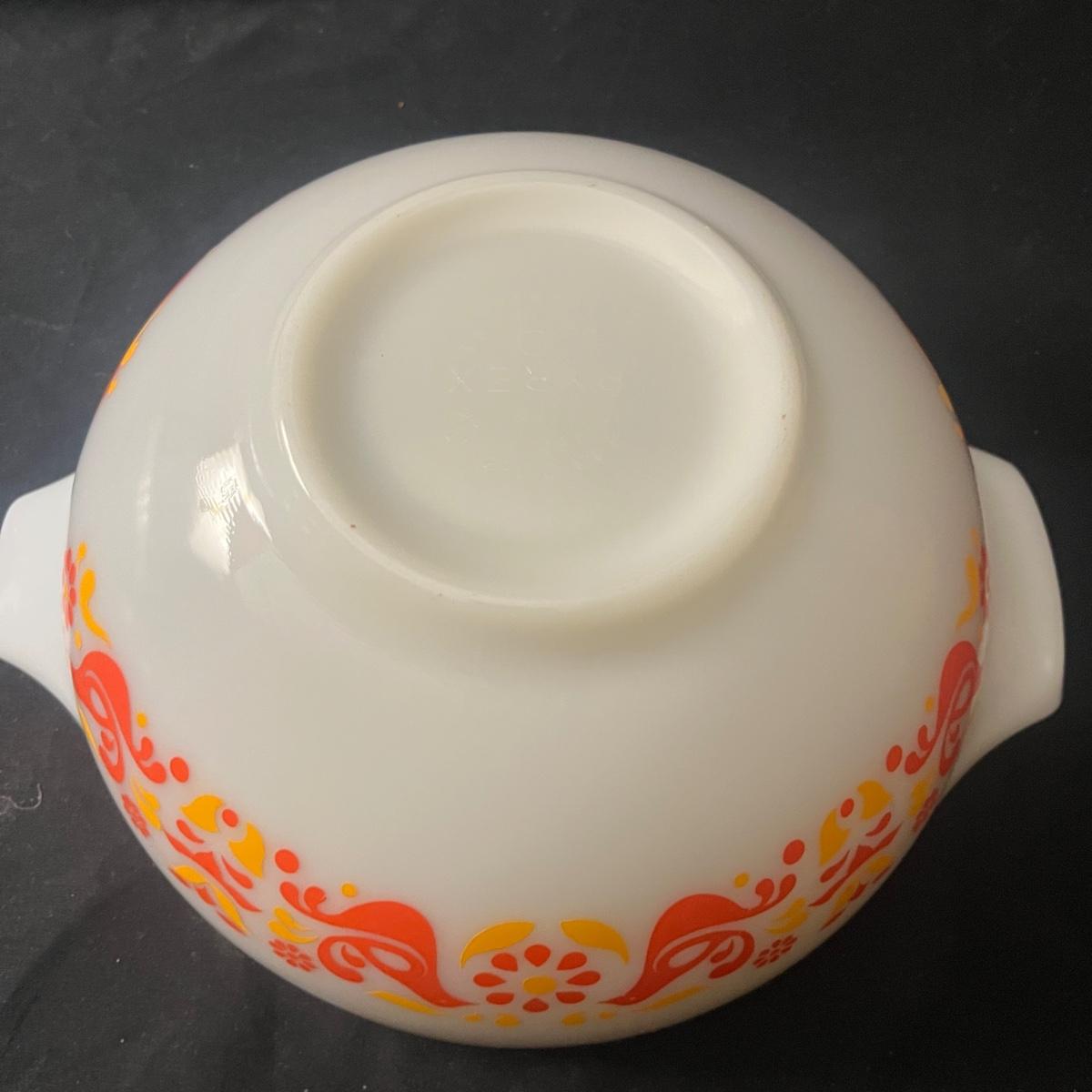 Lot includes one Blue Tulip patter oval Pyrex dish with lid, one Friendship pattern Pyrex bowl and three more Pyrex bowls with one solid and one pattern bowl very faded, see pictures. Largest bowl measures 13” x 10.5” x 4.5”H.