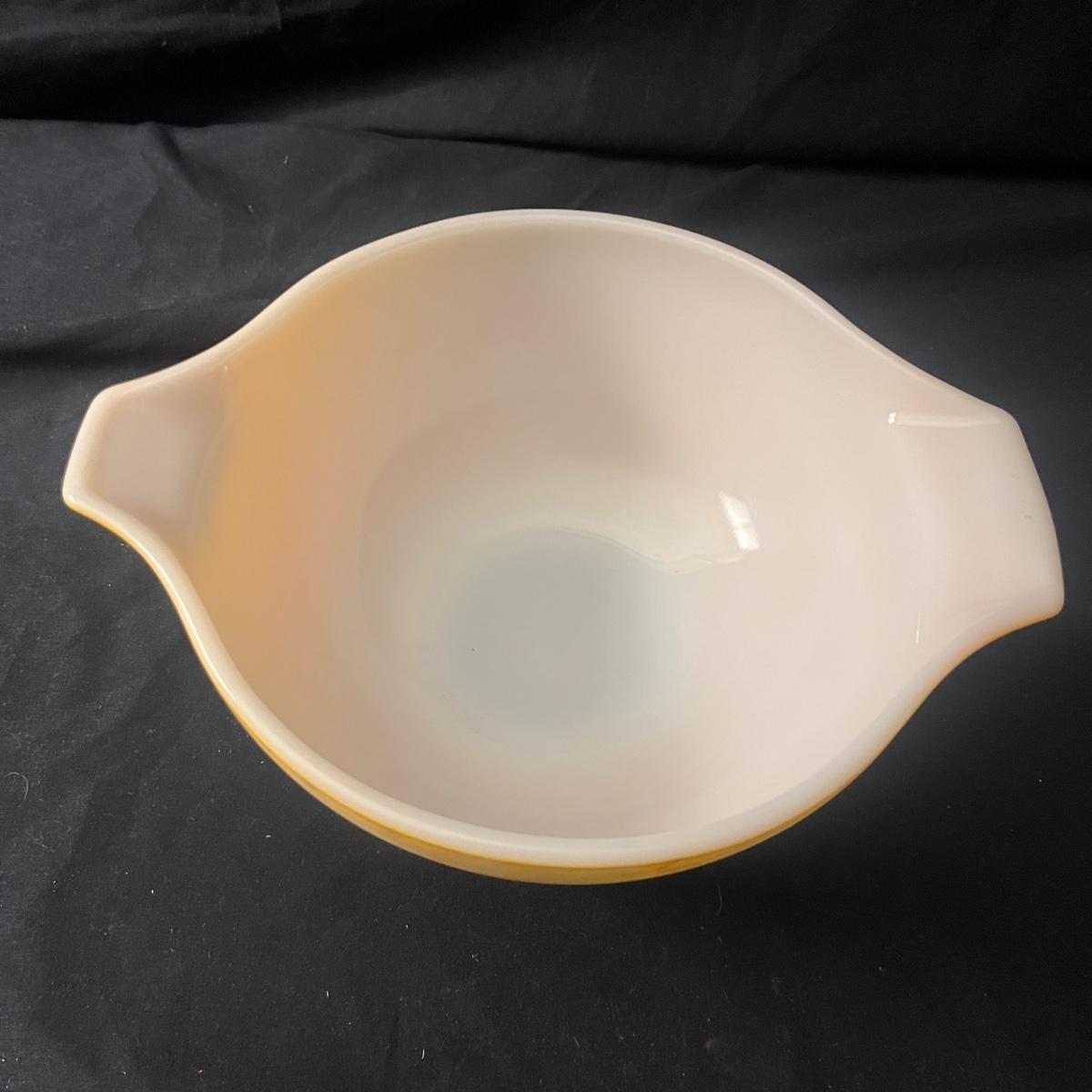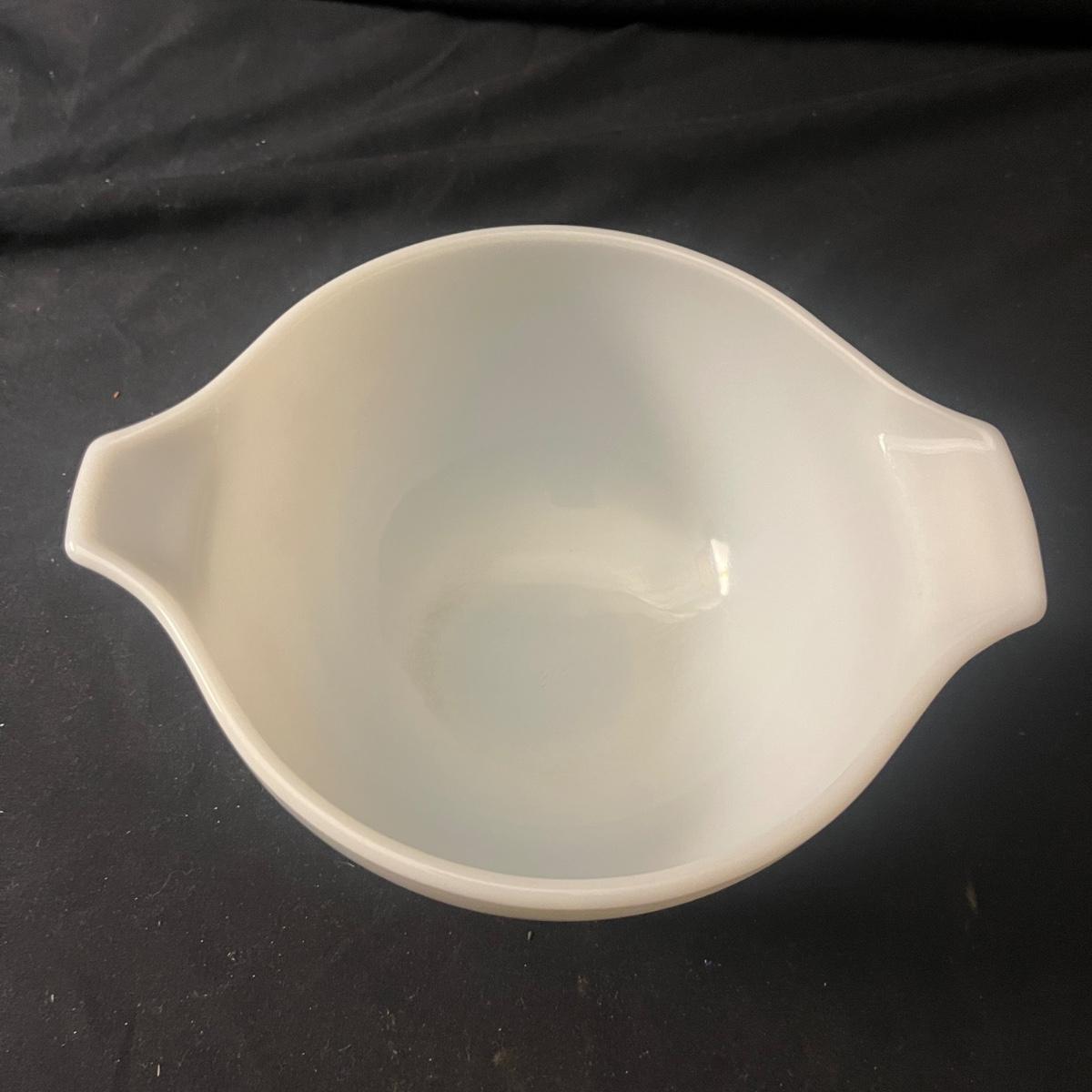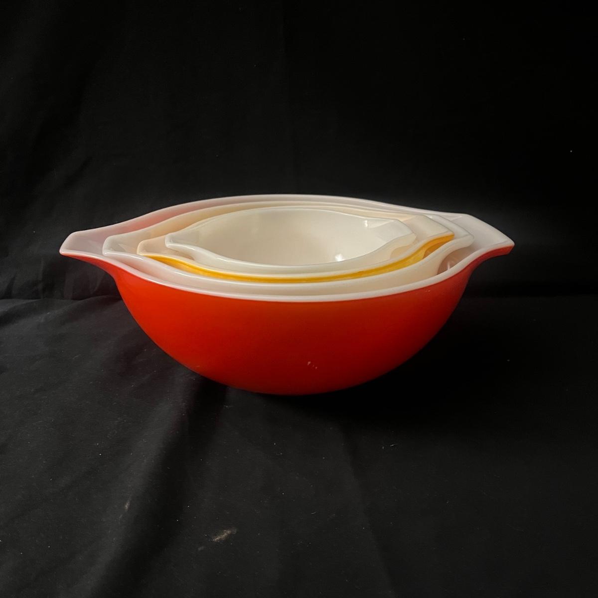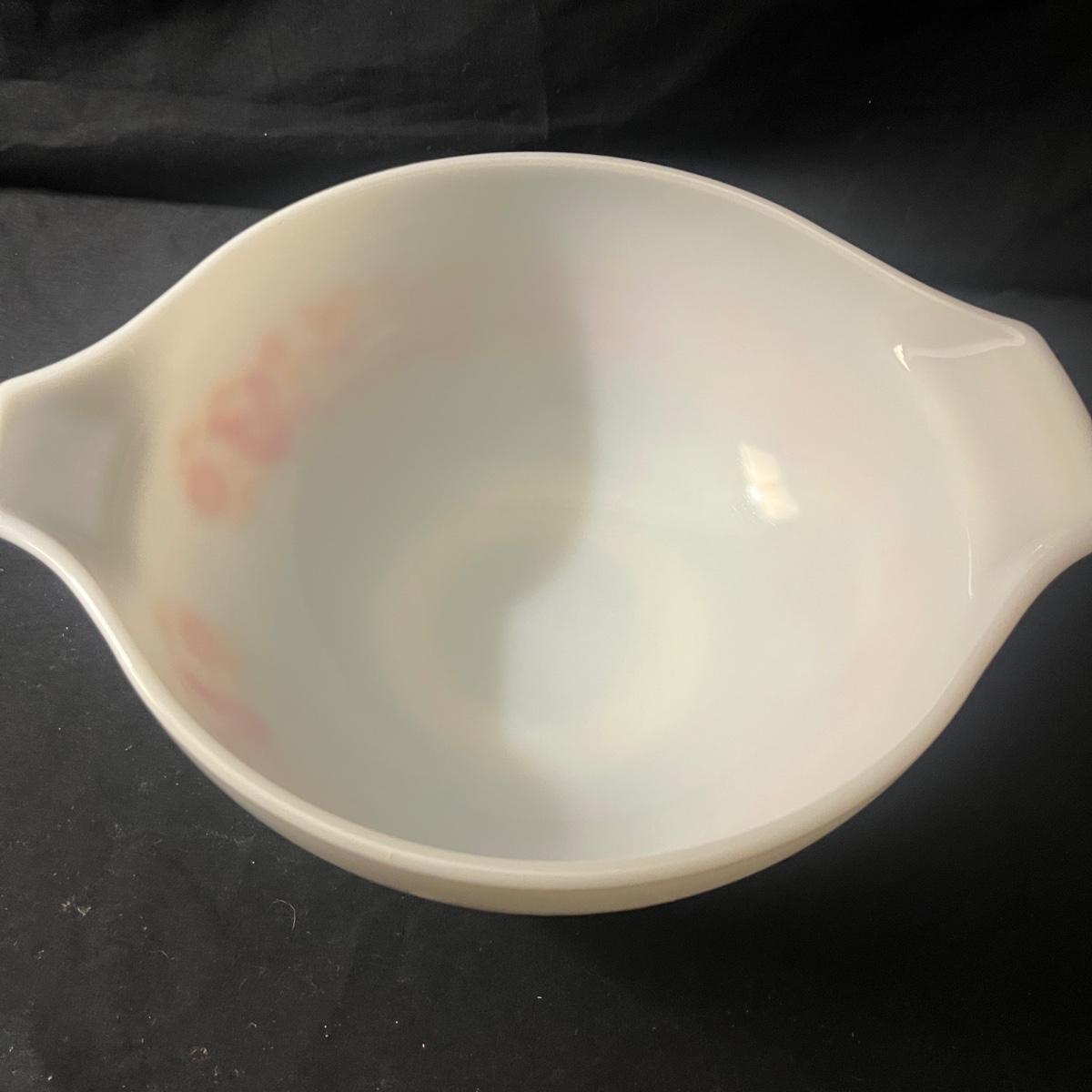 Lot includes one Blue Tulip patter oval Pyrex dish with lid, one Friendship pattern Pyrex bowl and three more Pyrex bowls with one solid and one pattern bowl very faded, see pictures. Largest bowl measures 13” x 10.5” x 4.5”H.