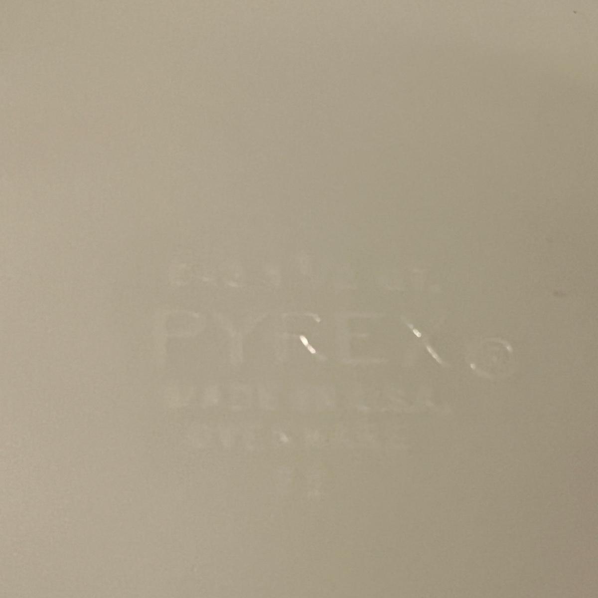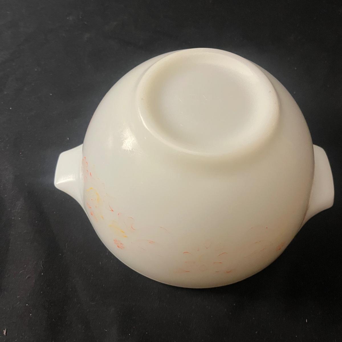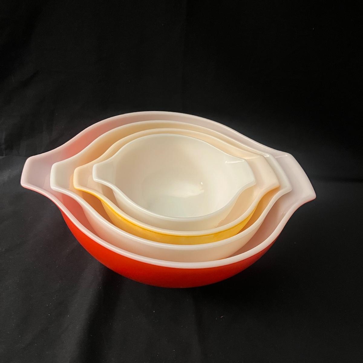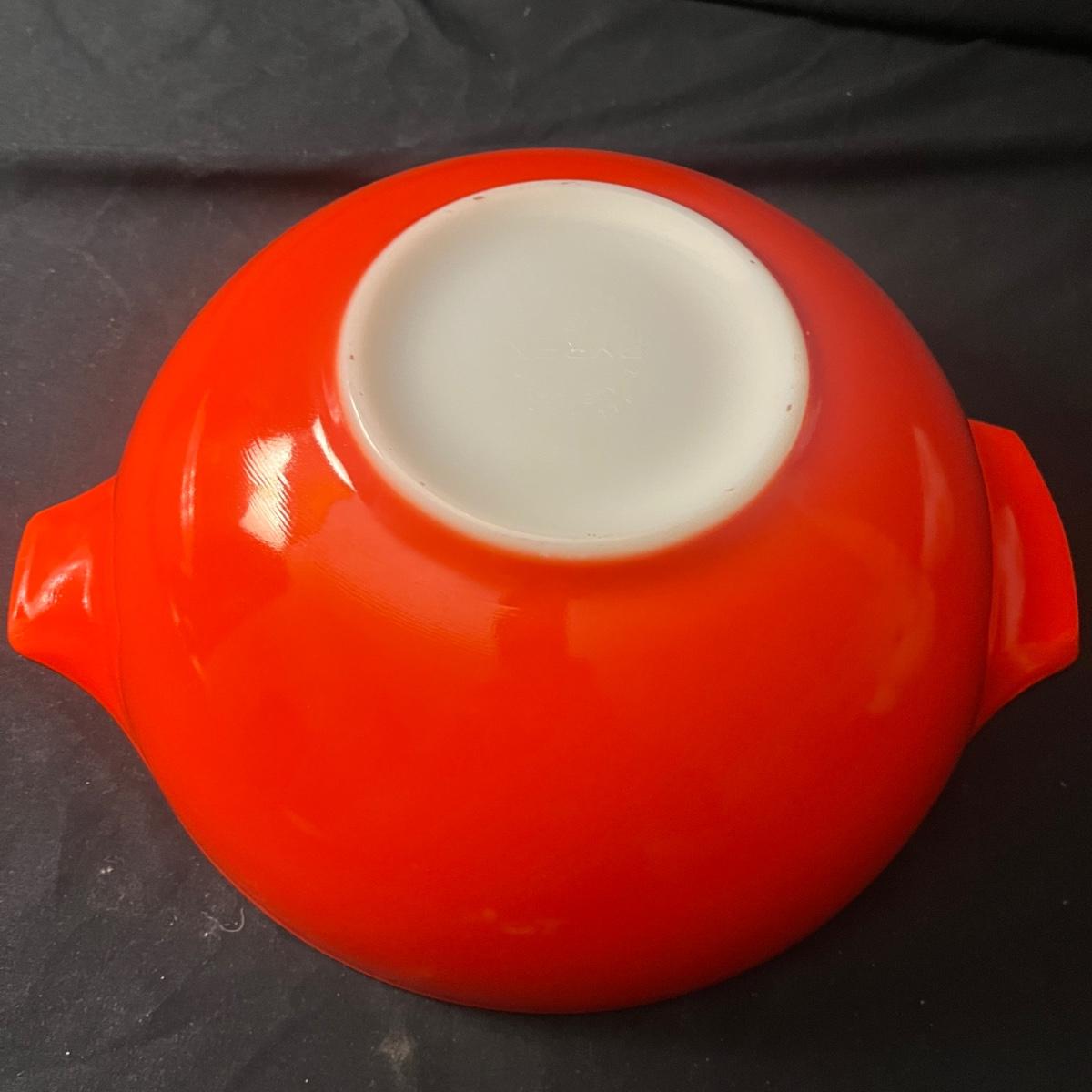 Lot includes one Blue Tulip patter oval Pyrex dish with lid, one Friendship pattern Pyrex bowl and three more Pyrex bowls with one solid and one pattern bowl very faded, see pictures. Largest bowl measures 13” x 10.5” x 4.5”H.