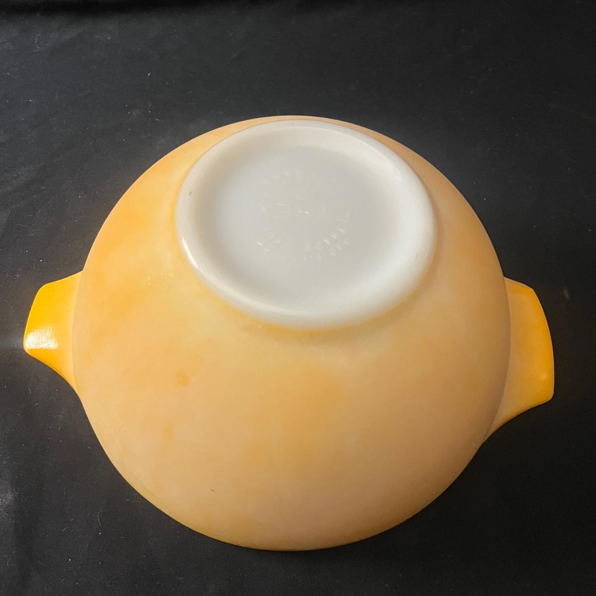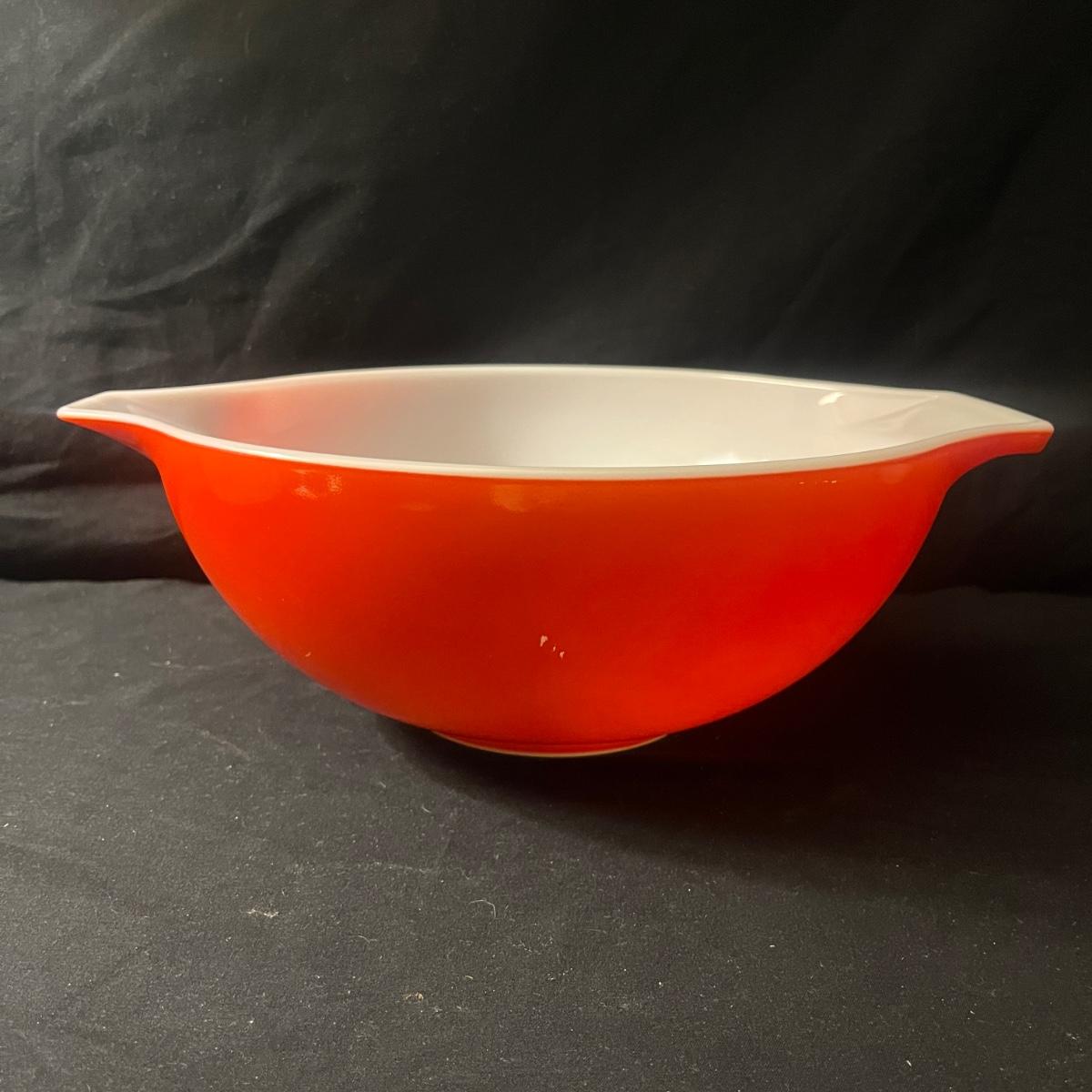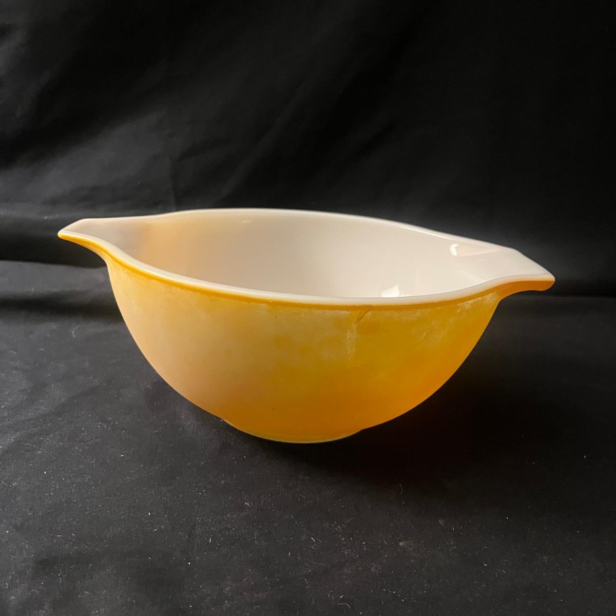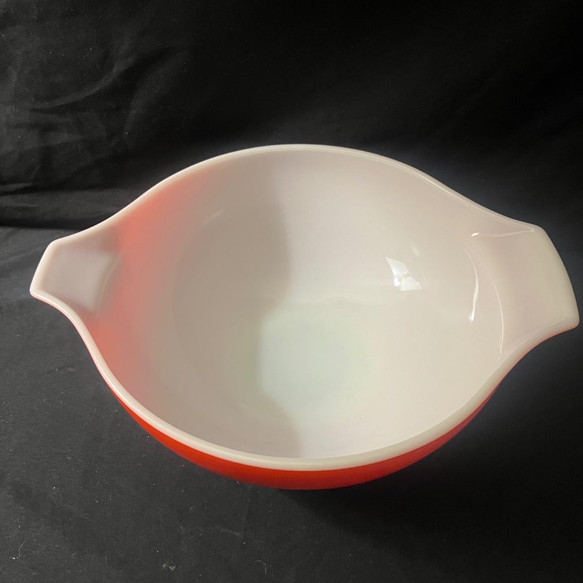 Lot includes one Blue Tulip patter oval Pyrex dish with lid, one Friendship pattern Pyrex bowl and three more Pyrex bowls with one solid and one pattern bowl very faded, see pictures. Largest bowl measures 13” x 10.5” x 4.5”H.