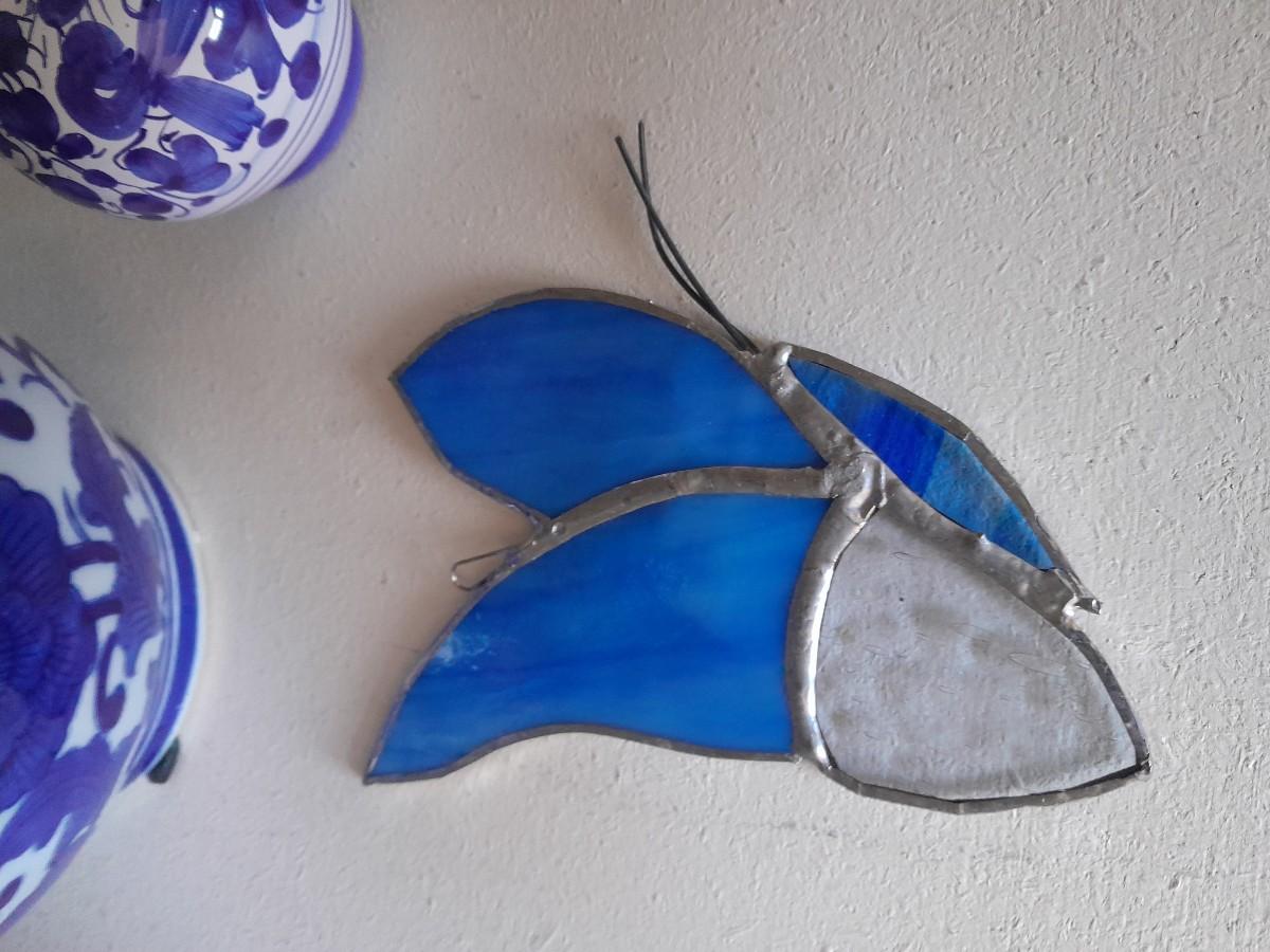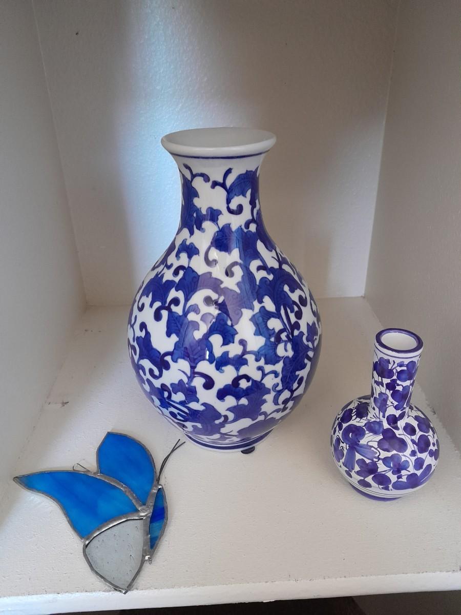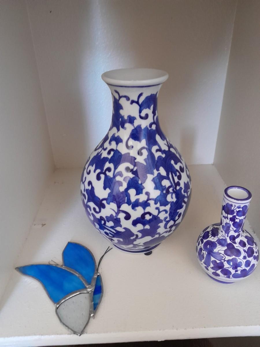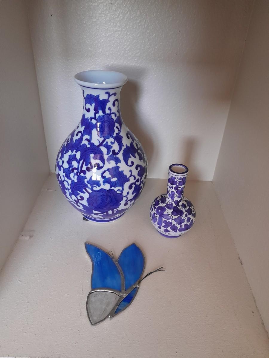BLUE AND WHITE VASES WITH A STAINED GLASS BUTTERFLY