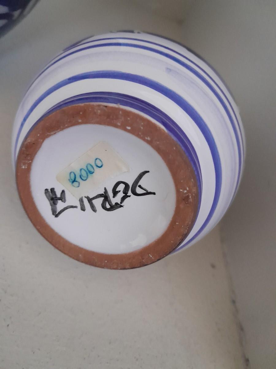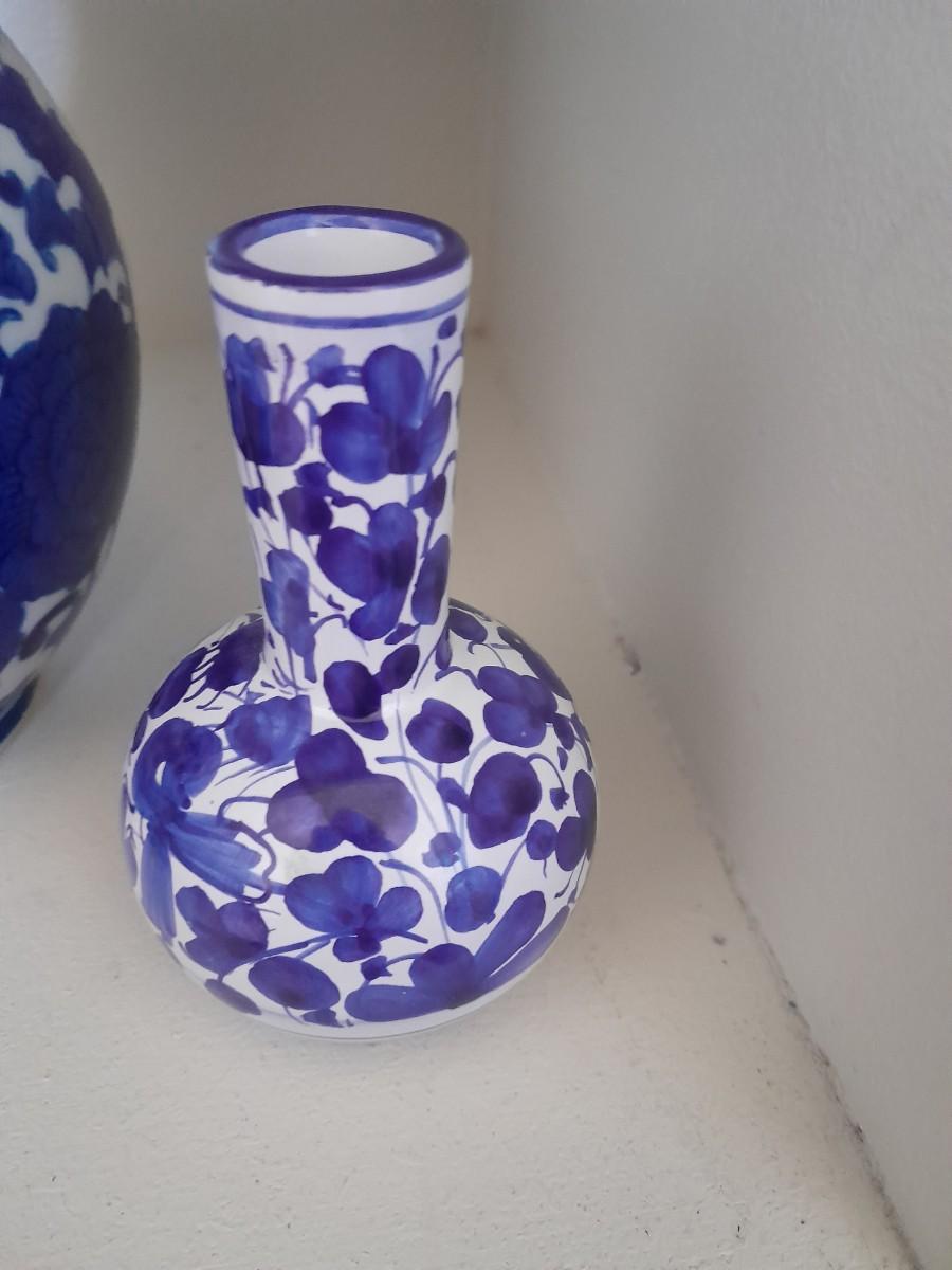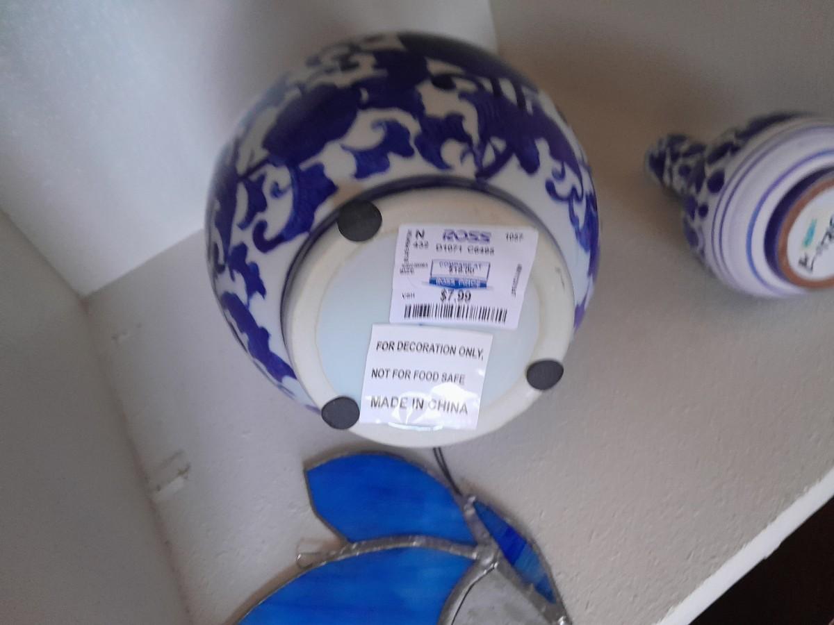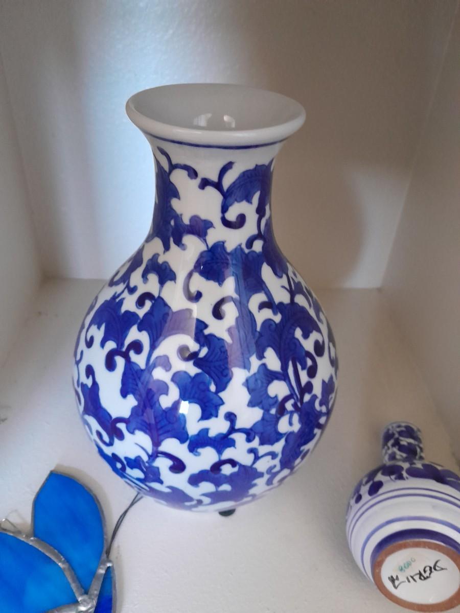 BLUE AND WHITE VASES WITH A STAINED GLASS BUTTERFLY