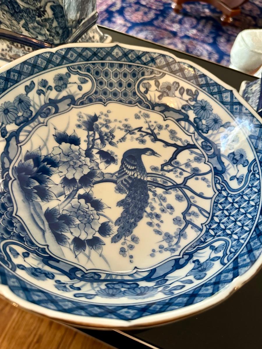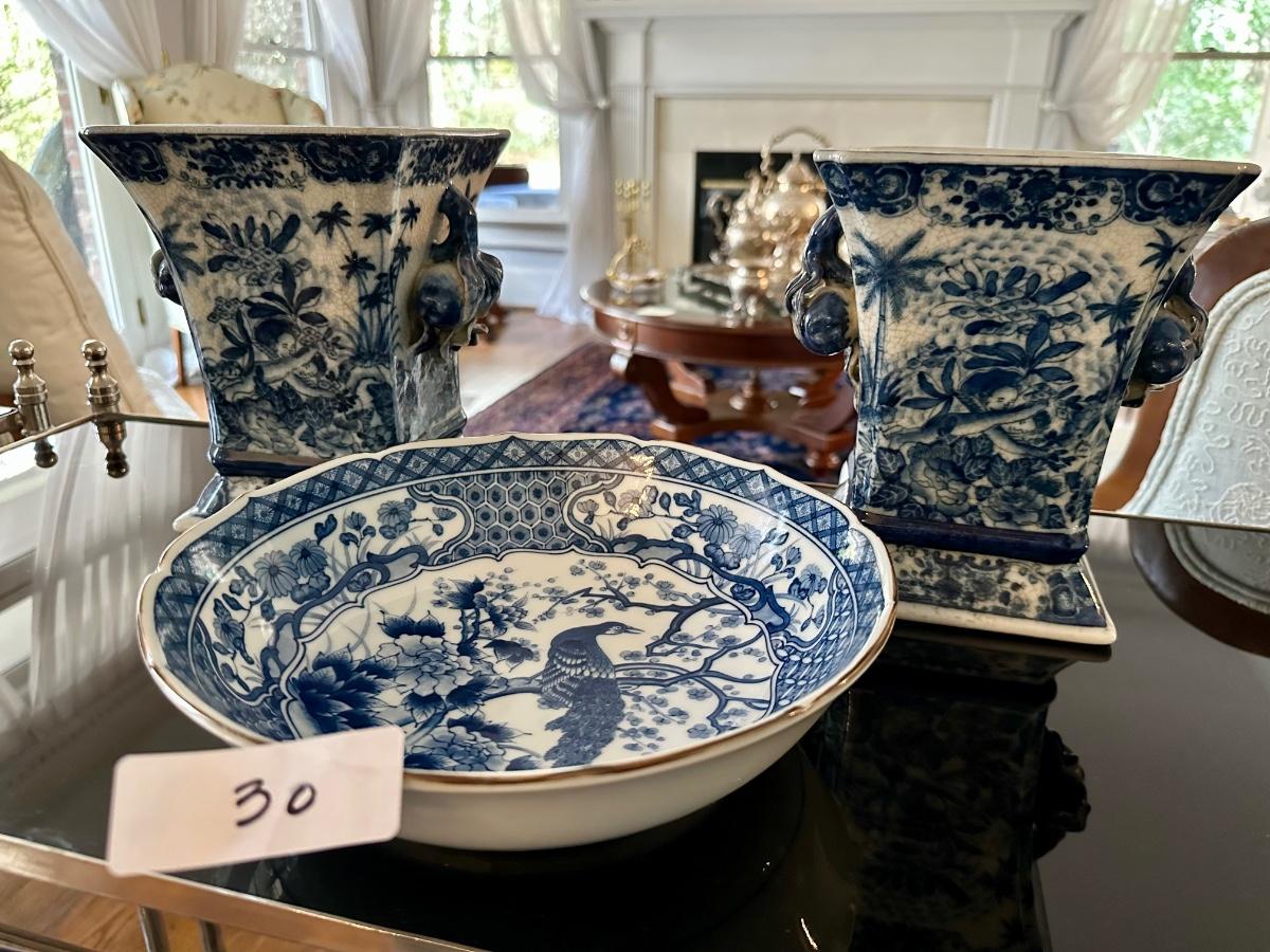 LUE WHITE PEACOCK BOWL JAPAN, PAIR OF CHINESE VASES