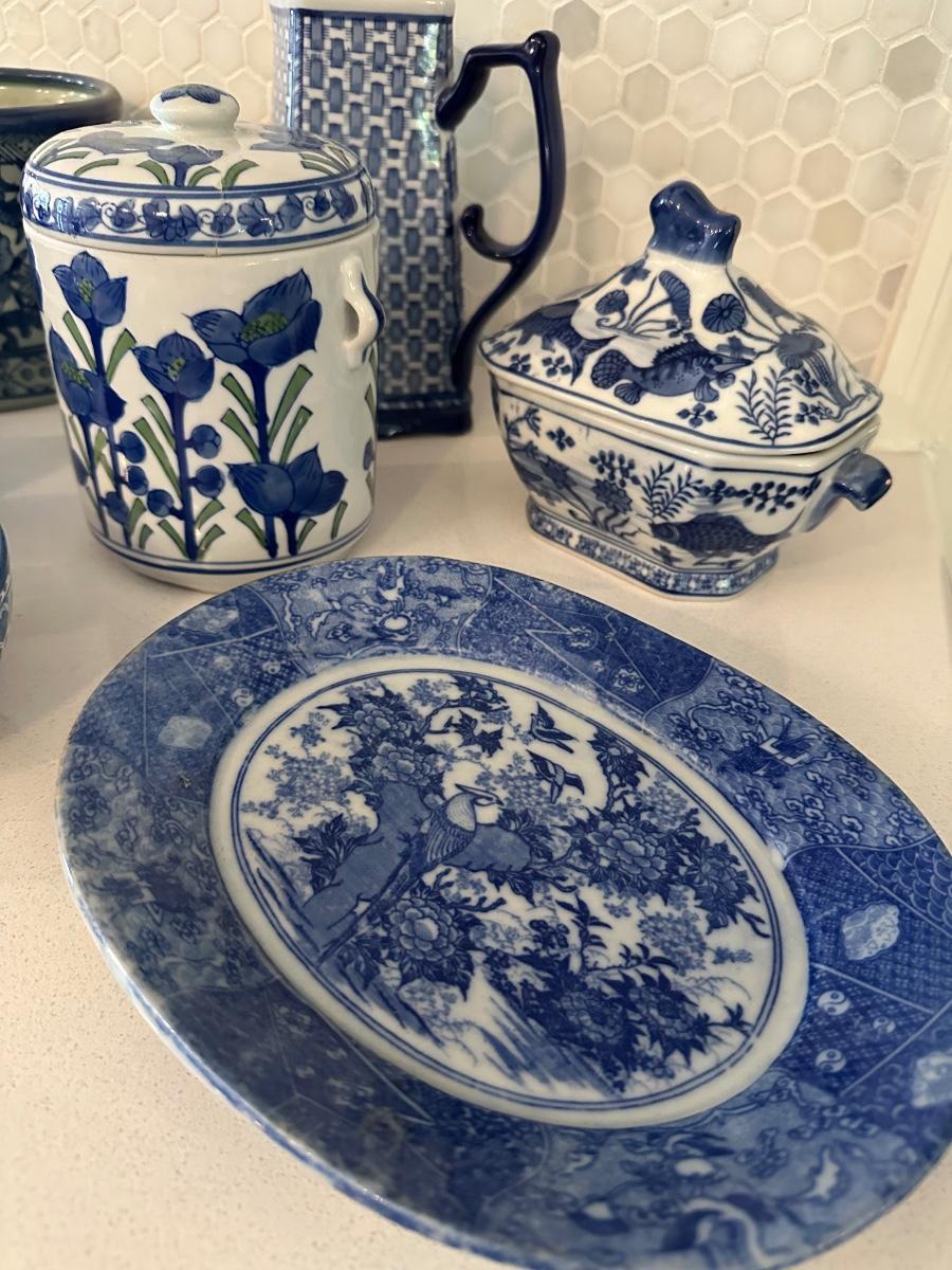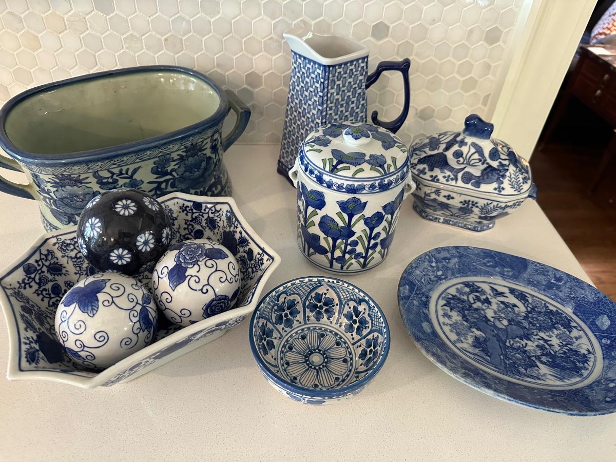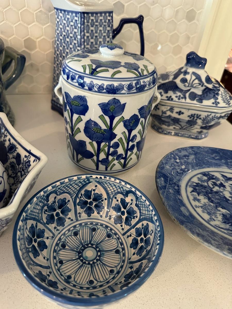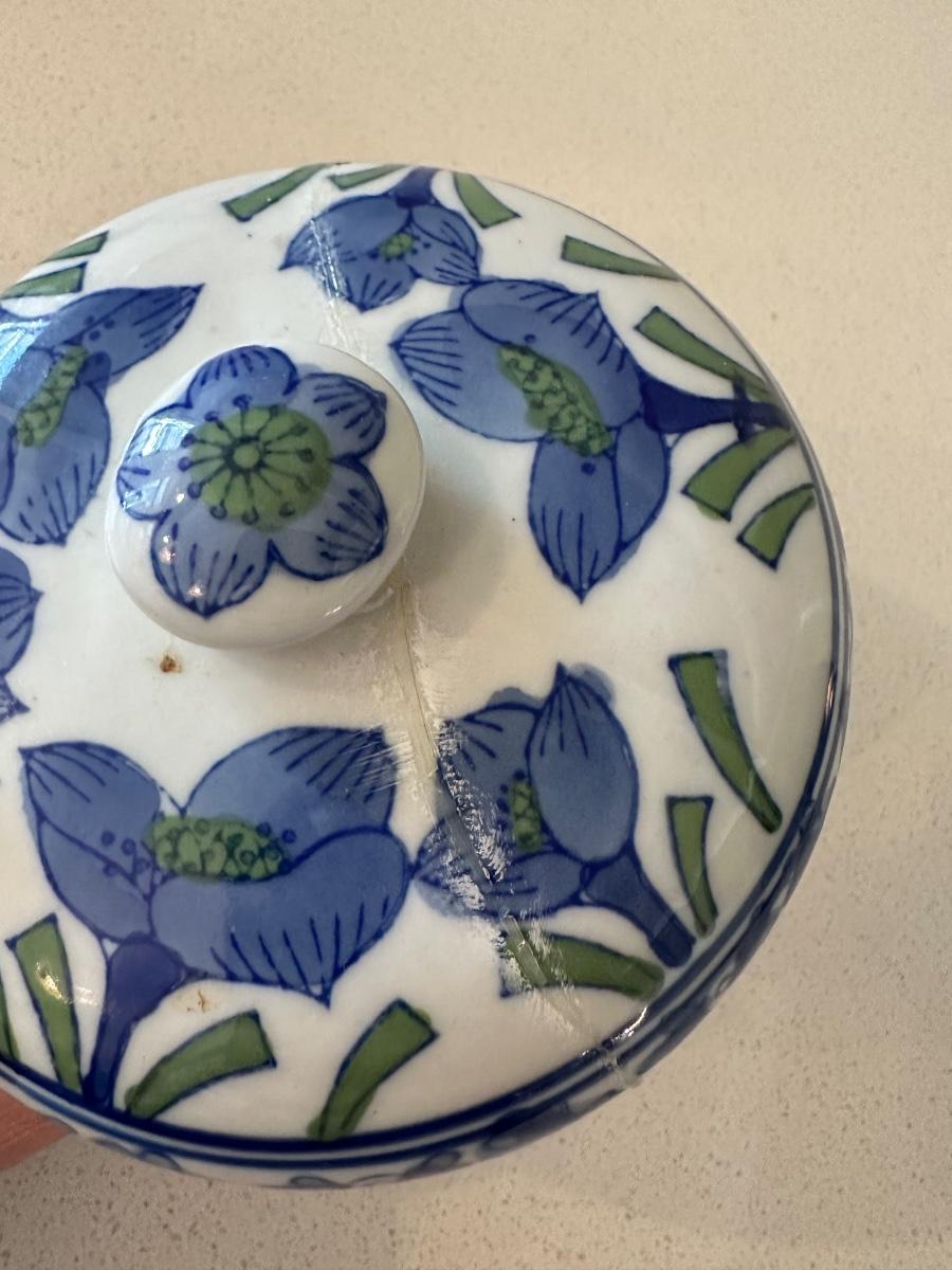BLUE WHITE HOME DÉCOR AS PICTURED ONE LID HAS BEEN REPAIRED