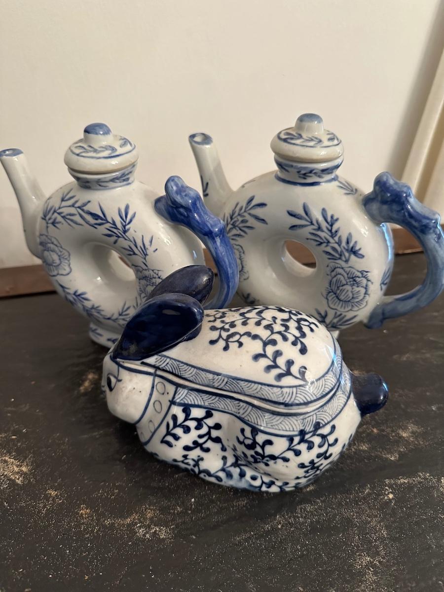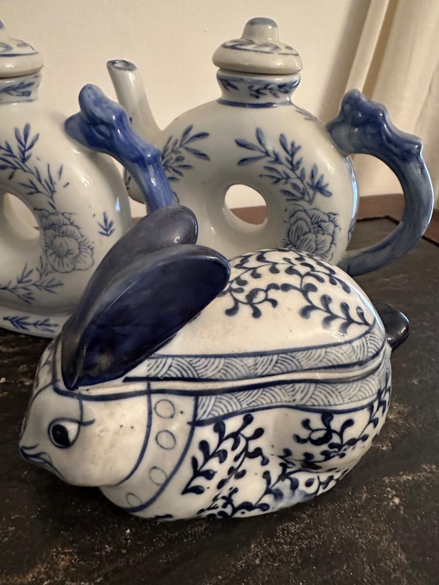 PAIR OF PITCHERS, BUNNY TRINKET BOX AS PICTURED